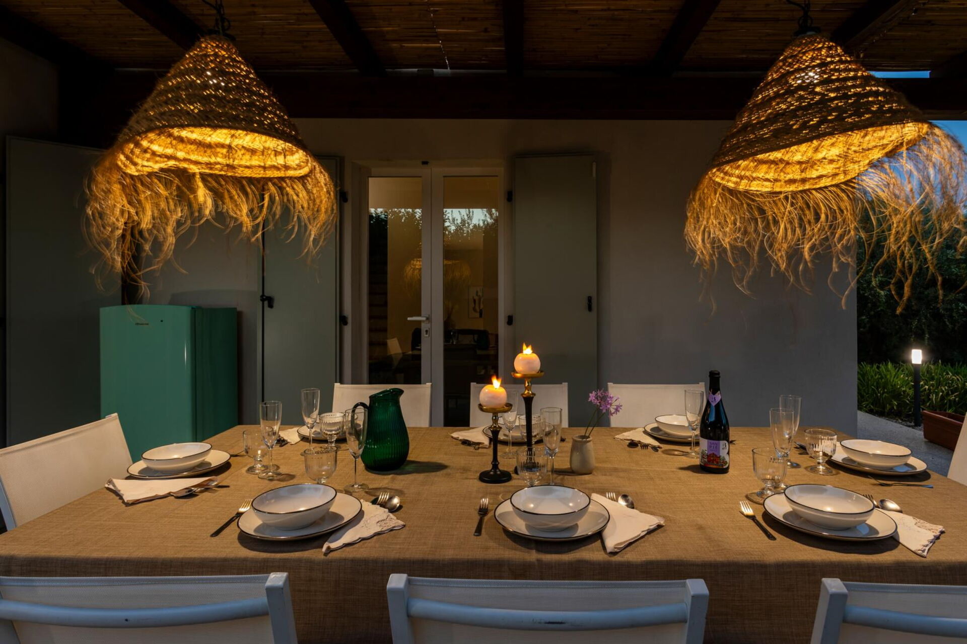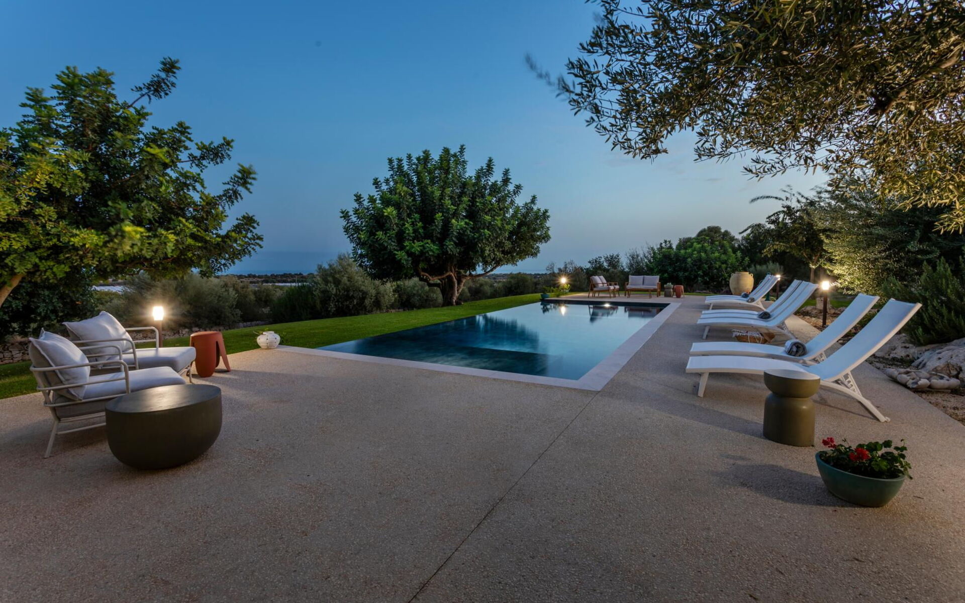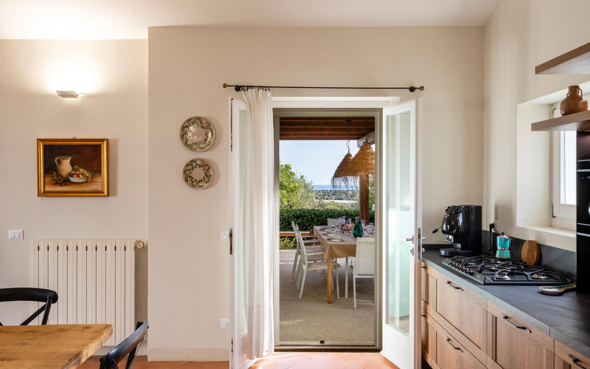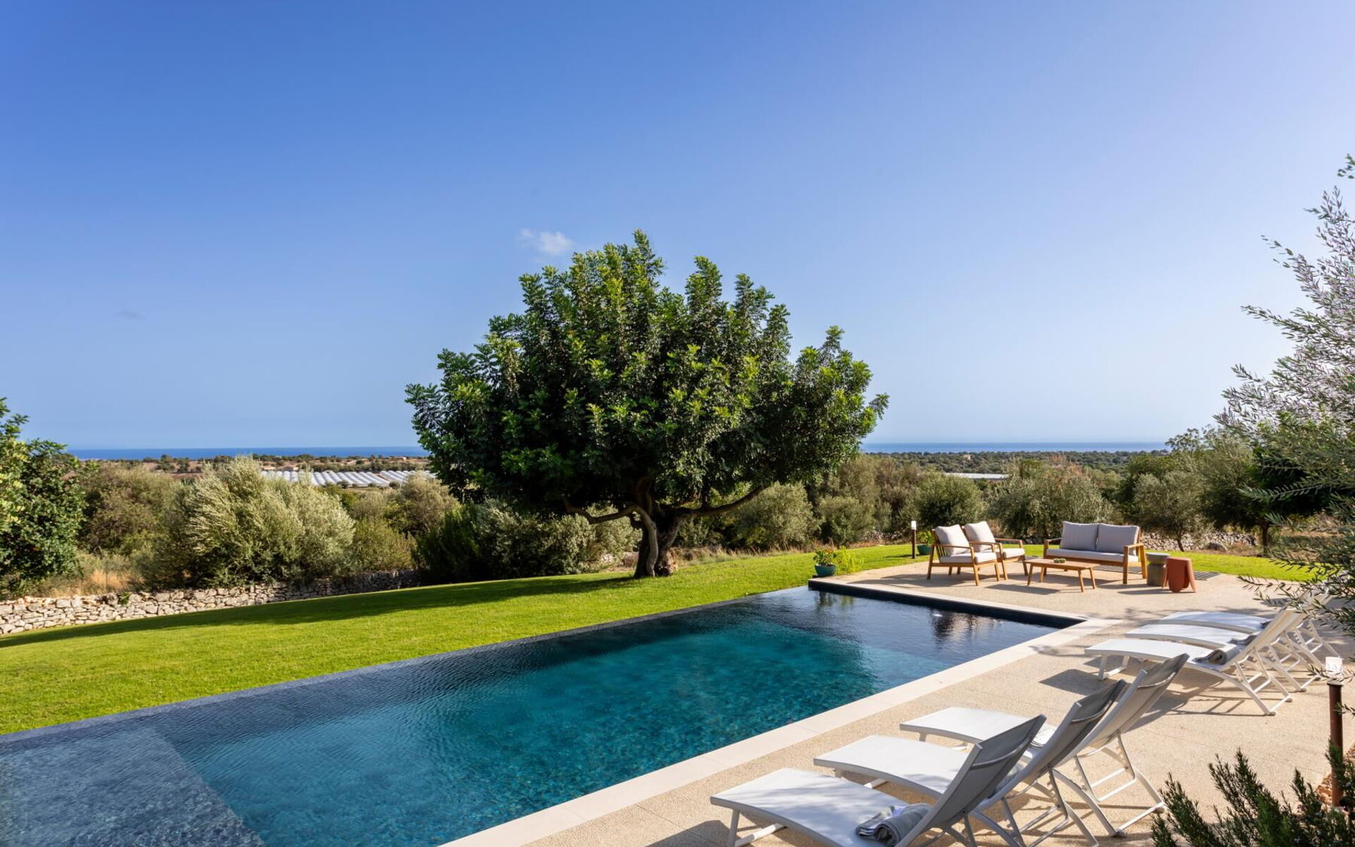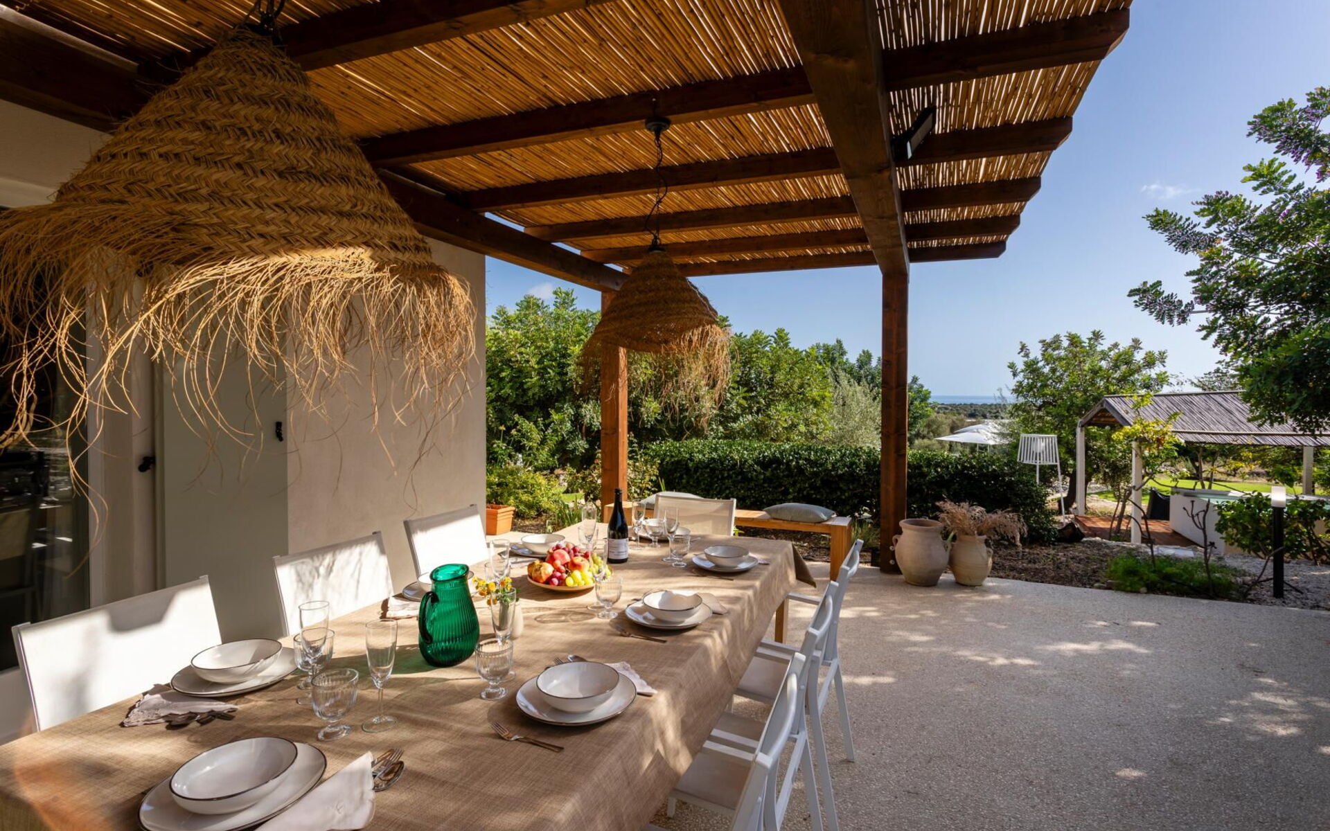 The villa overlooks an enchanting garden with a stunning private swimming pool (12x5m), a jacuzzi and olive and citrus trees. The exterior is furnished with sun loungers and umbrellas, while an outdoor dining area, directly connected to the kitchen, offers views of the garden, the pool and the sea in the distance.