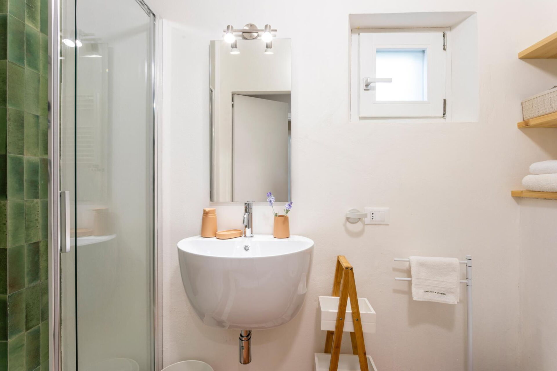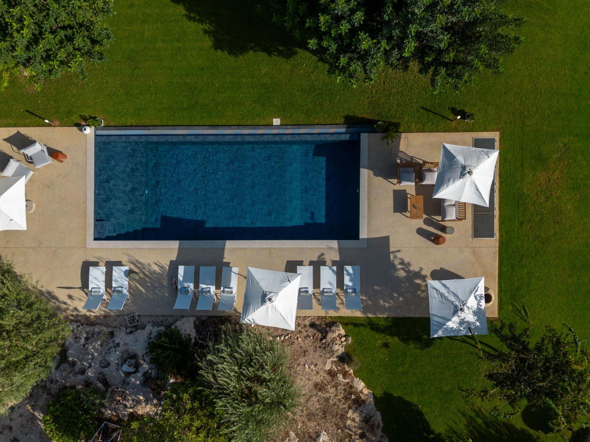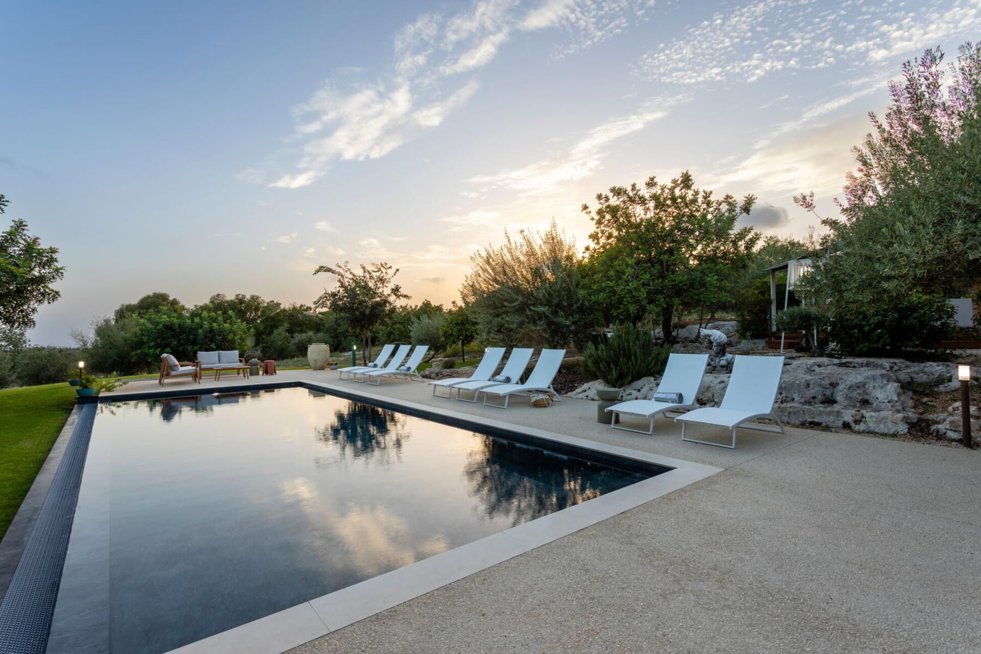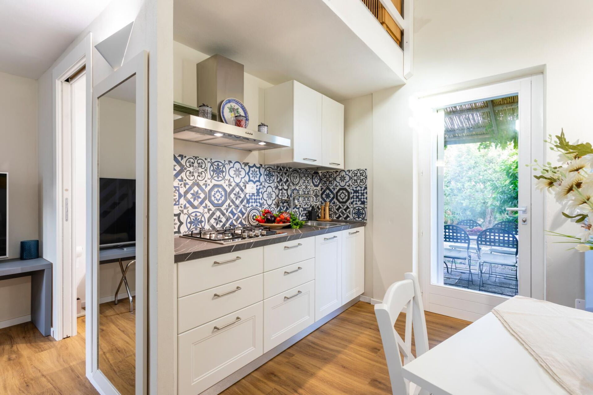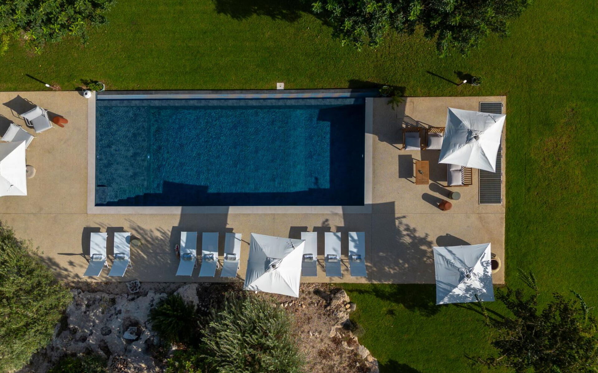 The villa overlooks an enchanting garden with a stunning private swimming pool (12x5m), a jacuzzi and olive and citrus trees. The exterior is furnished with sun loungers and umbrellas, while an outdoor dining area, directly connected to the kitchen, offers views of the garden, the pool and the sea in the distance.
