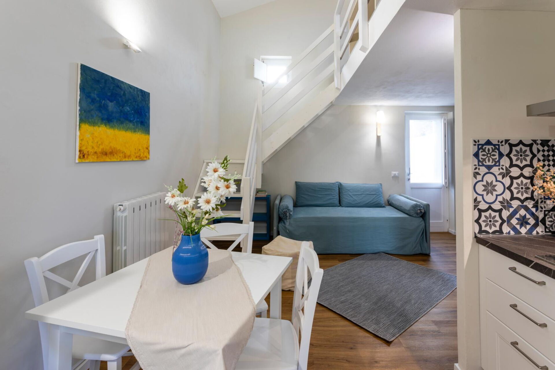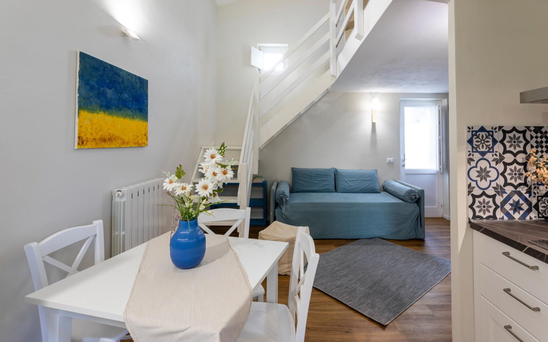 The annex has an entrance onto a small living room with kitchenette and sofa bed, while a wooden staircase leads to the mezzanine, with a double bed and a single bed.