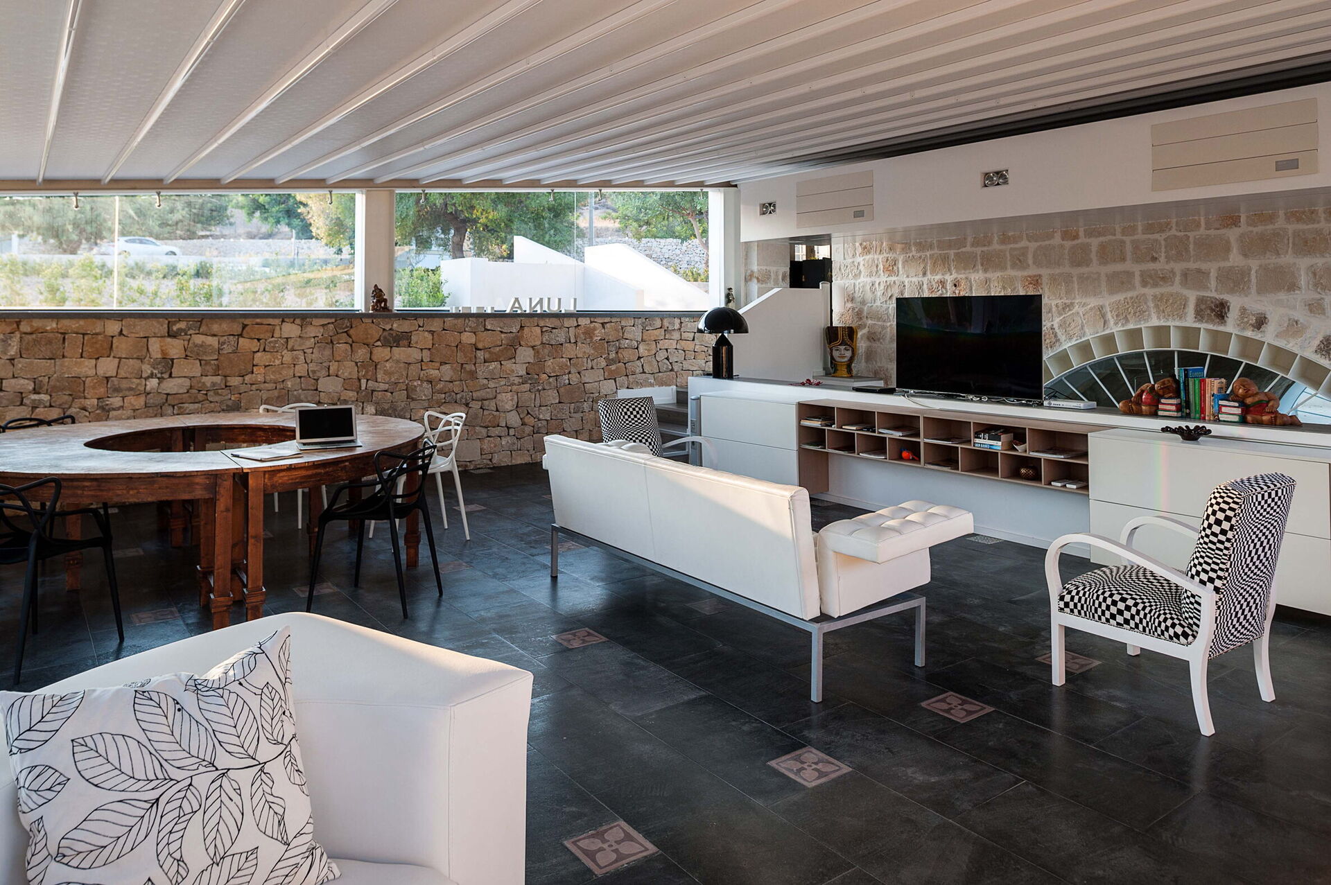 Salon: deux canapés (personnes: 8), deux fauteuils, table à manger (personnes: 6), internet WIFI, internet, climatisation, tv satellitaire, sortie sur la terrasse.