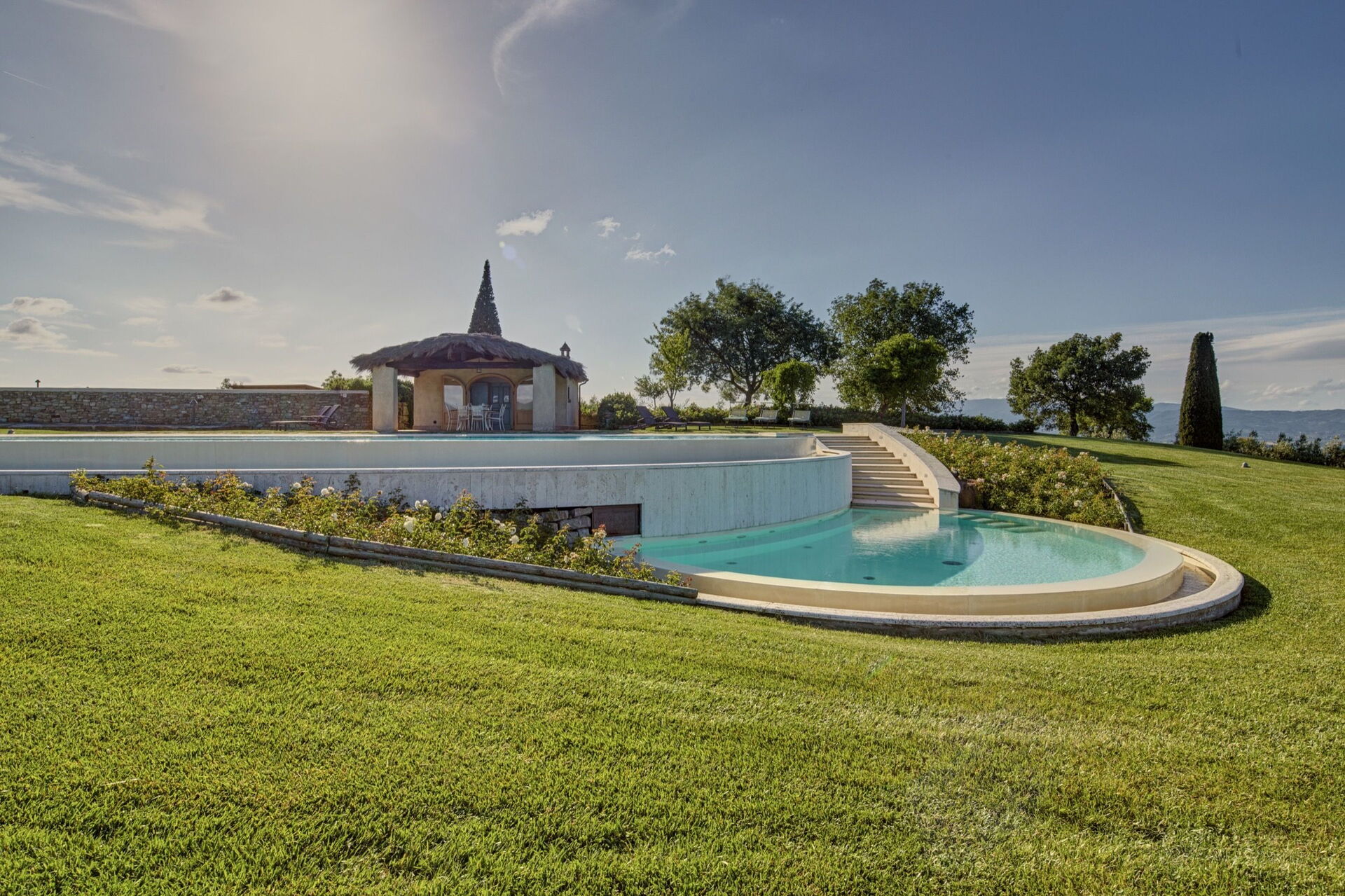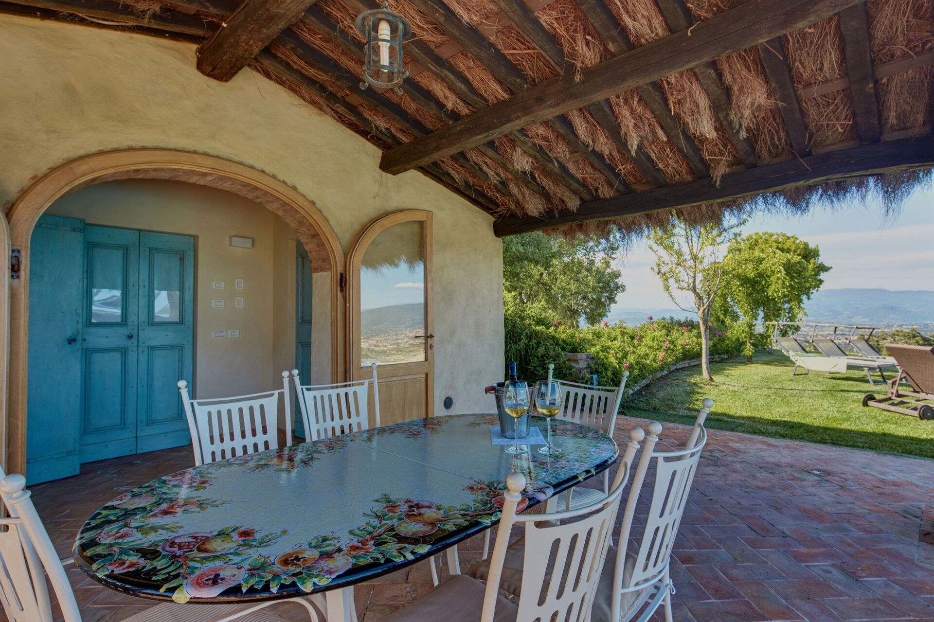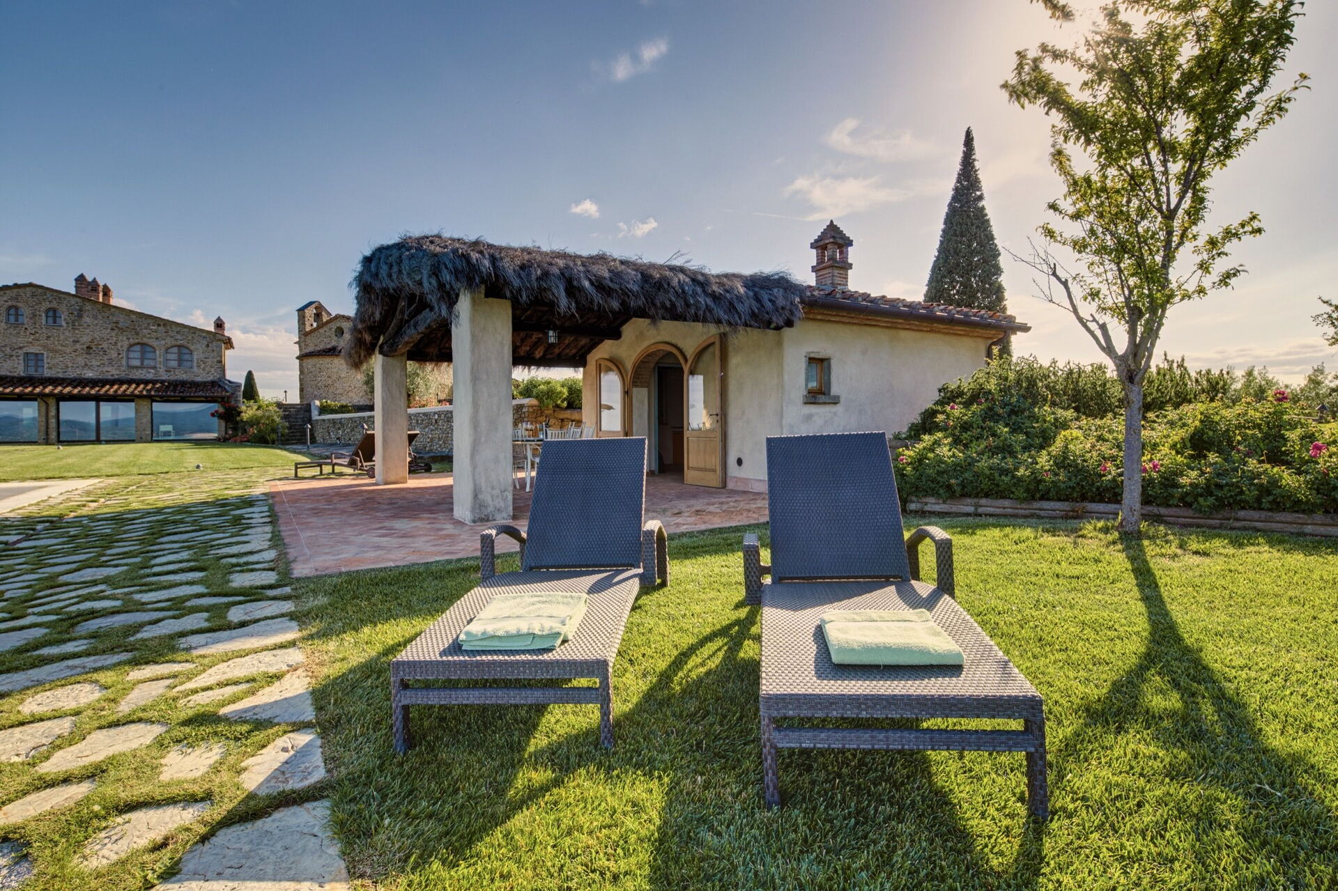 Belle villa née de la restructuration d’un petit groupe de maisons situées au sommet d’une des collines qui dominent la Valdichiana et la ville d’Arezzo. Dans la propriété (complètement clôturée) on trouve également la maison des propriétaires et une petite église du VIIème siècle. Grand jardin bien entretenu avec magnifique piscine privée en position panoramique. Chiaravalle, presentée comme villa individuelle, est divisée en 4 appartements reliés de l’intérieur. L’ameublement est confortable et de goût. Au rez-de-chaussée, une grande terrasse couverte équipée idéale pour les repas.