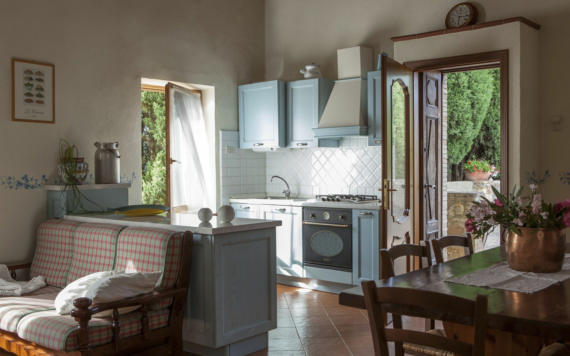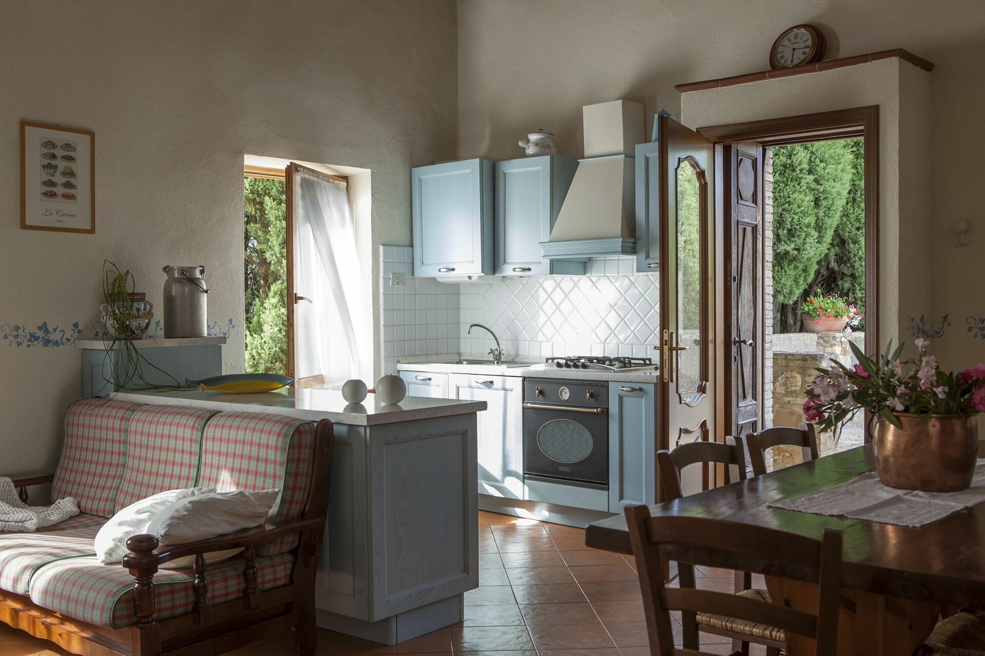 cuisine: cuisine bien équipée, table à manger, lave-vaisselle, réfrigérateur, congélateur, four micro-onde, cuisinière, four, machine à café italienne.