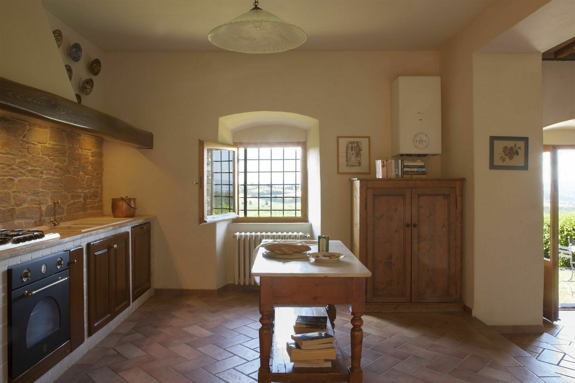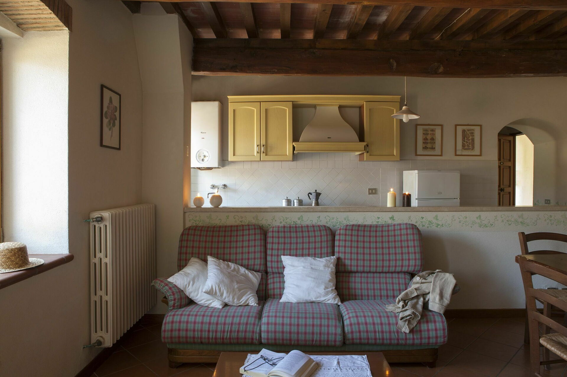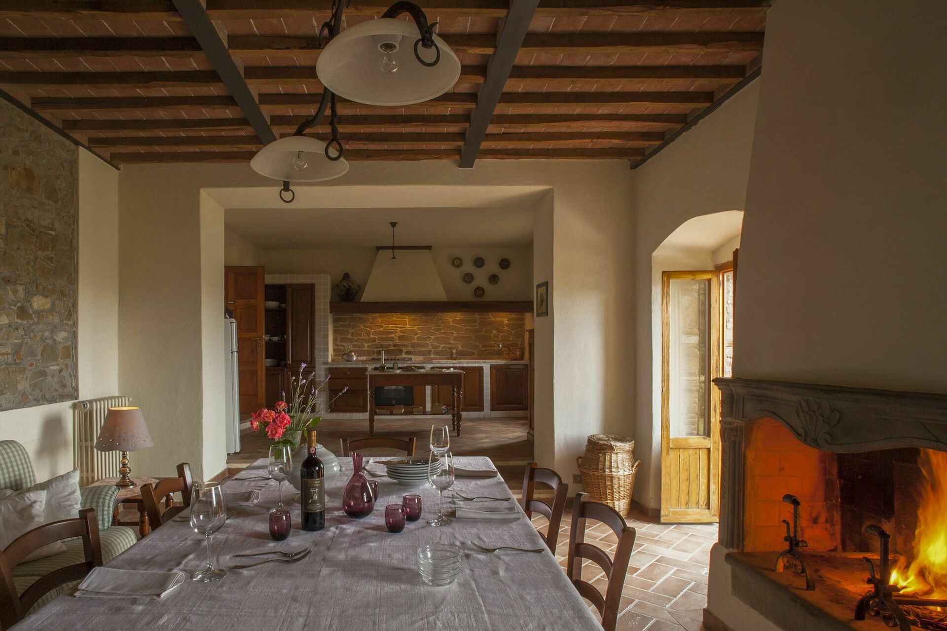 Cuisine – salle de séjour: table à manger (personnes: 4), lave-vaisselle, cuisinière, four, machine à café italienne, canapé, fauteuil, cheminée.