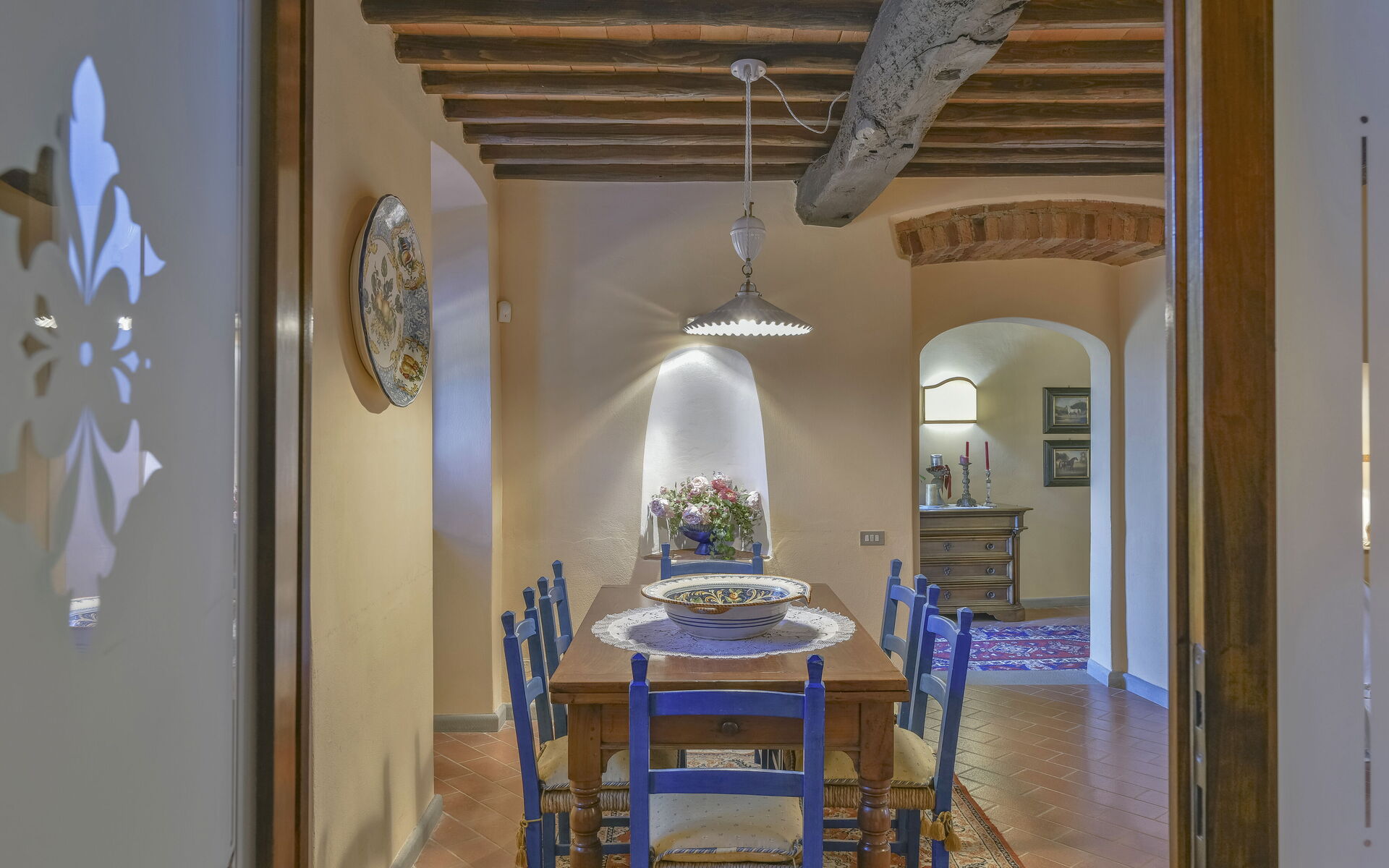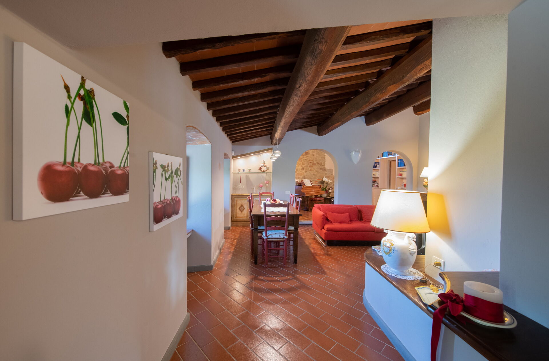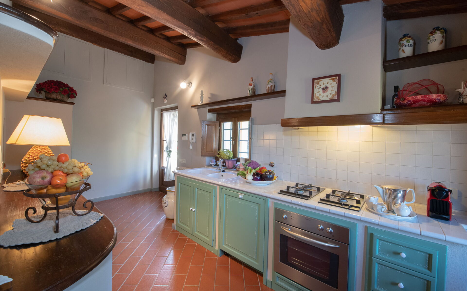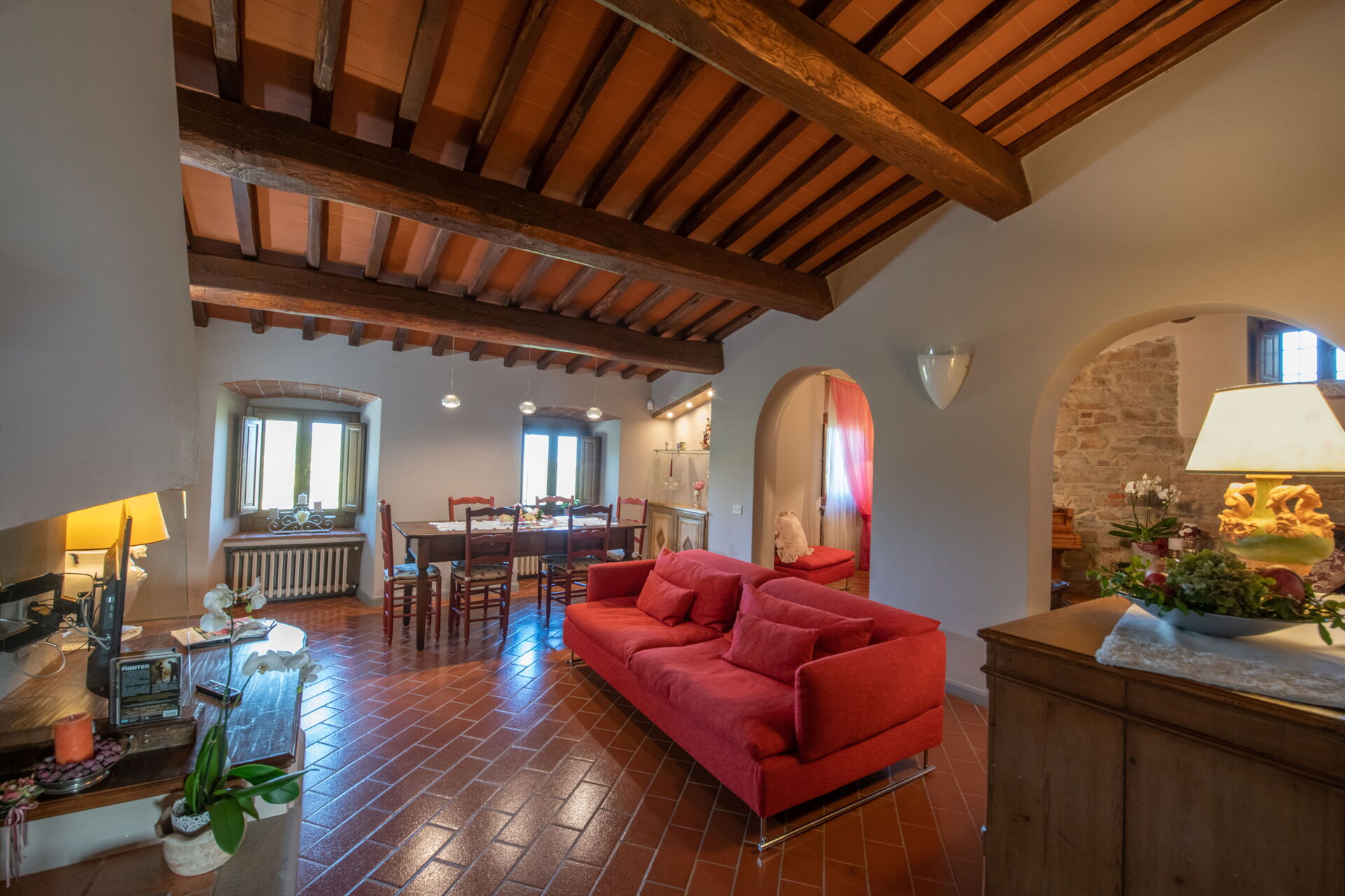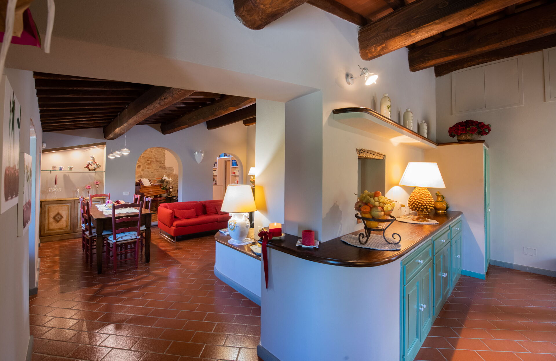 à l'arrivée à Brunella vous trouverez une jolie propriété, propre et bien entretenue, avec vue sur les collines idéale pour des relaxantes vacances en Toscane. Pour votre plaisir vous trouverez une piscine privée où vous pouvez vous détendre tout en dégustant une bonne boisson fraîche après une fatigante journée de visites. En plein air vous trouverez également aire de jeu et un barbecue. Dîner avec les amis et la famille est une importante partie de la culture toscane. Profitez de la cuisine pour préparer les repas avec des produits locaux pendant vos vacances. La cuisine comprend machine à café, four micro-onde, grille-pain et réfrigérateur, ainsi que, abondance de vaisselle et couverts pour un maximum de 14 personnes. Dînez «al fresco» comme un vrai toscan, la véranda complètement équipée est le cadre parfait pour apprécier la cuisine, s'amuser en famille, et profiter du jolie beau temps toscan.