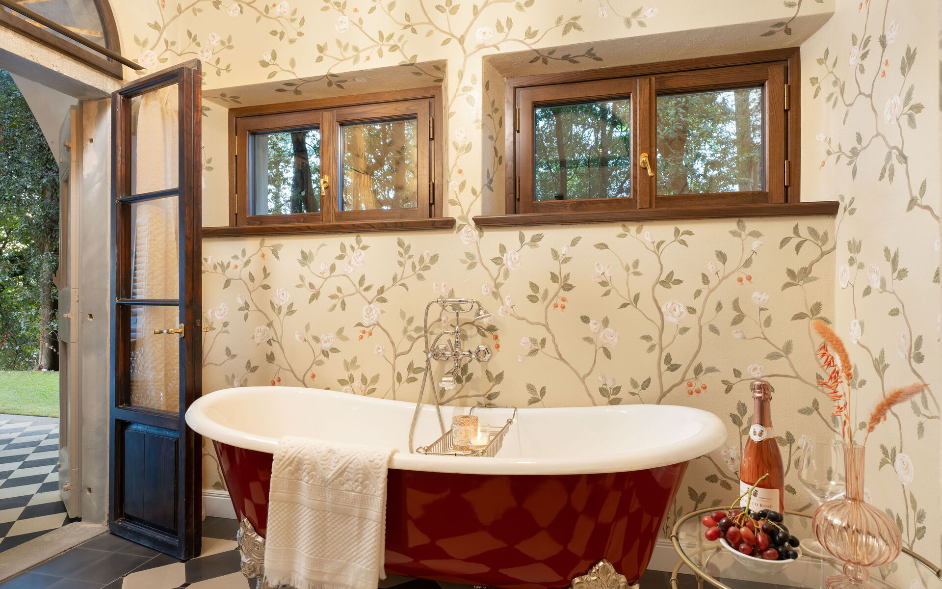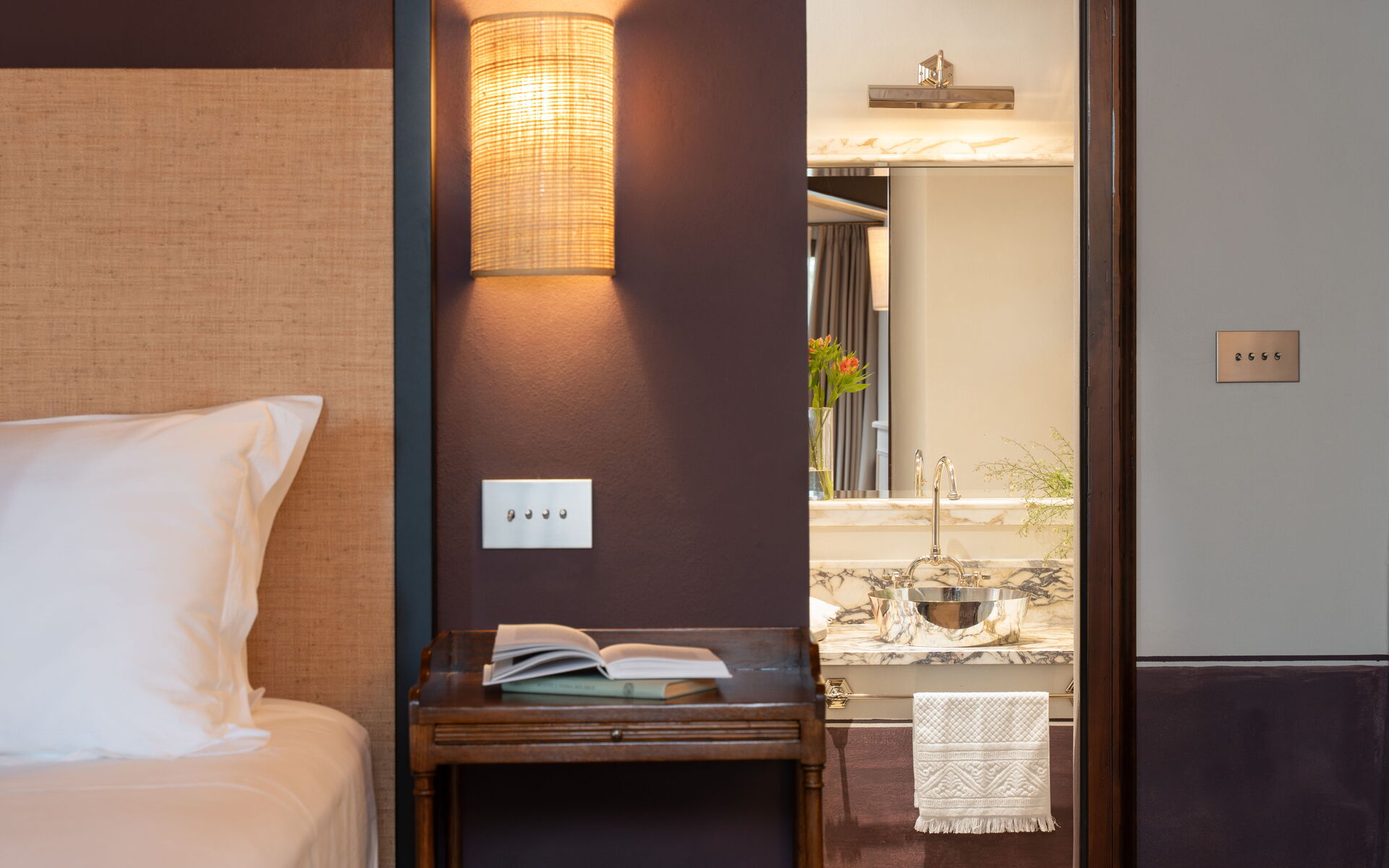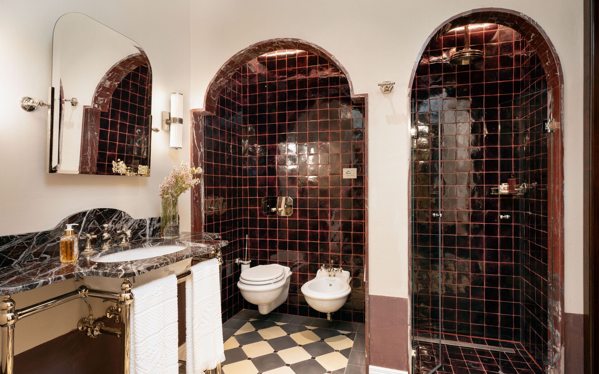 chambre avec salle de bain 1: grand lit à deux places (largeur: 180m, longueur: 200m), internet WIFI, climatisation, bassin, wc, bidet, bagnoire, douche, sèche-cheveux, sortie sur la terrasse, galerie.