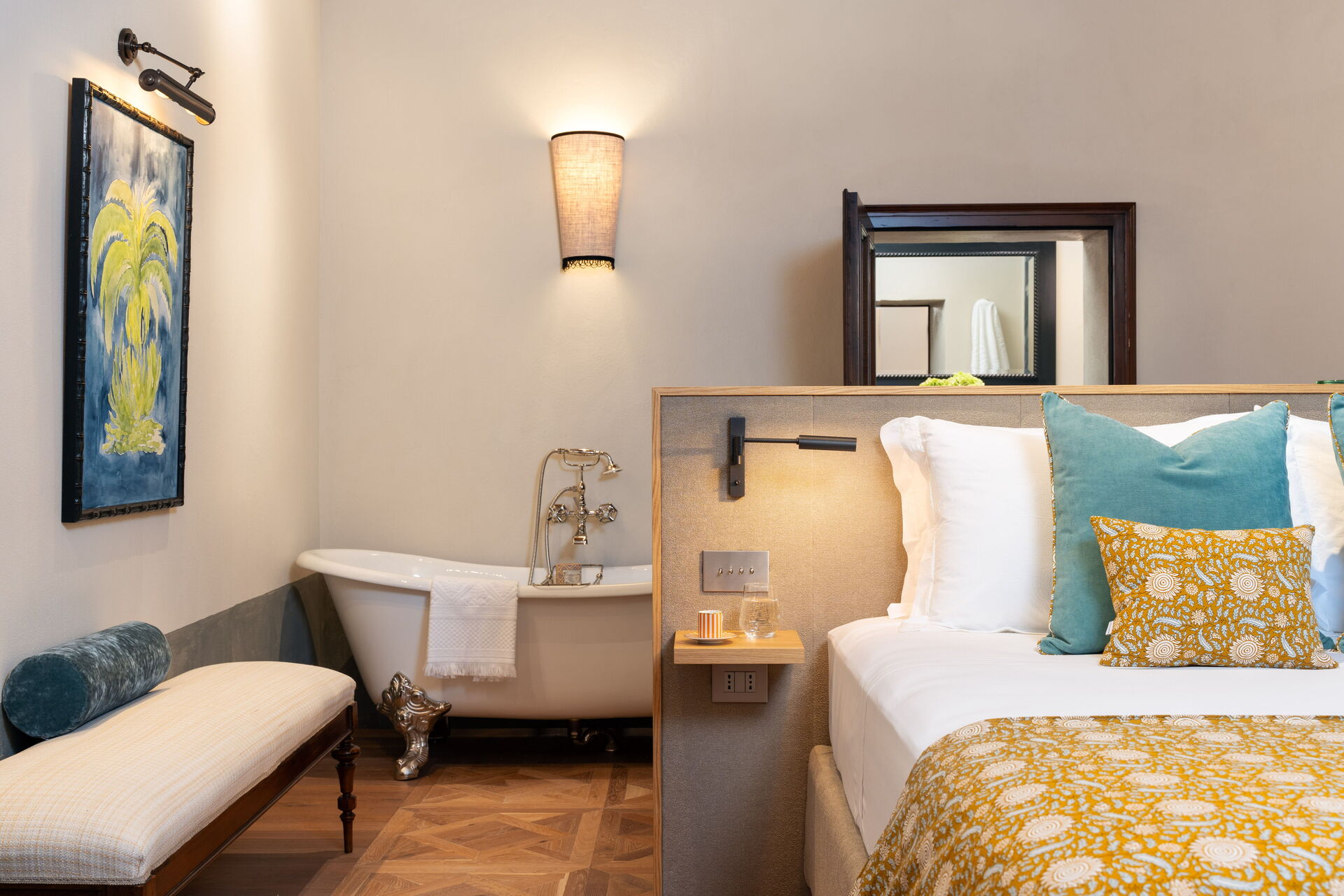 chambre avec salle de bain 4: grand lit à deux places (largeur: 180m, longueur: 200m), internet WIFI, climatisation, bassin, wc, bidet, bagnoire, douche, sèche-cheveux.