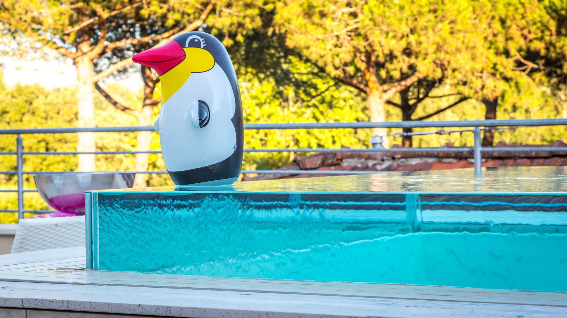 Measuring 3 x 3 meters and is one meter deep, characterized by infinity edge glass.