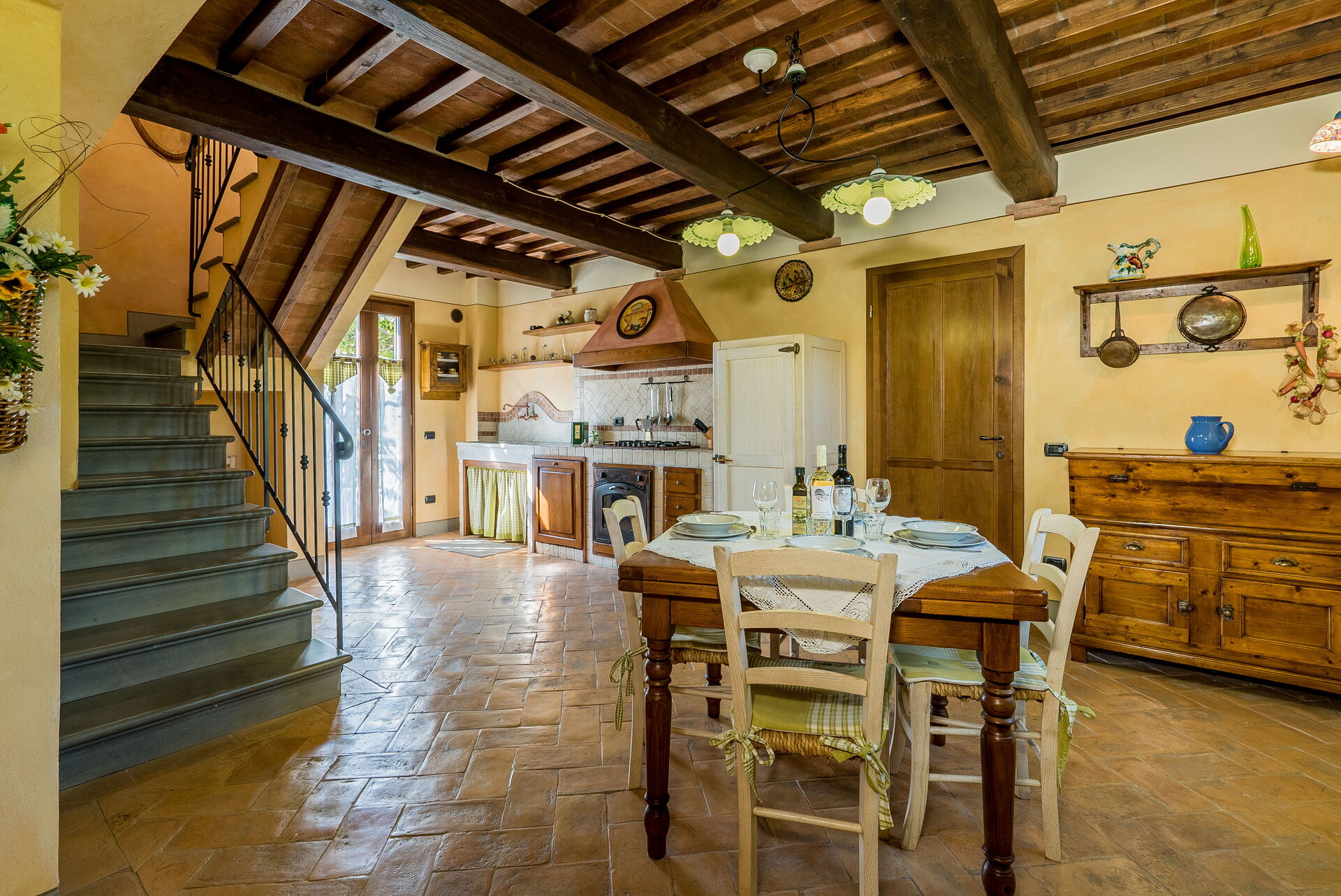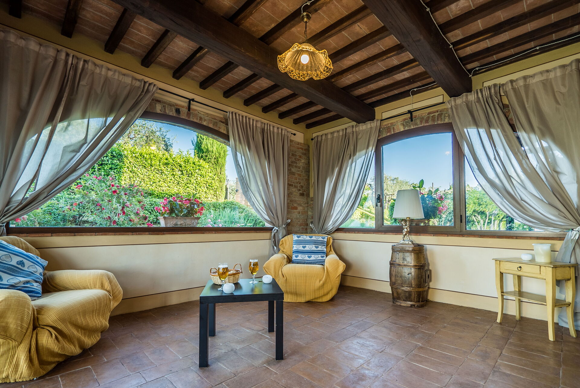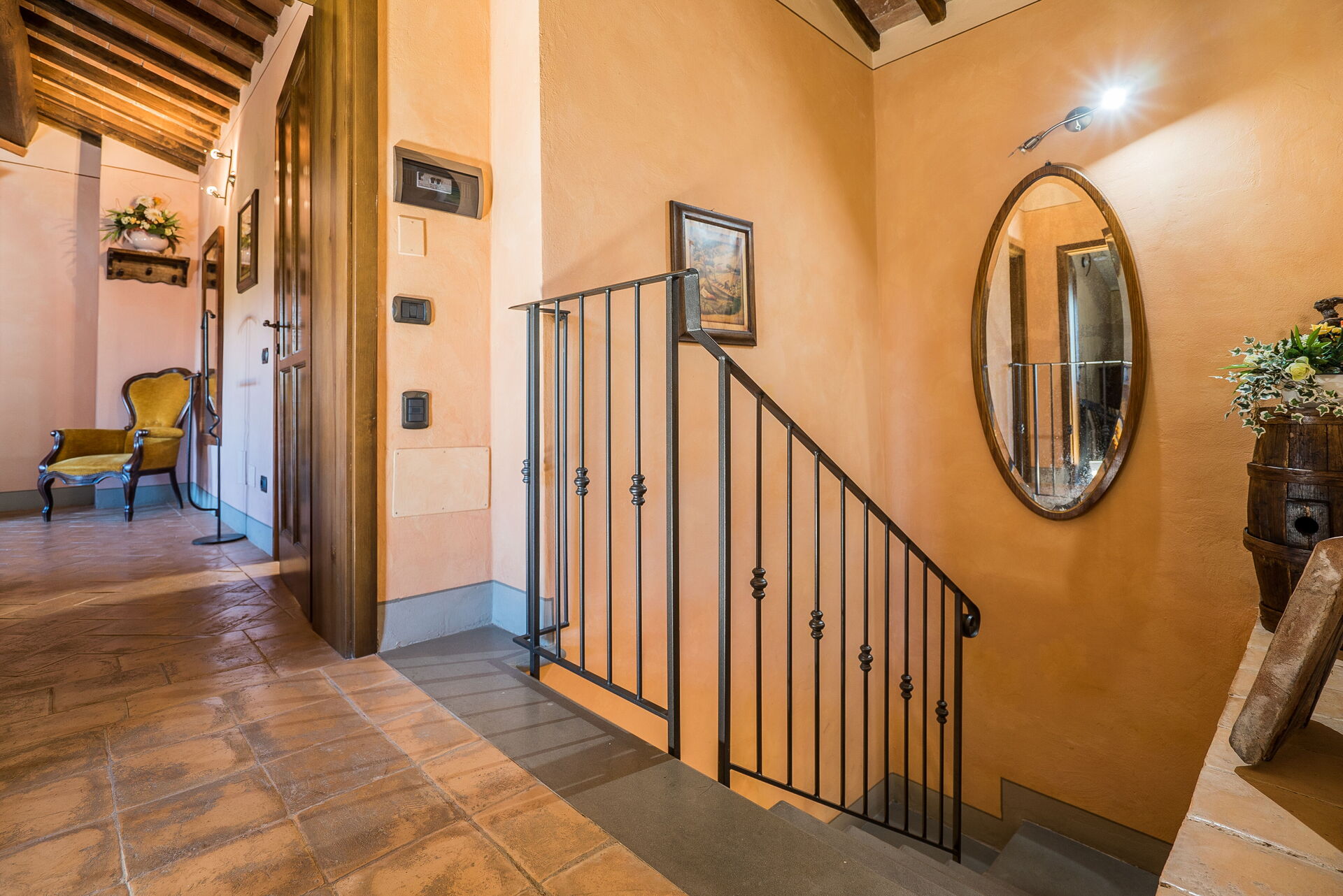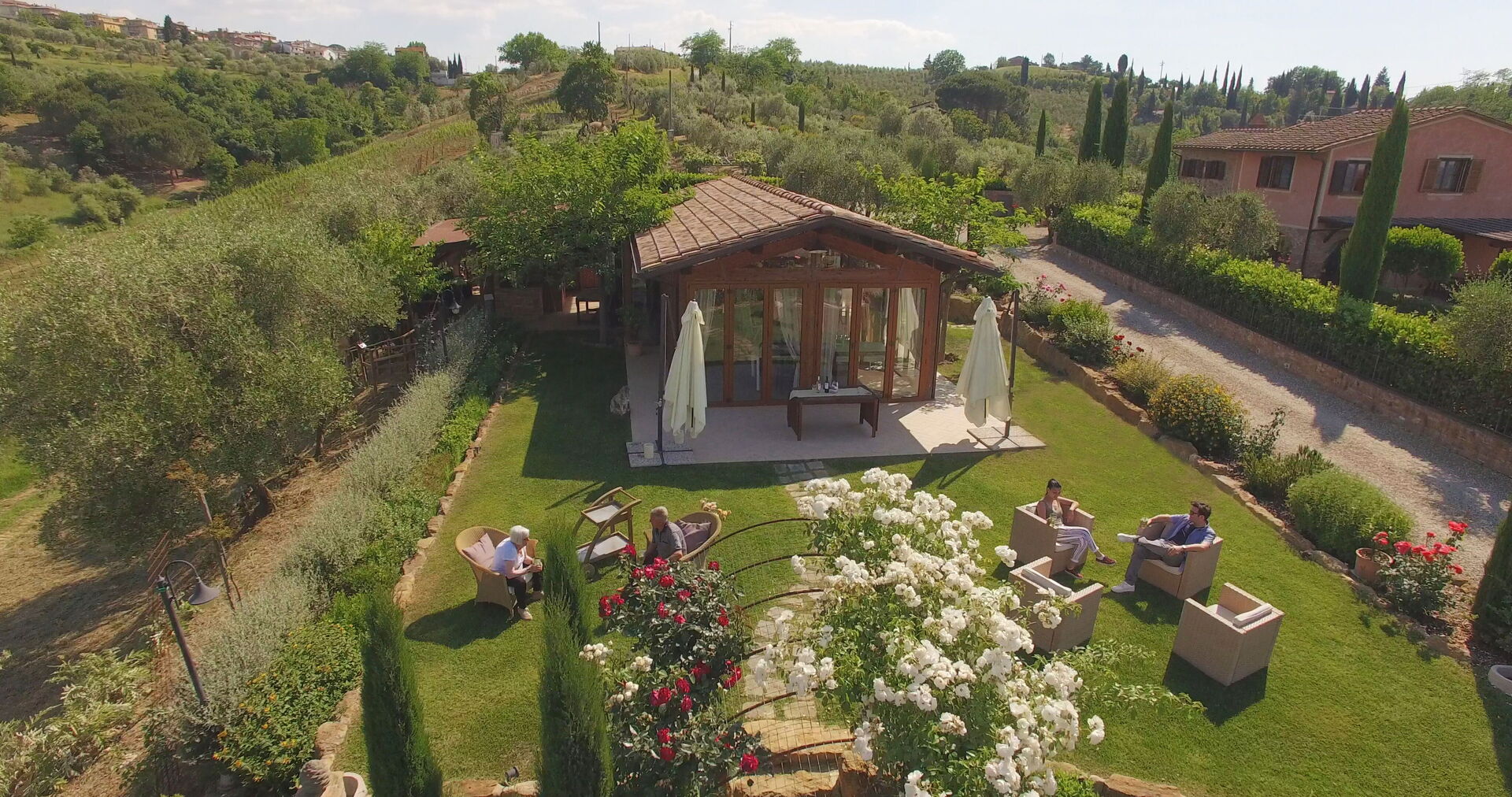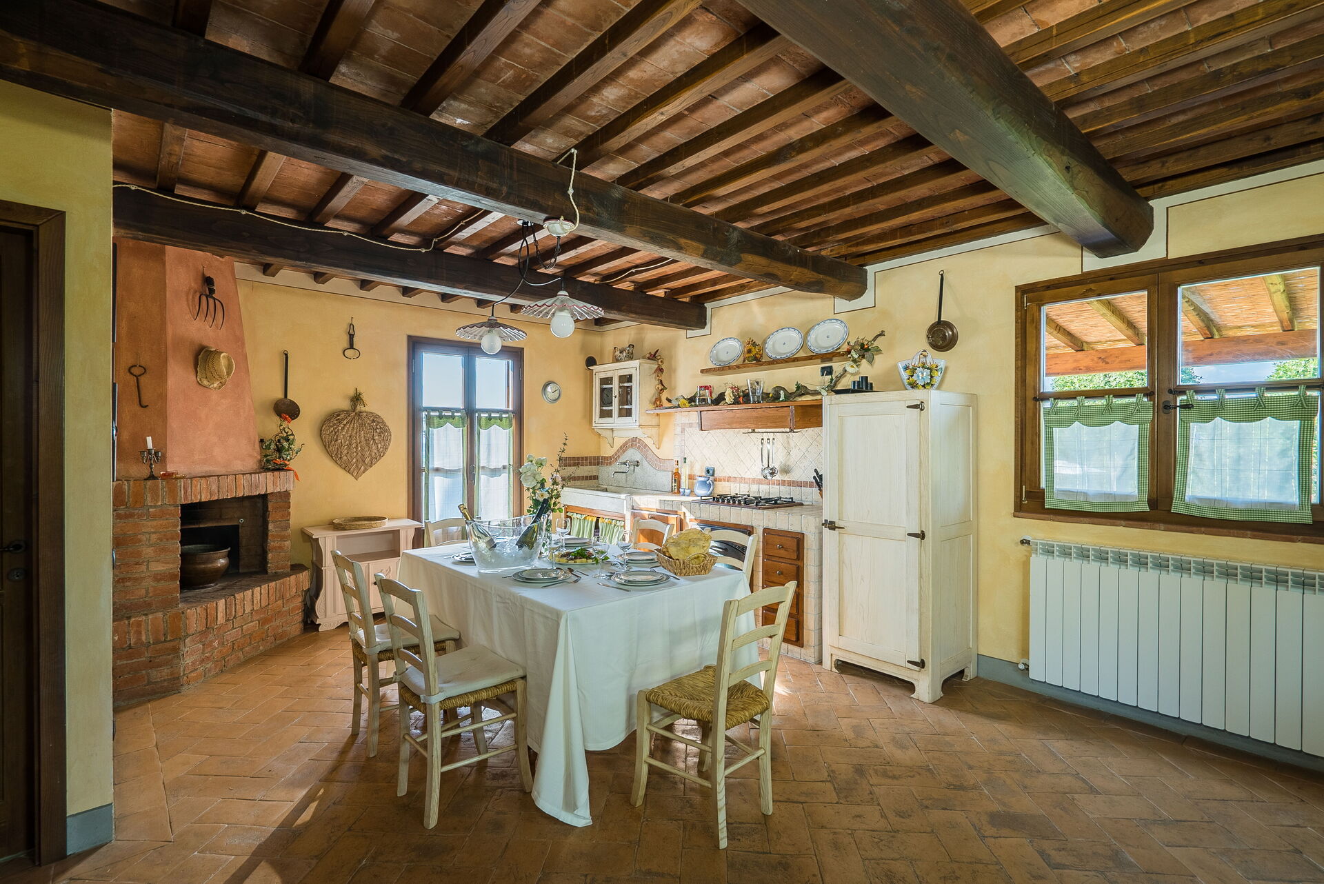 La propriété, située à environ 1 km de Montaione et louée comme un seul environnement d'environ 300 mètres carrés, se compose de trois appartements, dont deux communiquent entre eux et un autre se trouve dans une petite dépendance. En face du bâtiment principal, nous trouvons une charmante "salle de fête", entièrement en bois et entourée de grandes fenêtres, équipée de table et de chaises, de fauteuils, d'un four à bois, d'un barbecue et d'une cuisinière. Cette salle de fête peut être réservée sur demande, moyennant un supplément sur place.