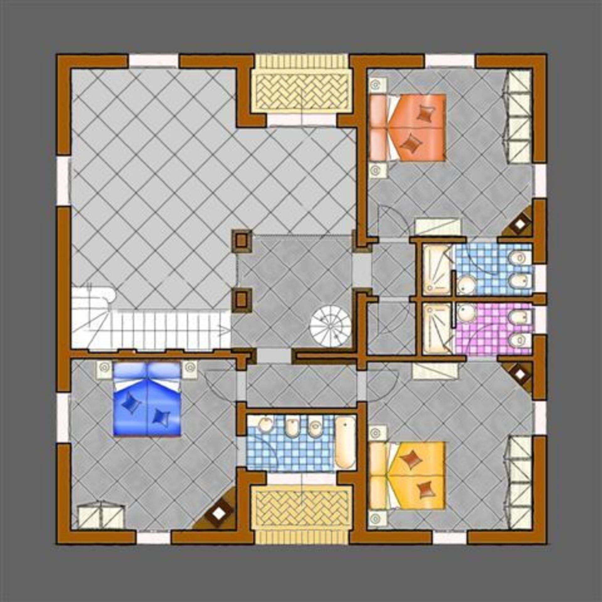 Premier étage: 2 chambres à 2 lits à une place (possibilité de lits jumeaux) avec cheminée et salle de bains privée avec douche, une chambre double avec cheminée et salle de bains privée.