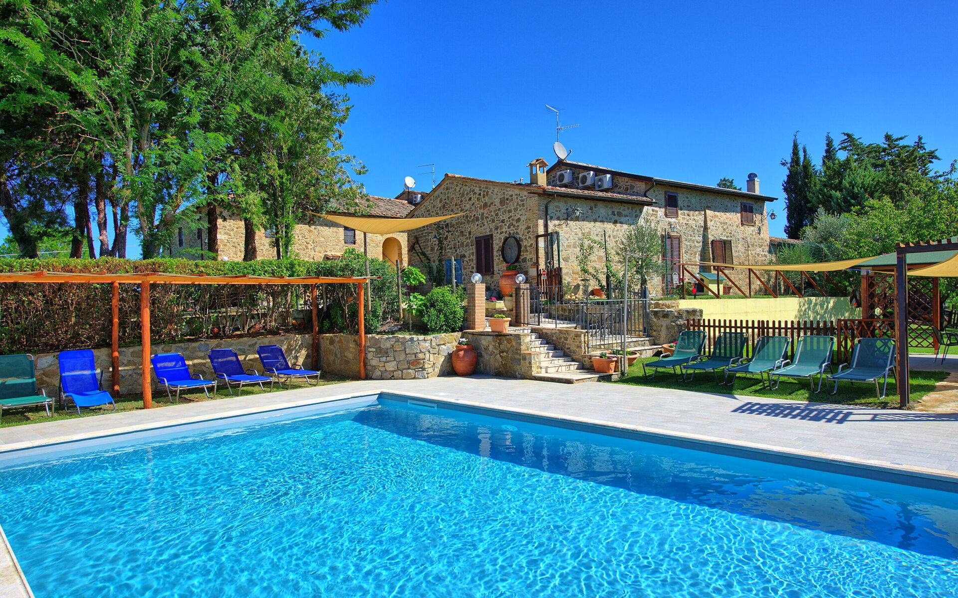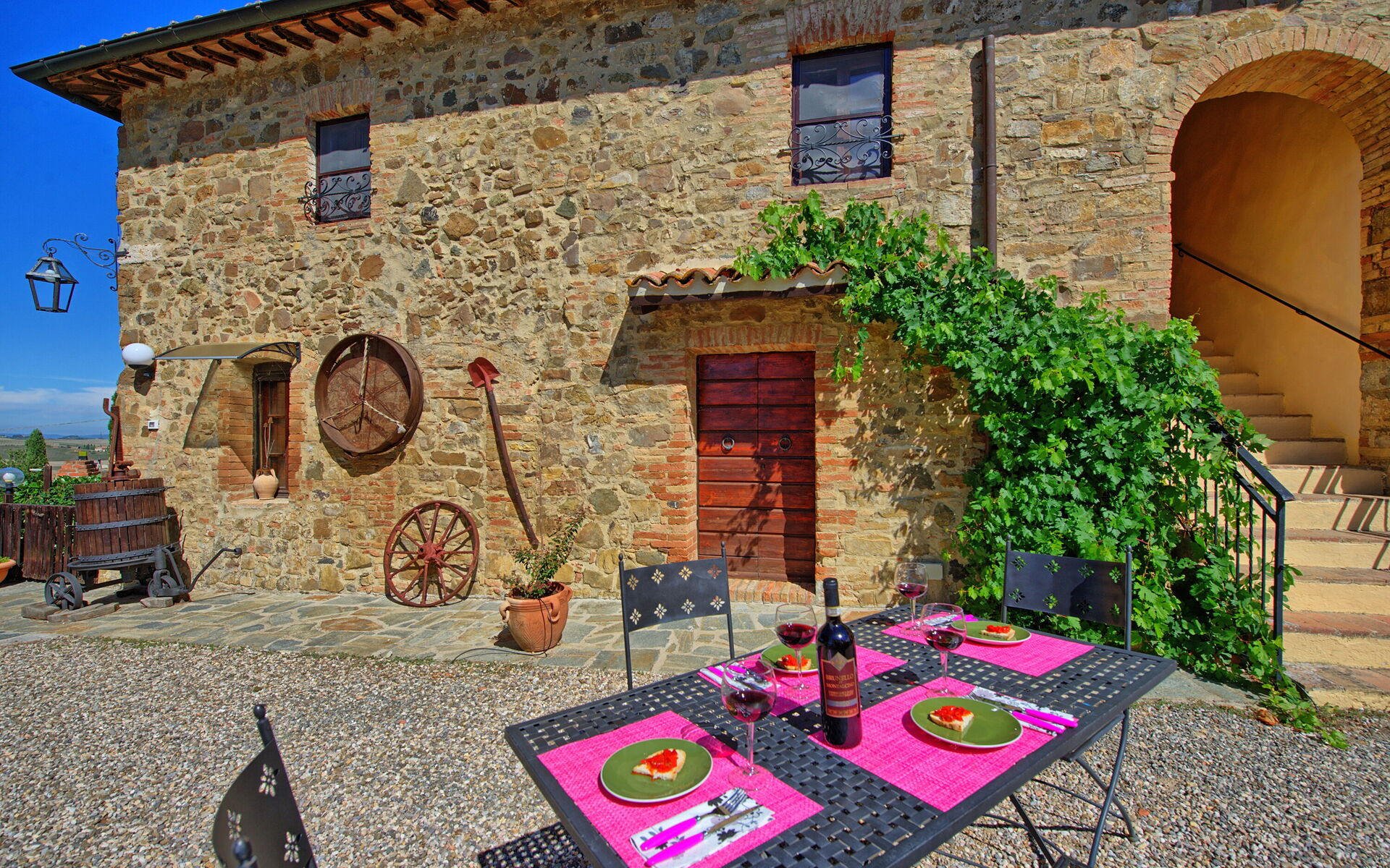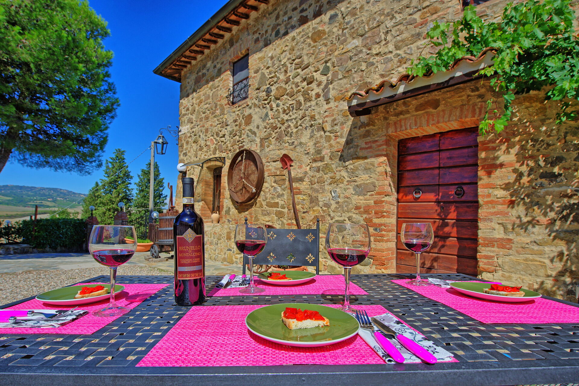 Villa Cerretalta est perchée au sommet d’une belle colline de la campagne siennoise au milieu d’une mer de vignobles du Brunello. La villa est située dans le Parc National de la Val d’Orcia, entre les petites villes de Montalcino (à 10km) et San Quirico d’Orcia (à 10km). Le village de Torrenieri avec magasins variés et restauants à 5km.