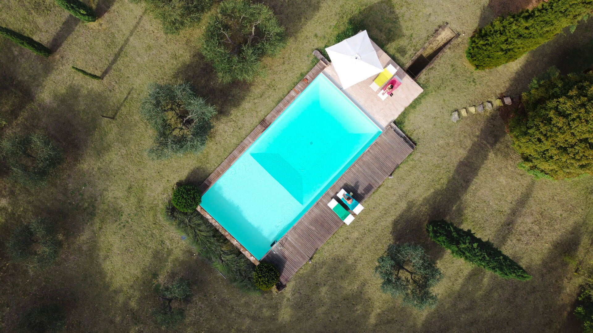 jardin: piscine (privé, largeur: 6m, longueur: 12.5m, profondeur max.: 2.2m, profondeur min.: 1.2m, en plein air), internet WIFI, barbecue, espace extérieur pour les repas en plein air, table à manger (personnes: 8), pavillon, meuble de jardin, meuble de terrace, six chaises longues, clôturé /clôturée, propriété clôturée.