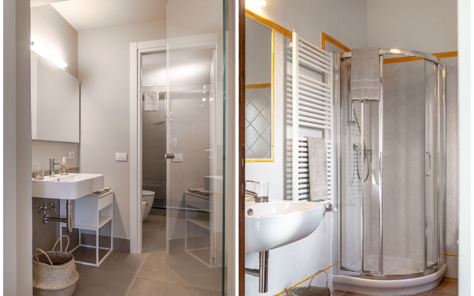 Premier étage: une chambre avec deux lits à une place et salle de bains privée avec douche, une chambre double avec salle de bains privée avec douche, chambre principale avec grand lit et salle de bains privée avec douche.