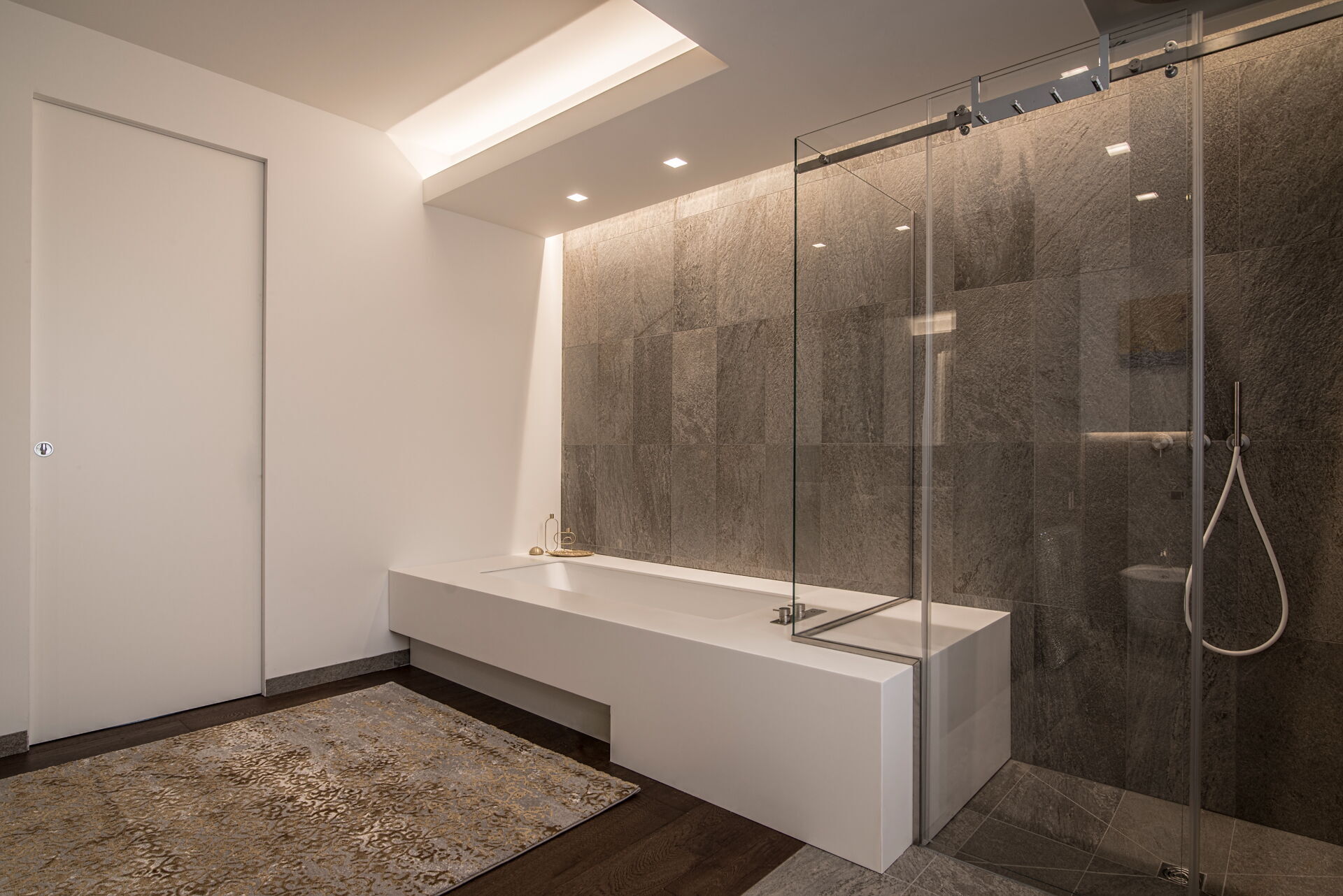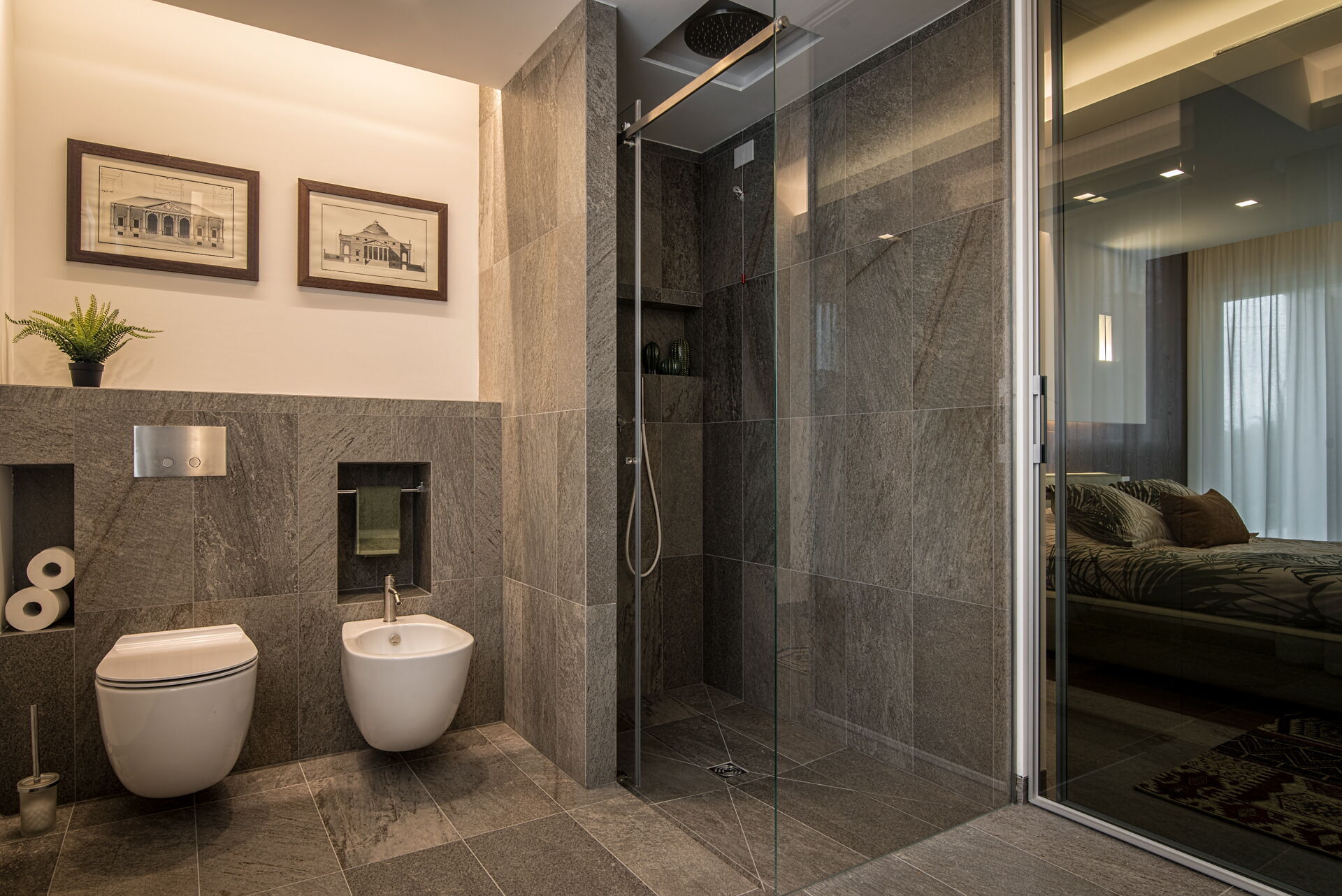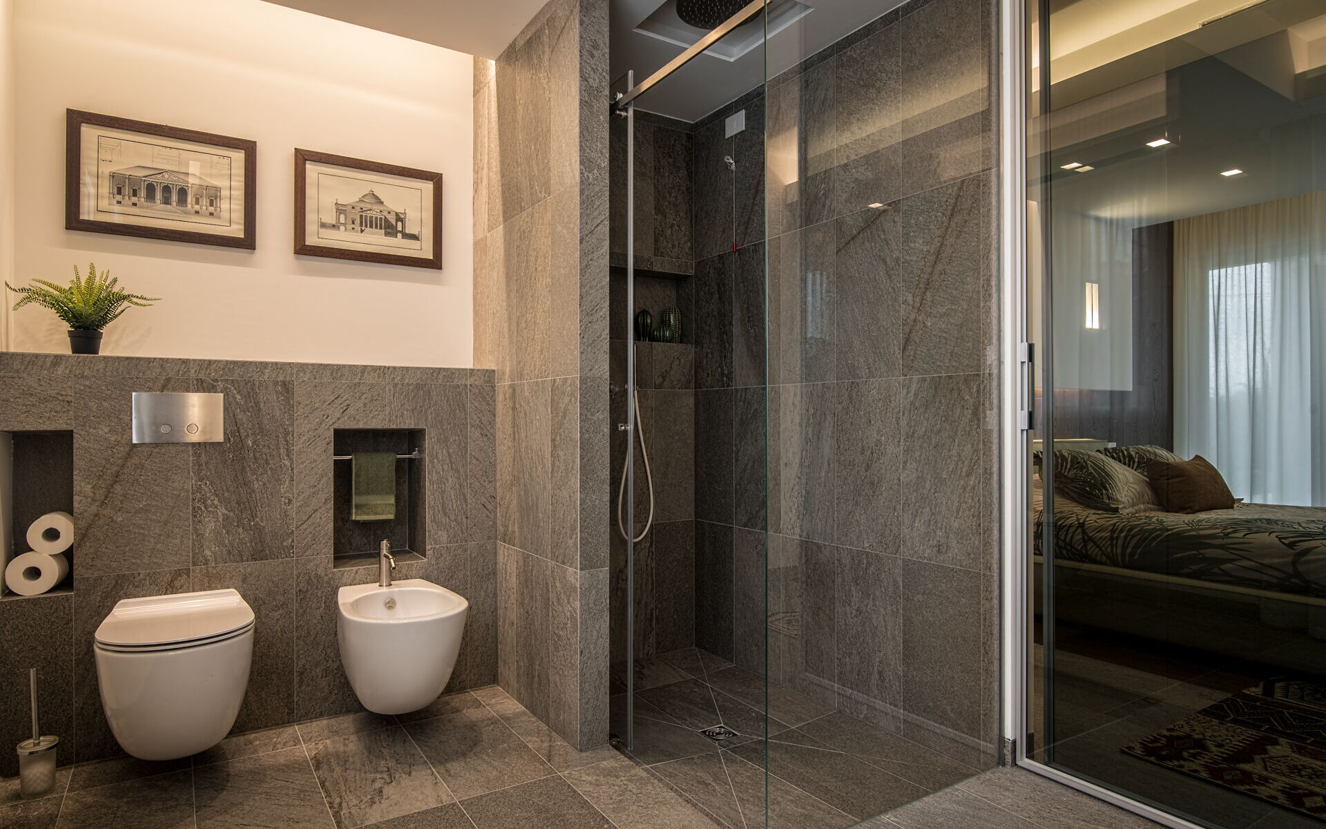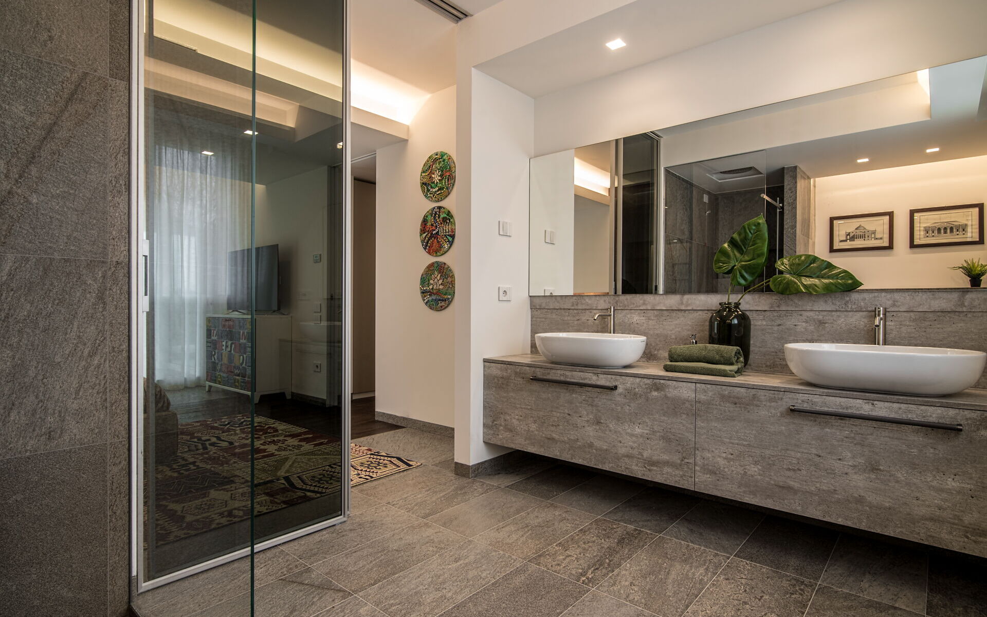 salle de bain: bassin double, wc, bidet, bagnoire, douche, sèche-cheveux.