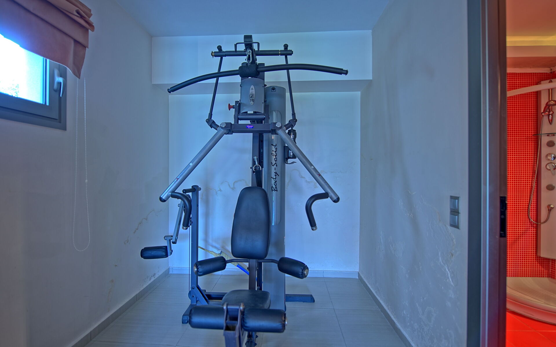 Ground floor: living room (satellite TV) and gym corner (treadmill, weight machine); double bedroom; bathroom with shower (no window); room with washing machine.
