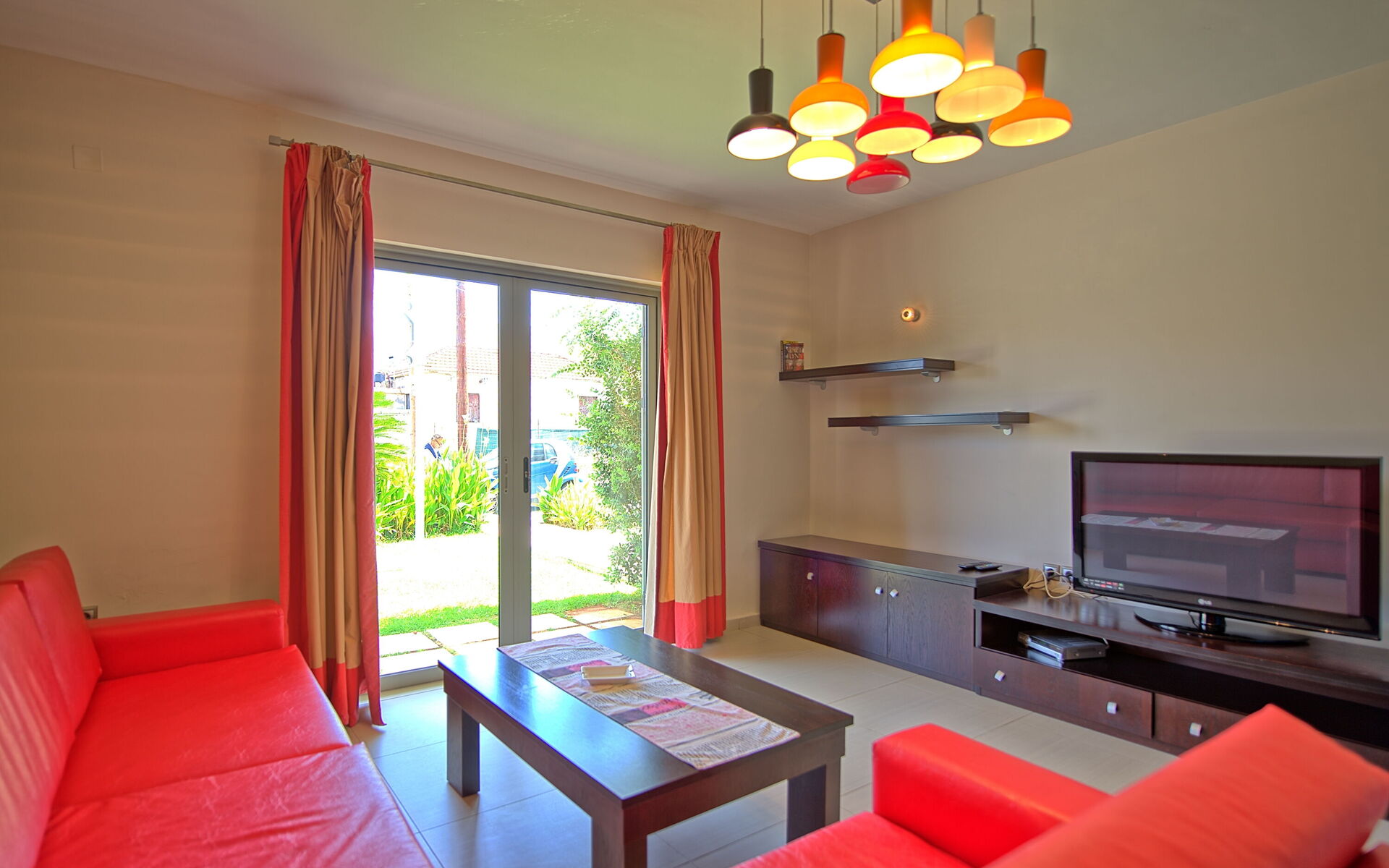 First floor: large living room (satellite TV) with dining area, bar corner (refrigerator) and kitchen (oven, freezer, dishwasher, American coffee maker, microwave); this floor also has direct outside access.