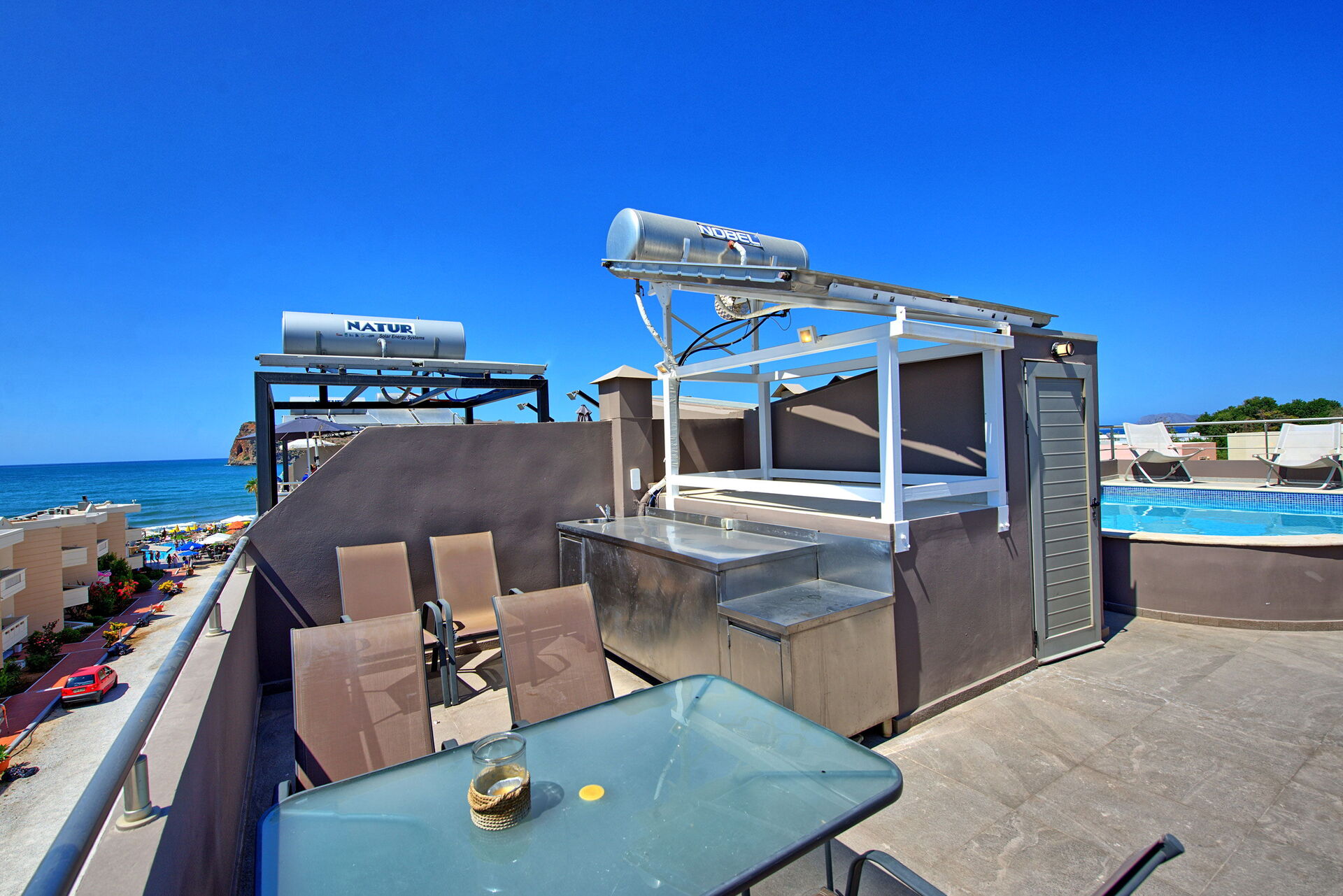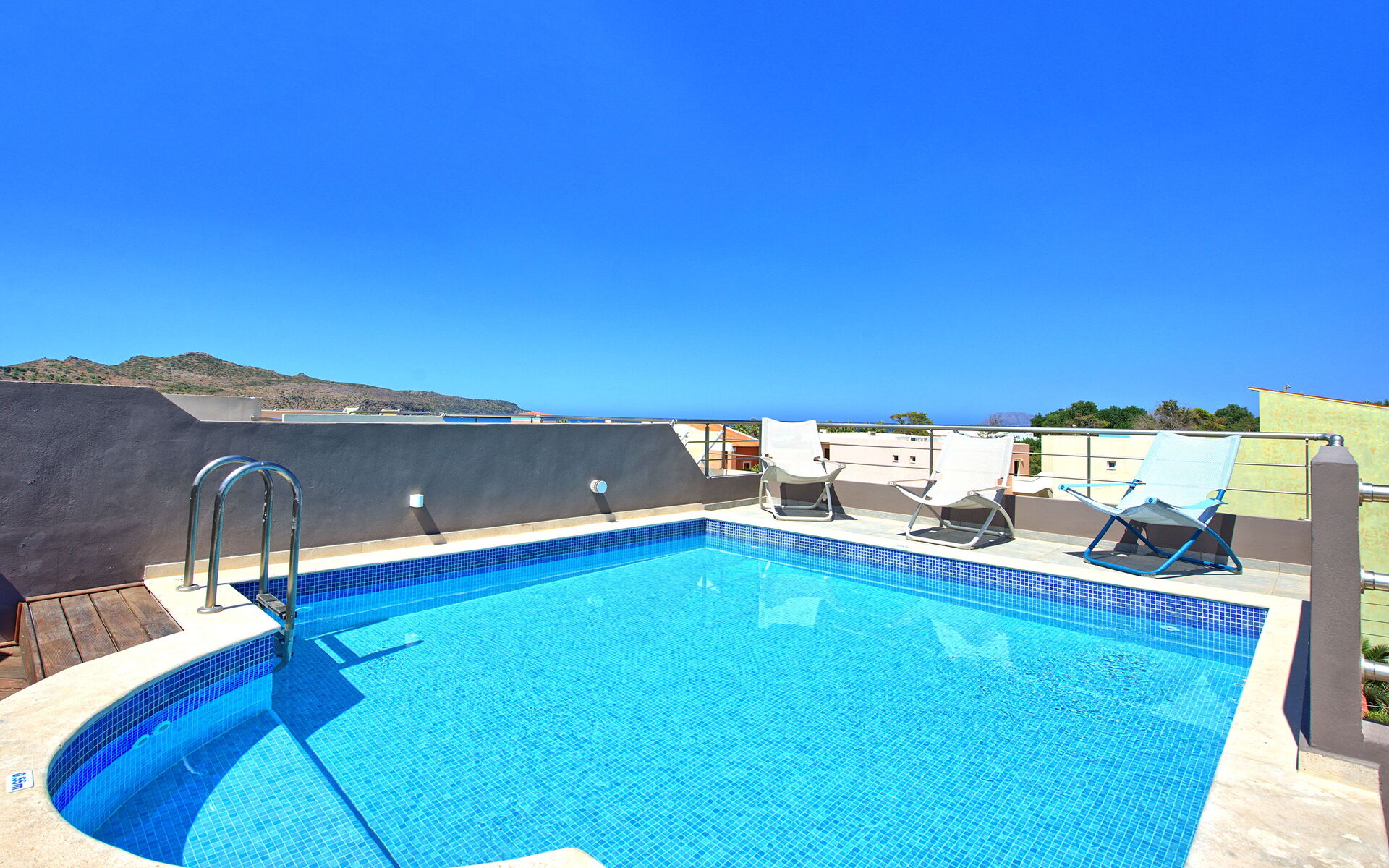 Third floor: terrace with panoramic views and private pool (depth: 0,55 meters), outdoor shower, table and chairs for outdoor dining.