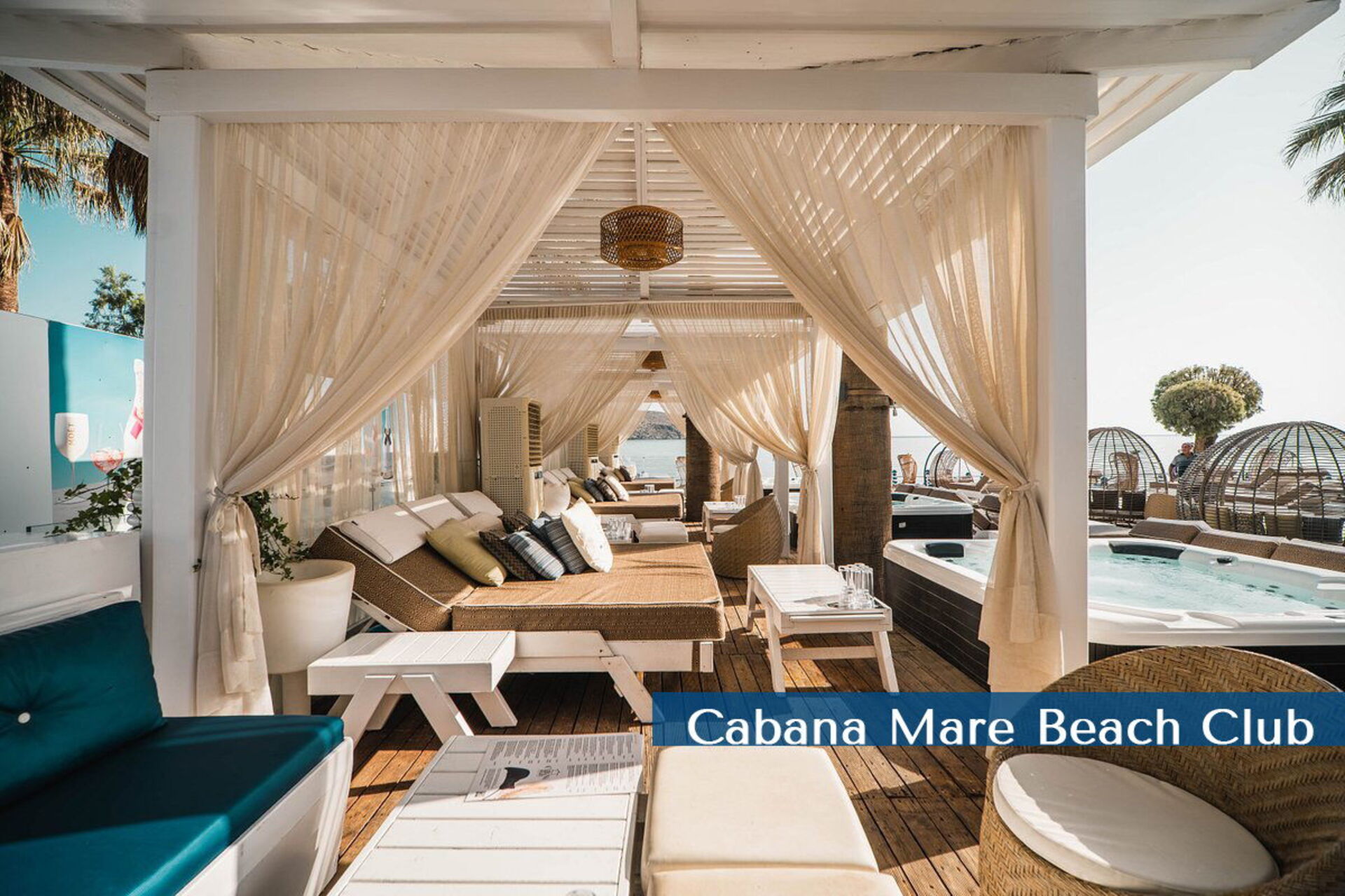 Services available at the Cabana Mare Beach Club: beach equipped with umbrellas and sun loungers; restaurant for breakfast, lunch and dinner; sushi bar; fully-stocked bar (wine, champagne, cocktails); pool; exclusive poolside gazebos with private Jacuzzi; events with DJs from around the world; theme parties; night club; private minivan transfers (airport, Chania night clubs, excursions, etc.) available upon request.