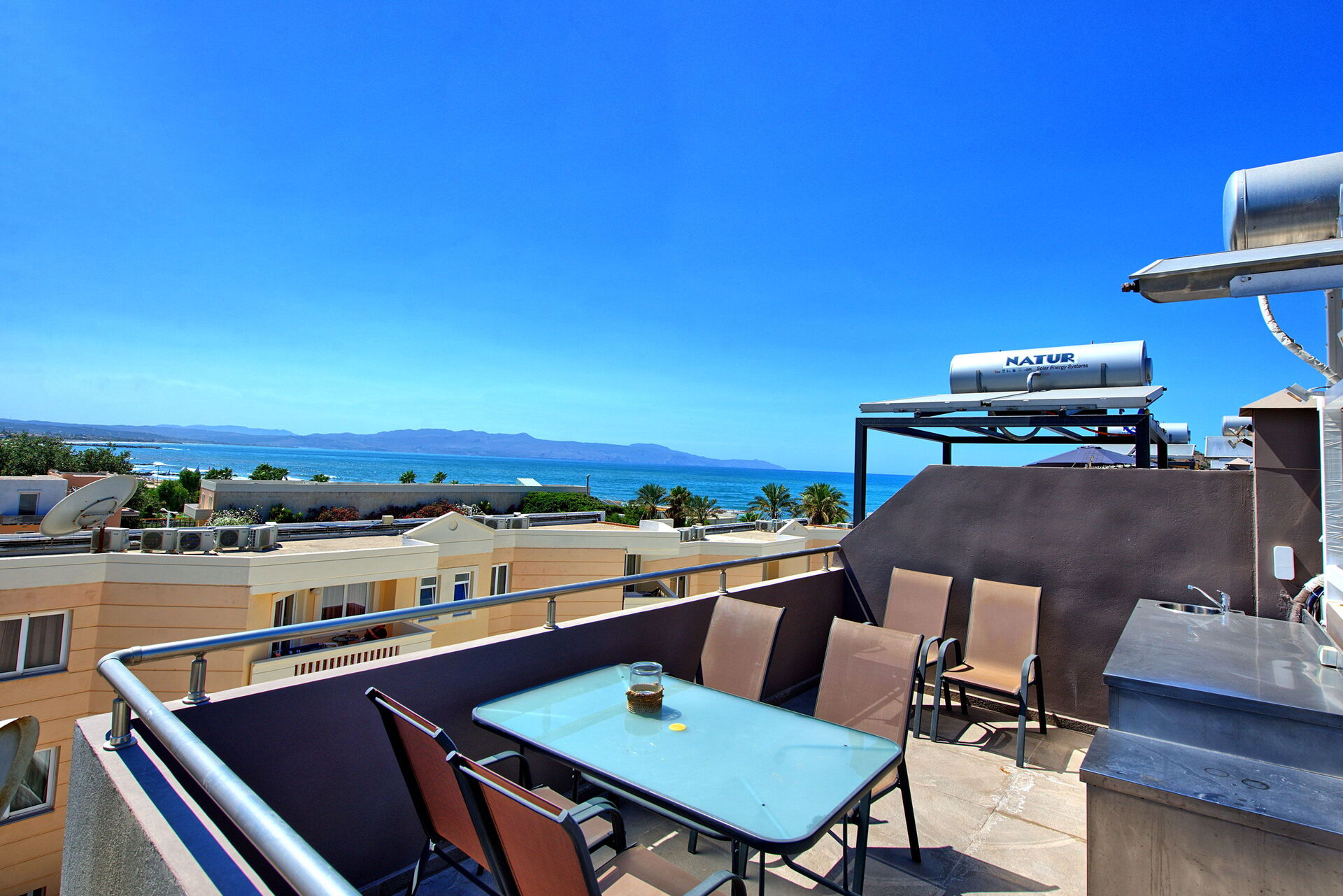 Distances: sea 100 meters away, Agia Marina (shops of all kinds) 100 meters, Cabana Mare Beach Club 300 meters, Chania 11 km, airport 30 km away.