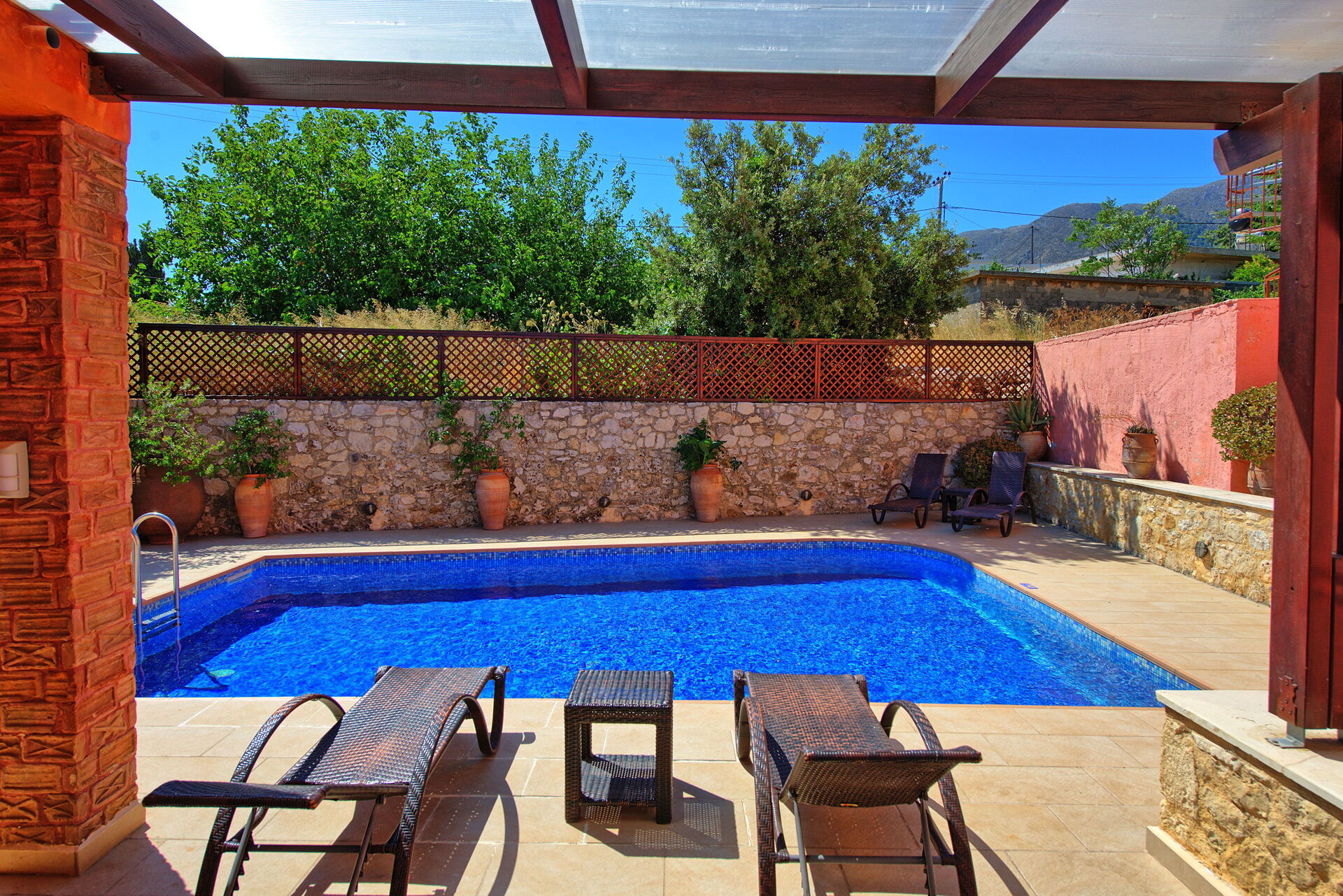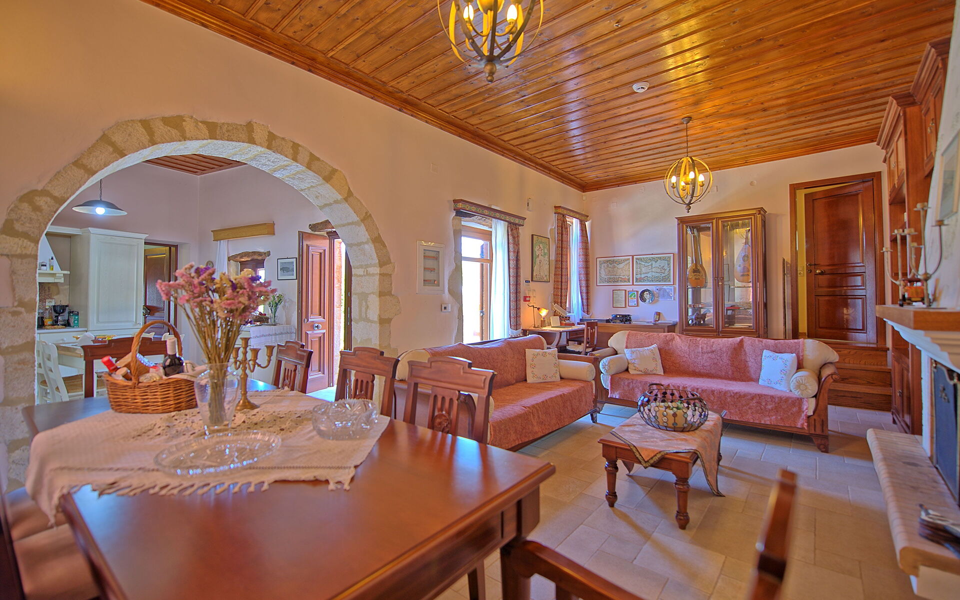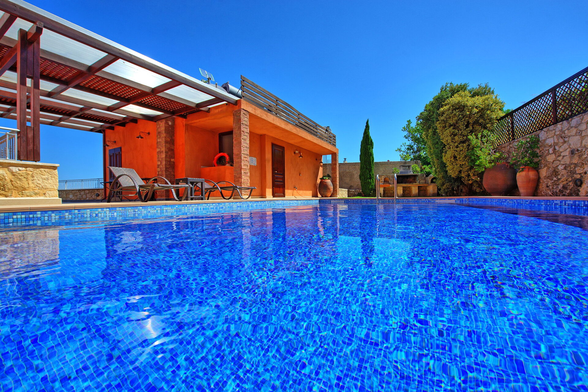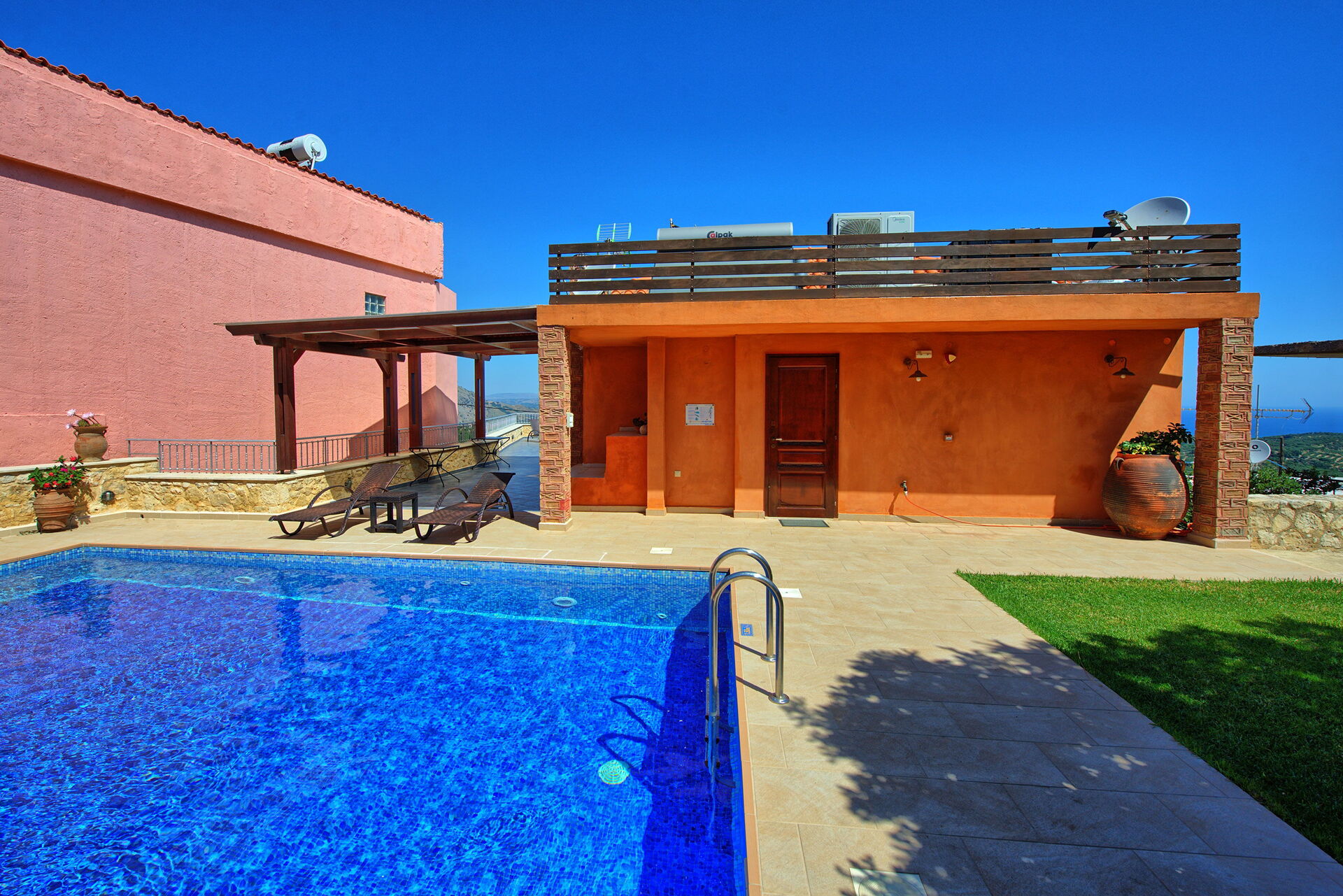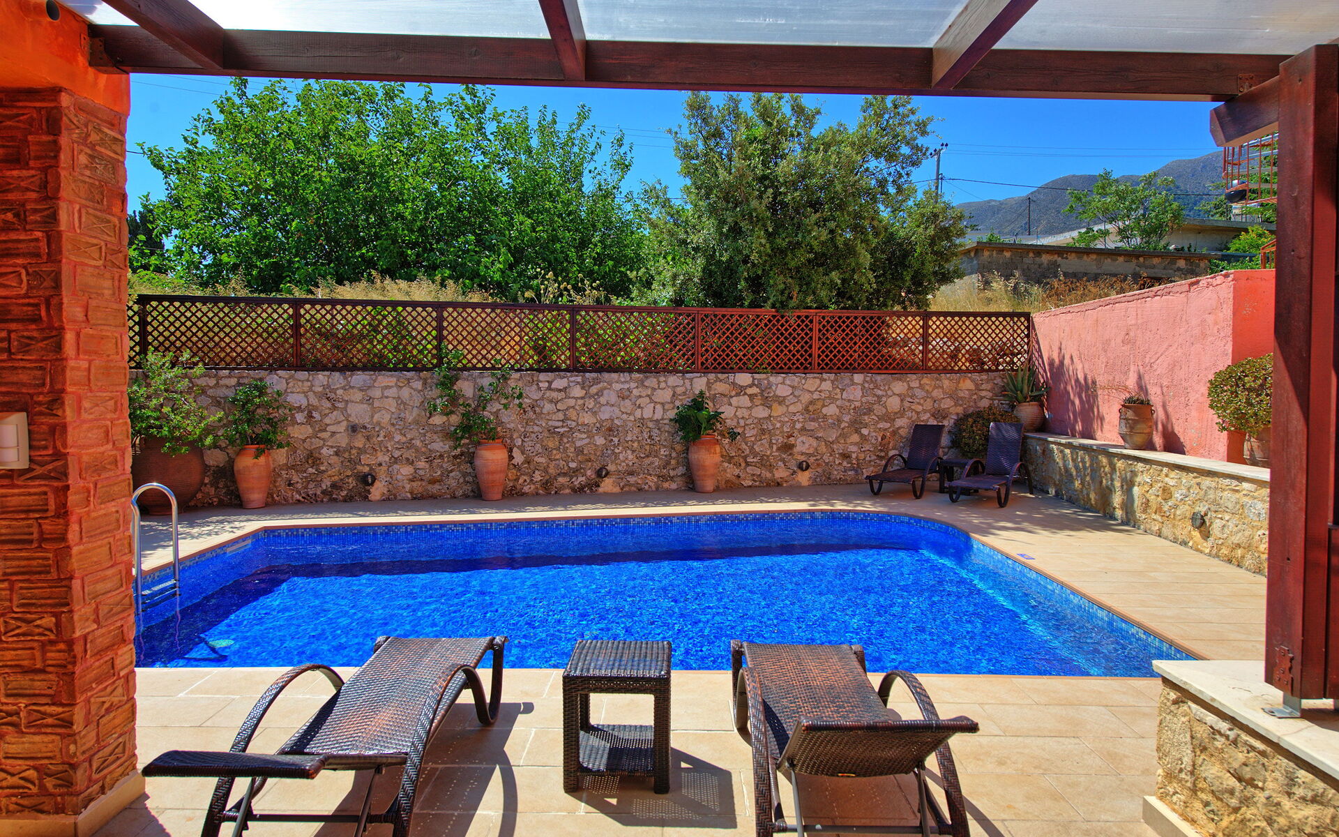 Villa with pool 5 km from the sea in Crete. It has 4 bedrooms, each with a private bathroom; a private pool; and a terrace with beautiful sea views. The rustic style interiors are very welcoming. Beaches and Lake Kournas are 5 km away.