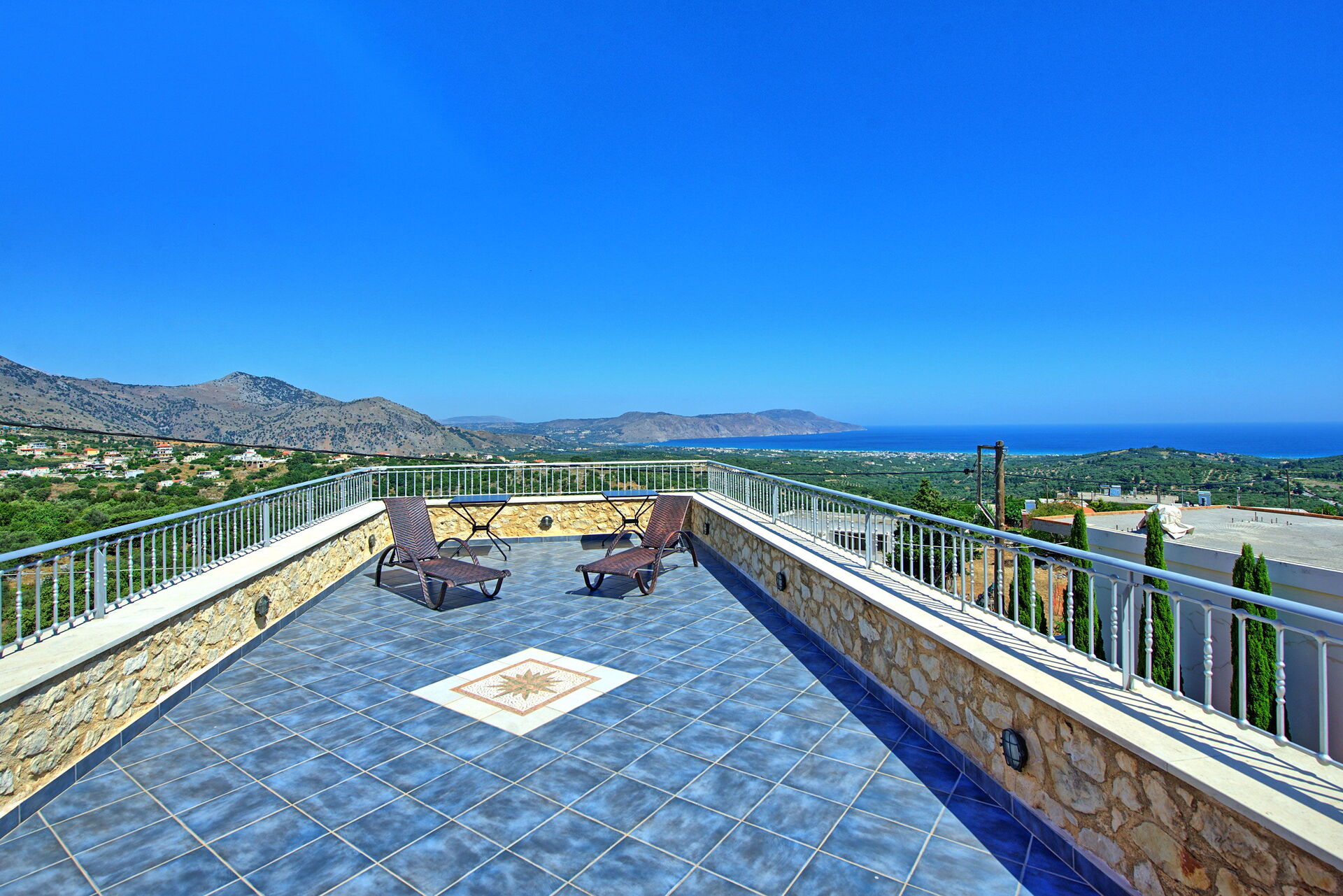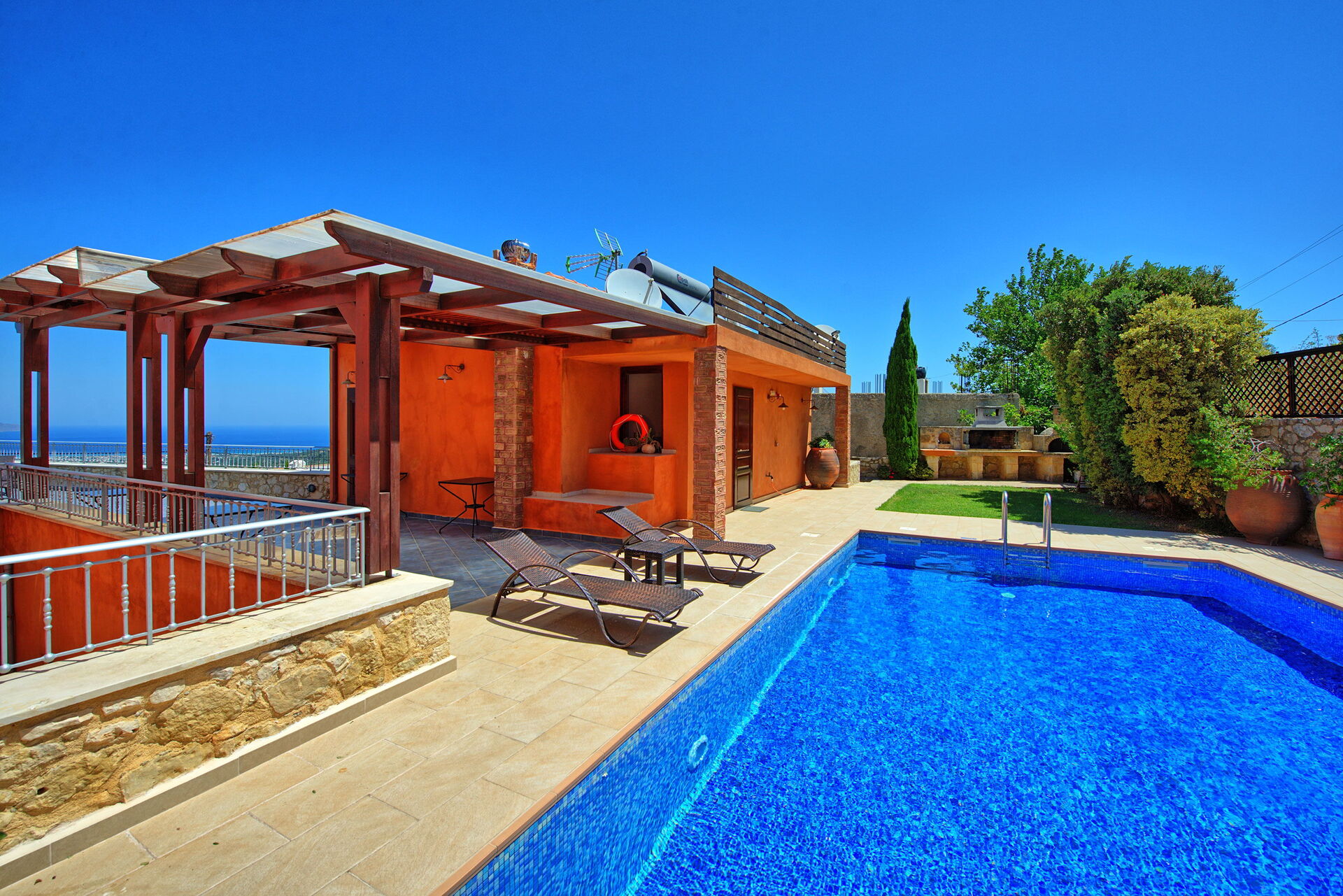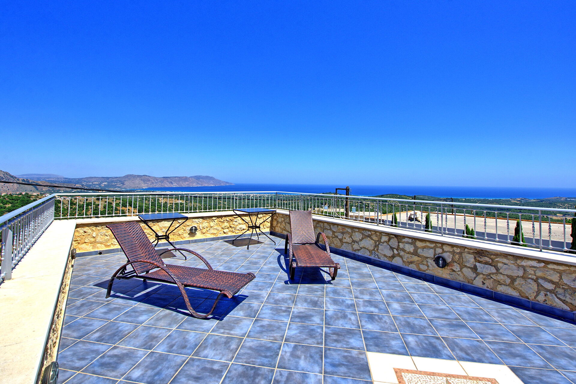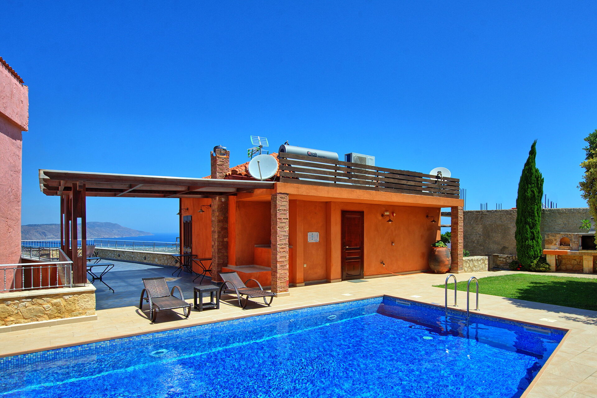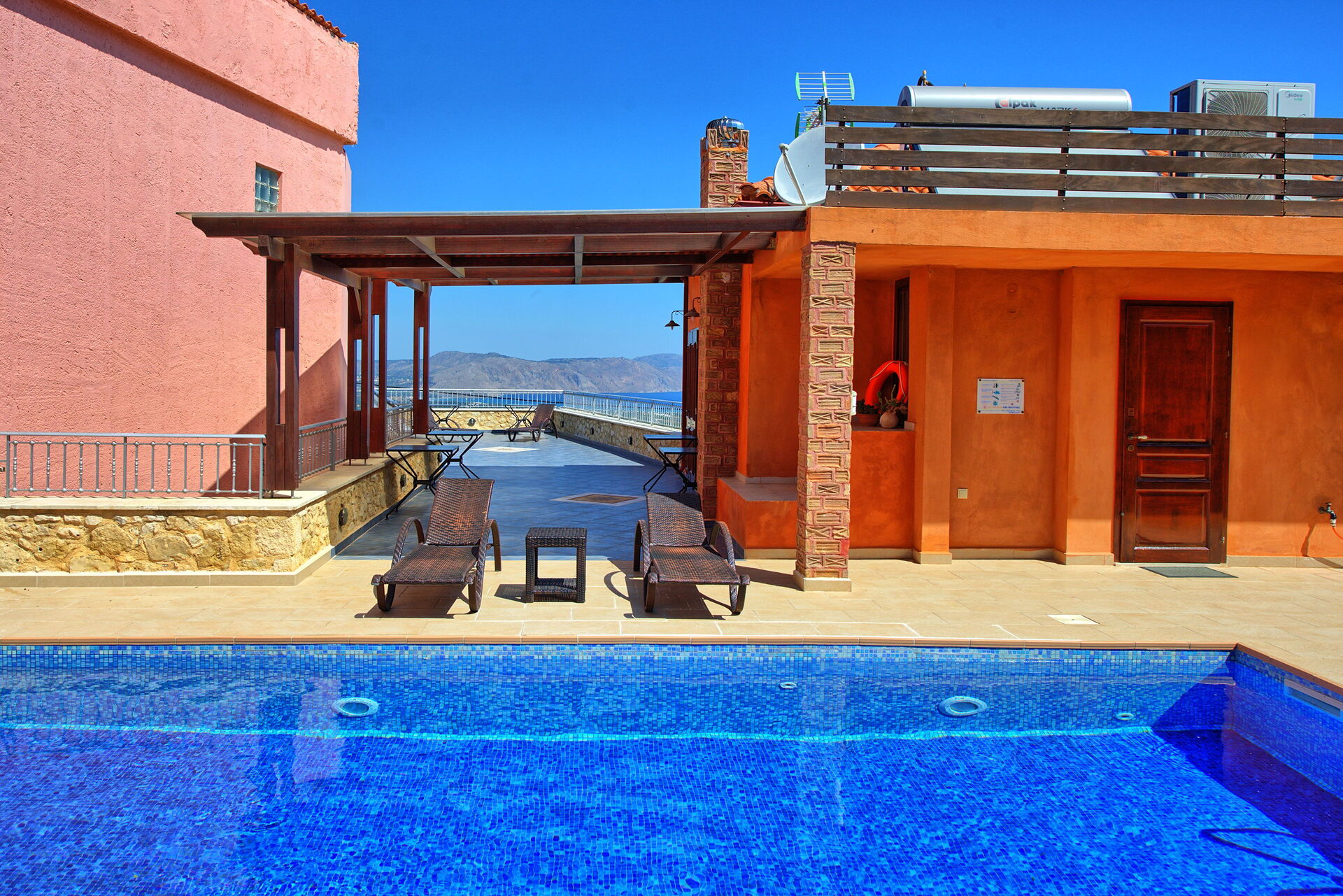 Villa with pool 5 km from the sea in Crete. It has 4 bedrooms, each with a private bathroom; a private pool; and a terrace with beautiful sea views. The rustic style interiors are very welcoming. Beaches and Lake Kournas are 5 km away.