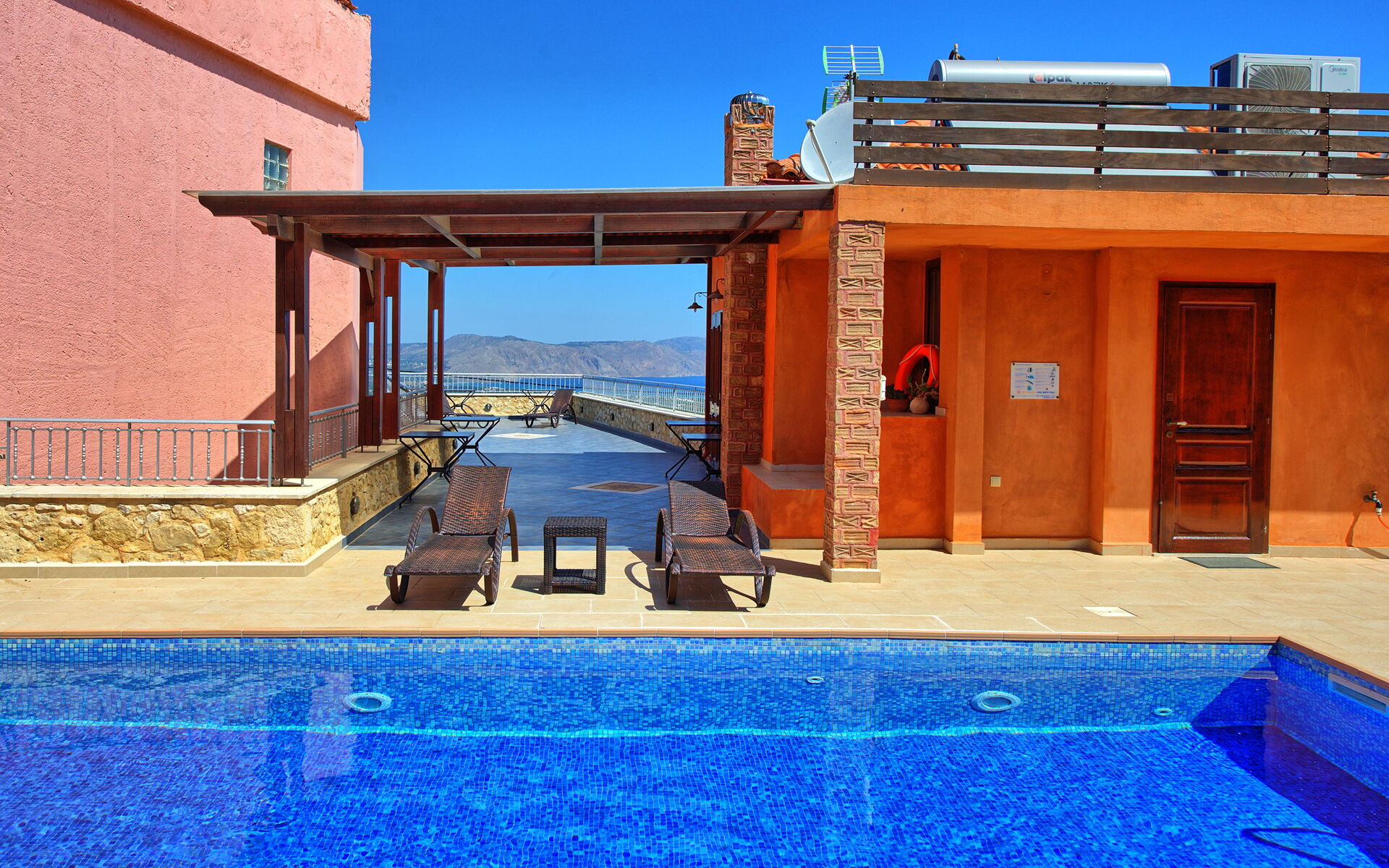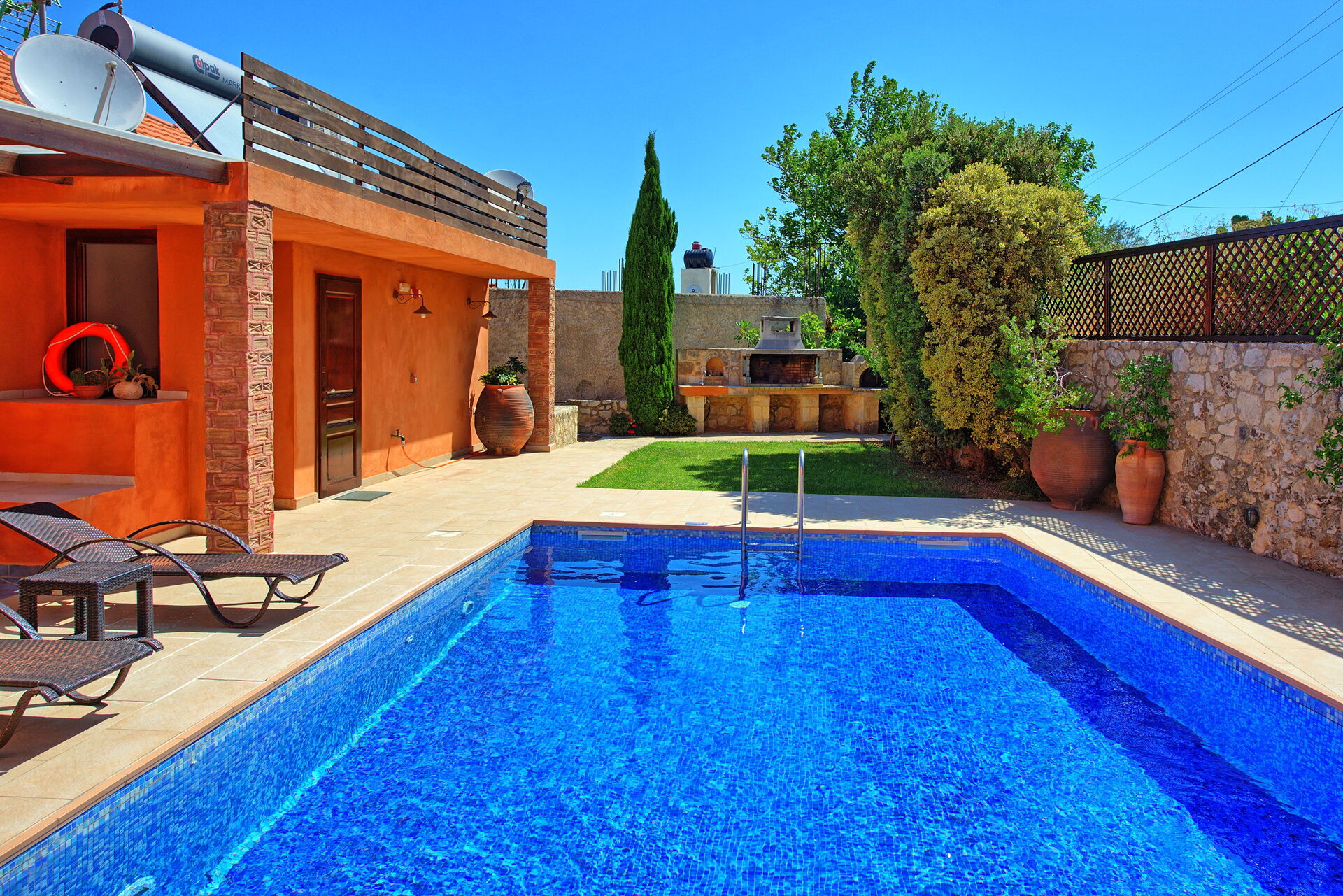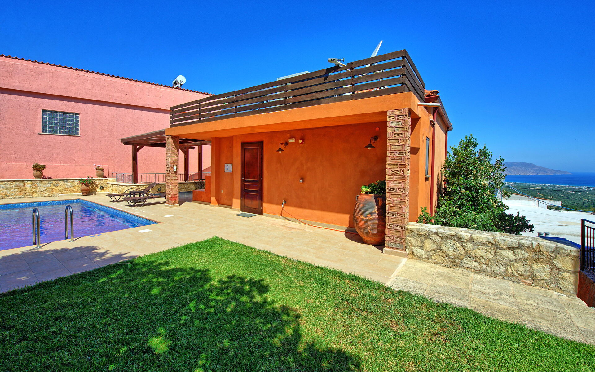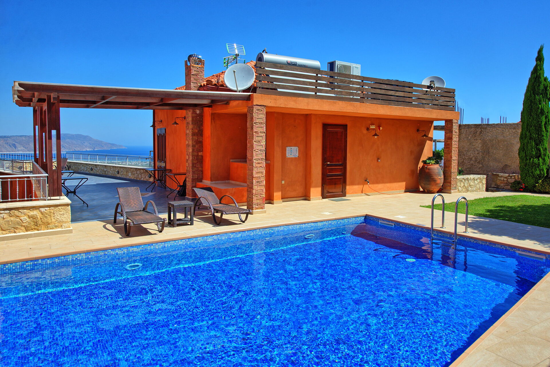 Villa with pool 5 km from the sea in Crete. It has 4 bedrooms, each with a private bathroom; a private pool; and a terrace with beautiful sea views. The rustic style interiors are very welcoming. Beaches and Lake Kournas are 5 km away.