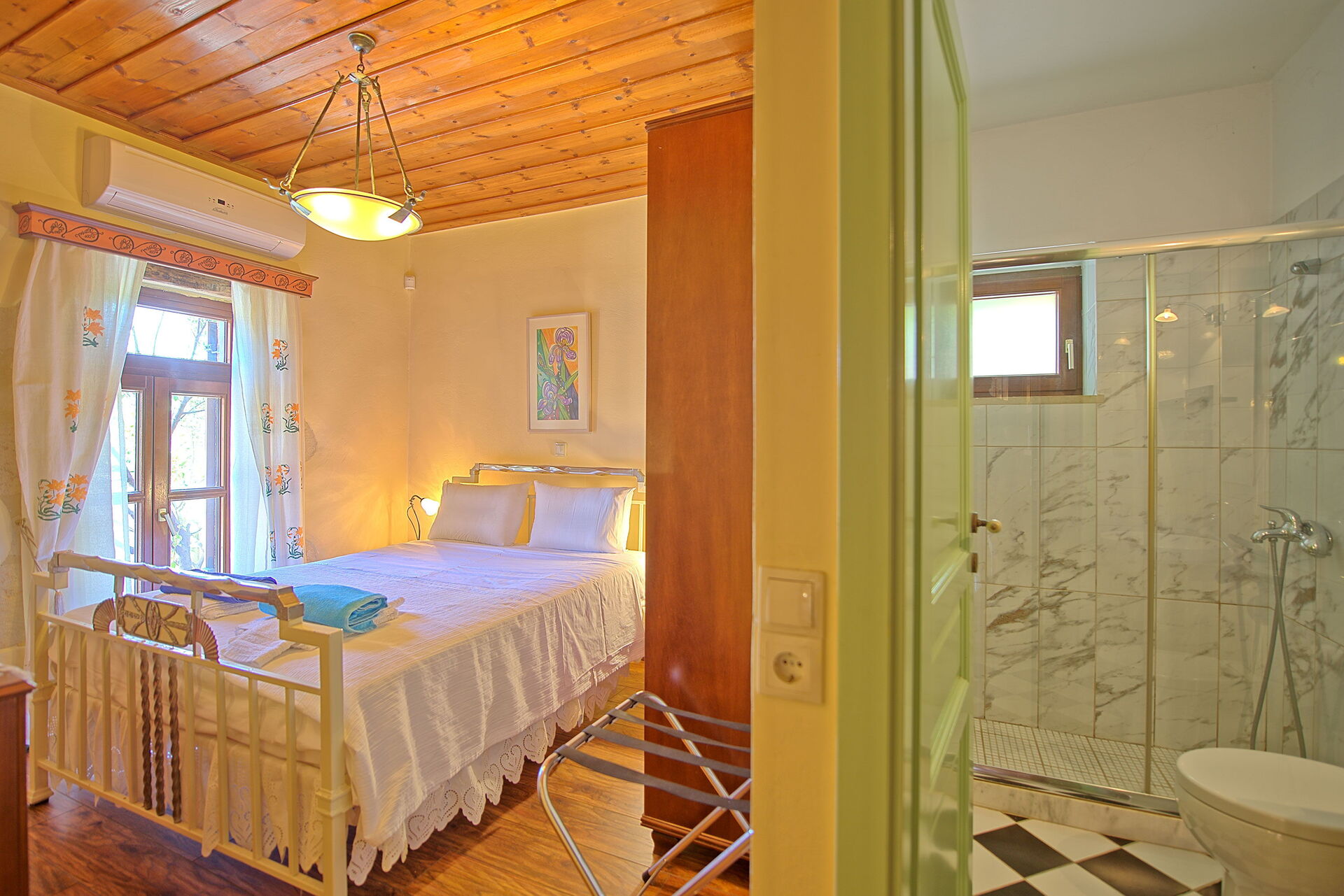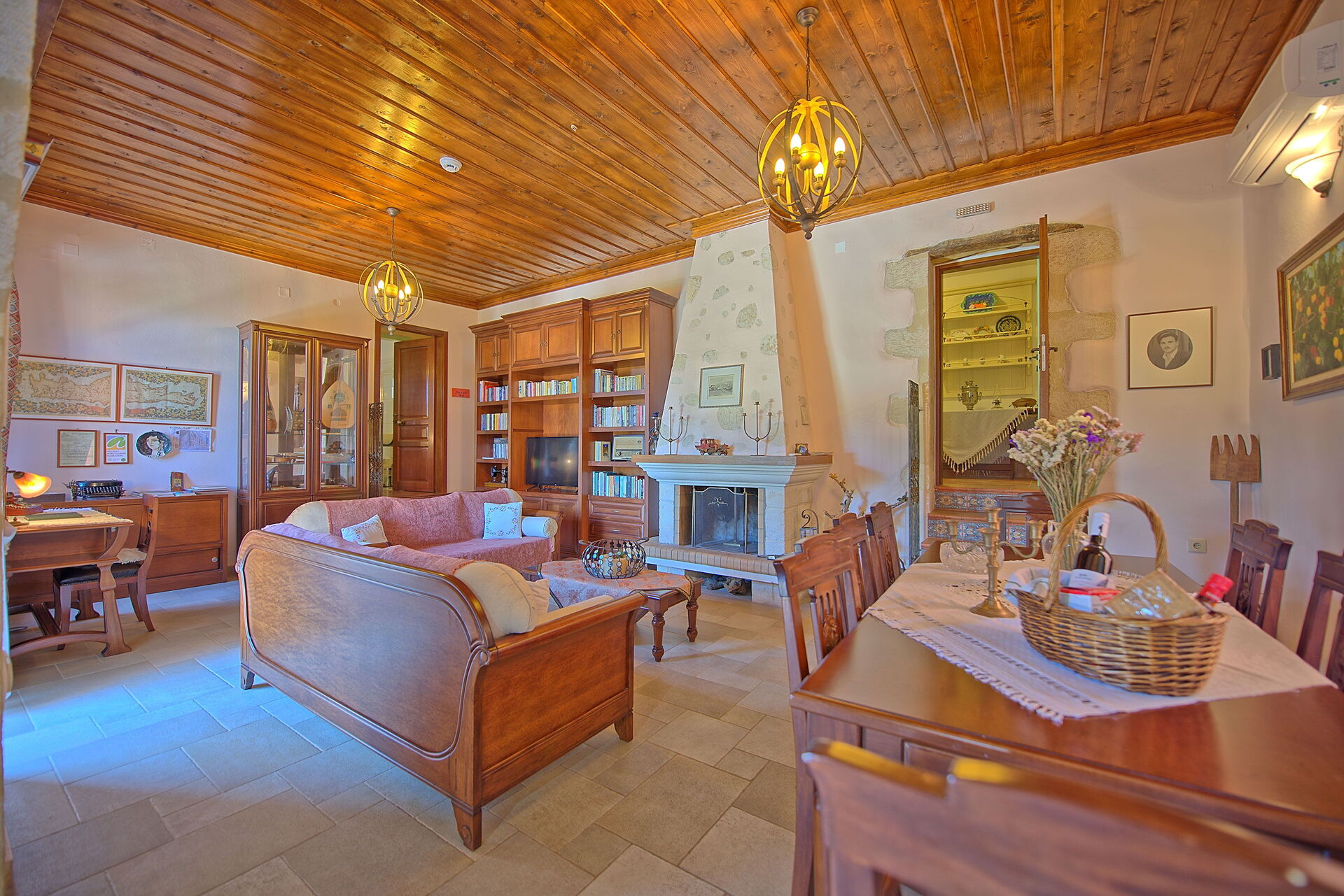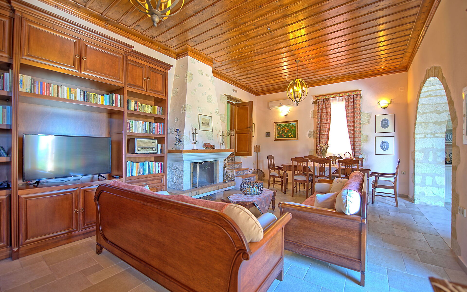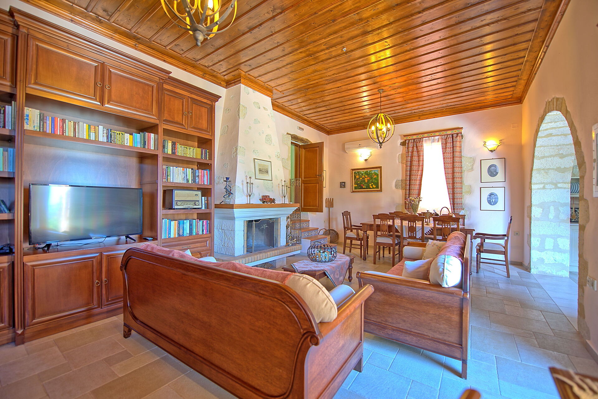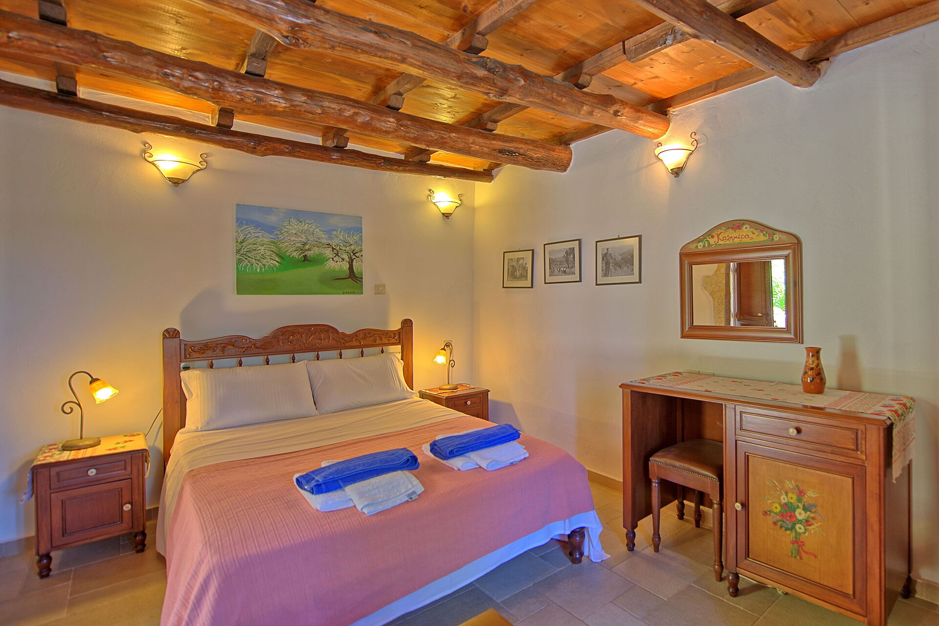 Villa with pool 5 km from the sea in Crete. It has 4 bedrooms, each with a private bathroom; a private pool; and a terrace with beautiful sea views. The rustic style interiors are very welcoming. Beaches and Lake Kournas are 5 km away.