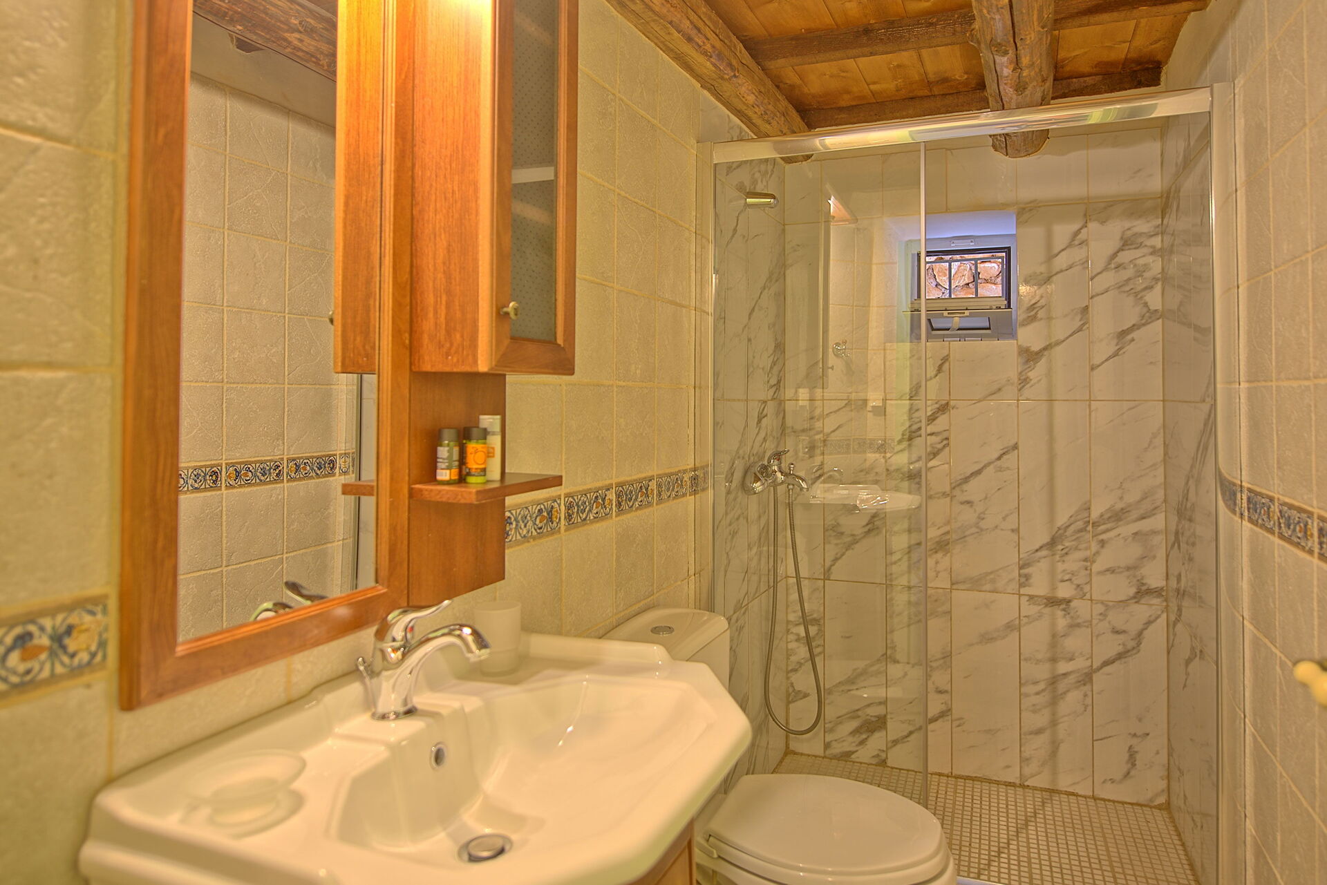 Upper ground floor: living room with fireplace and dining area; kitchen (oven, freezer, dishwasher, microwave); 2 double bedrooms, each with a private bathroom with shower.