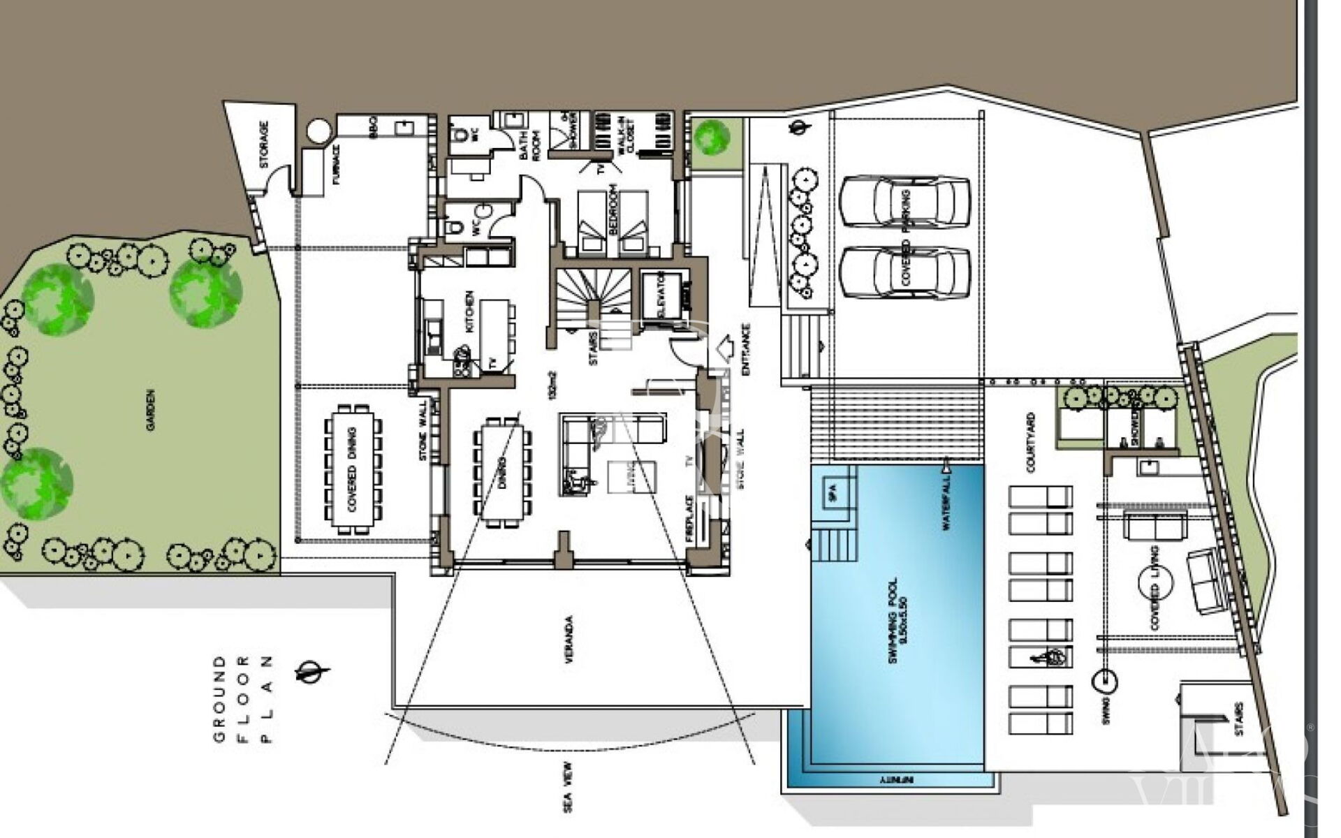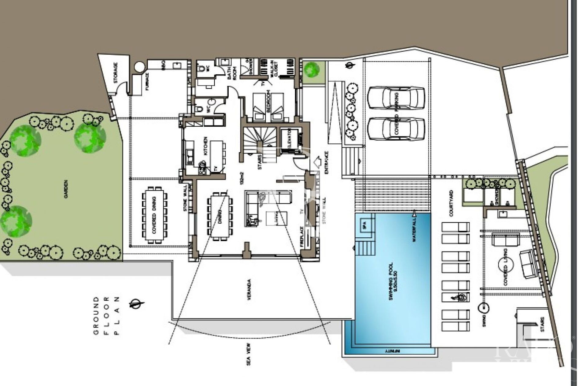 Outside area offers as well: a large veranda with a stunning sea views, a roofed covered dinning area with 12 chairs, large garden space with a sea views, a barbecue area, stone oven and a small covered outside kitchen space.
