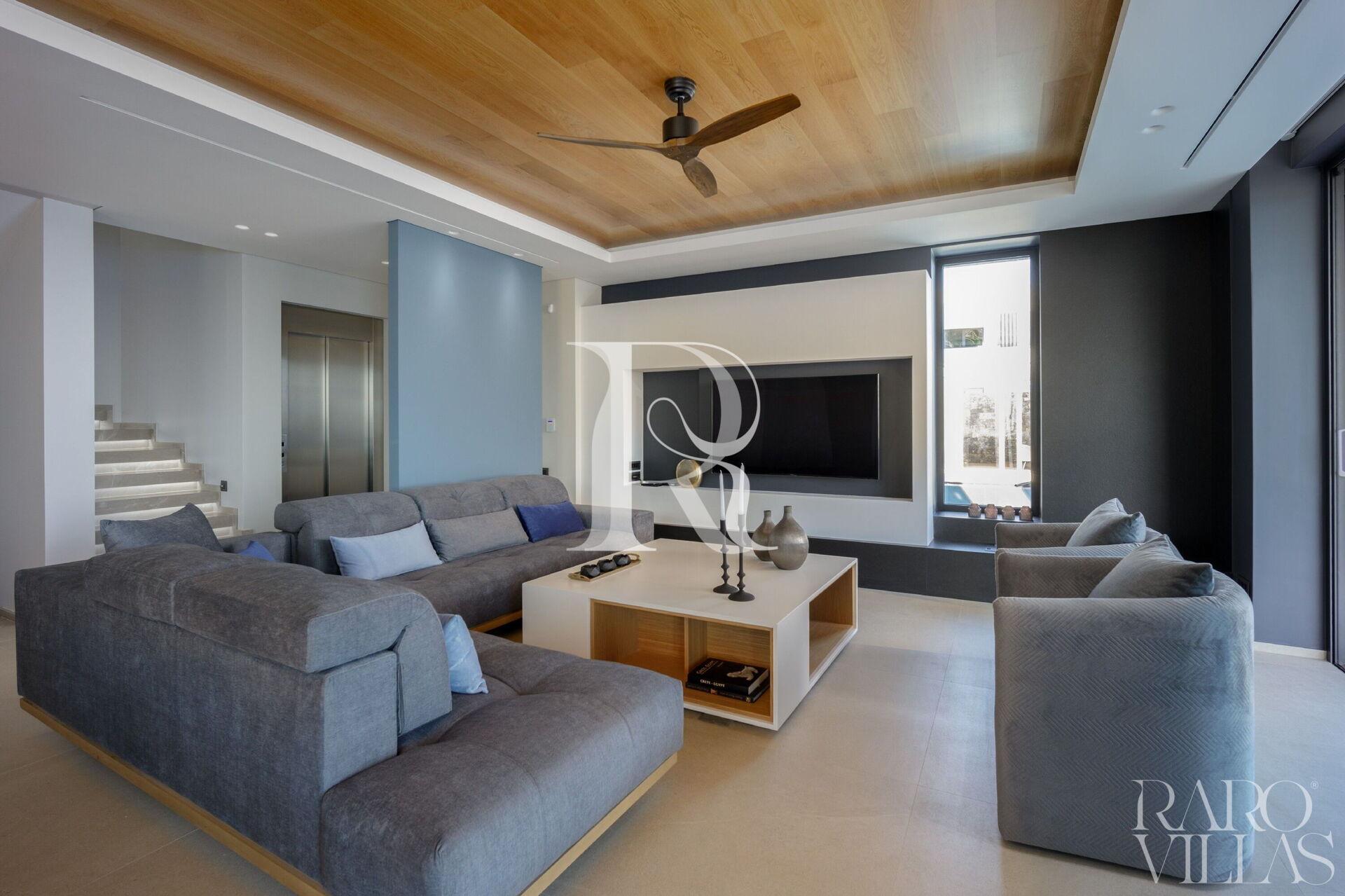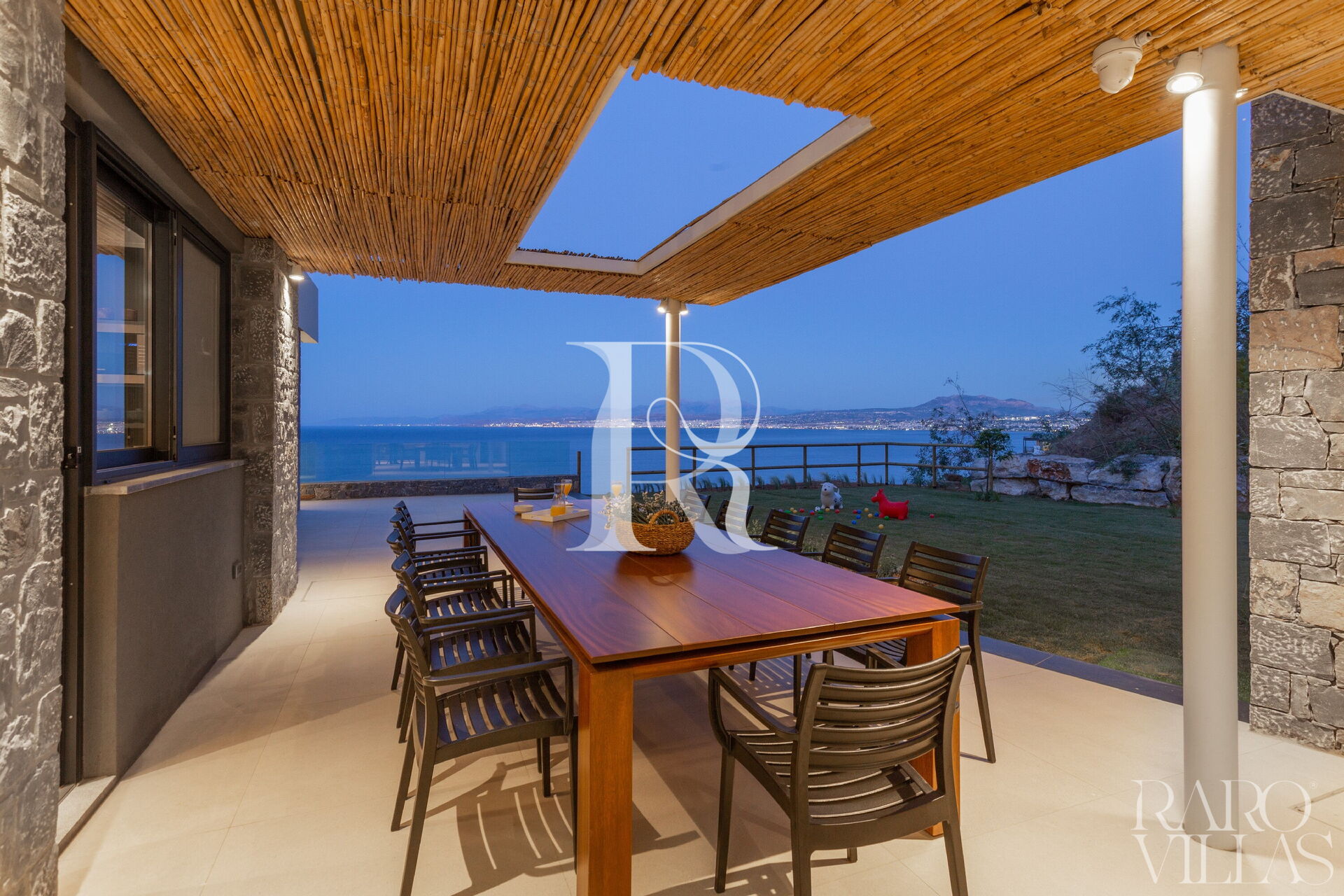 Living and dining area consist of a large table with 12 chairs and a beautiful ceiling lamp. A comfortable corner couch with sofa and a nesting coffee table, a large Smart Samsung TV and an ecological - bioethanol fireplace. Large Floor-to-ceiling doors lead to a specious veranda with panoramic sea view over the Cretan Sea.
