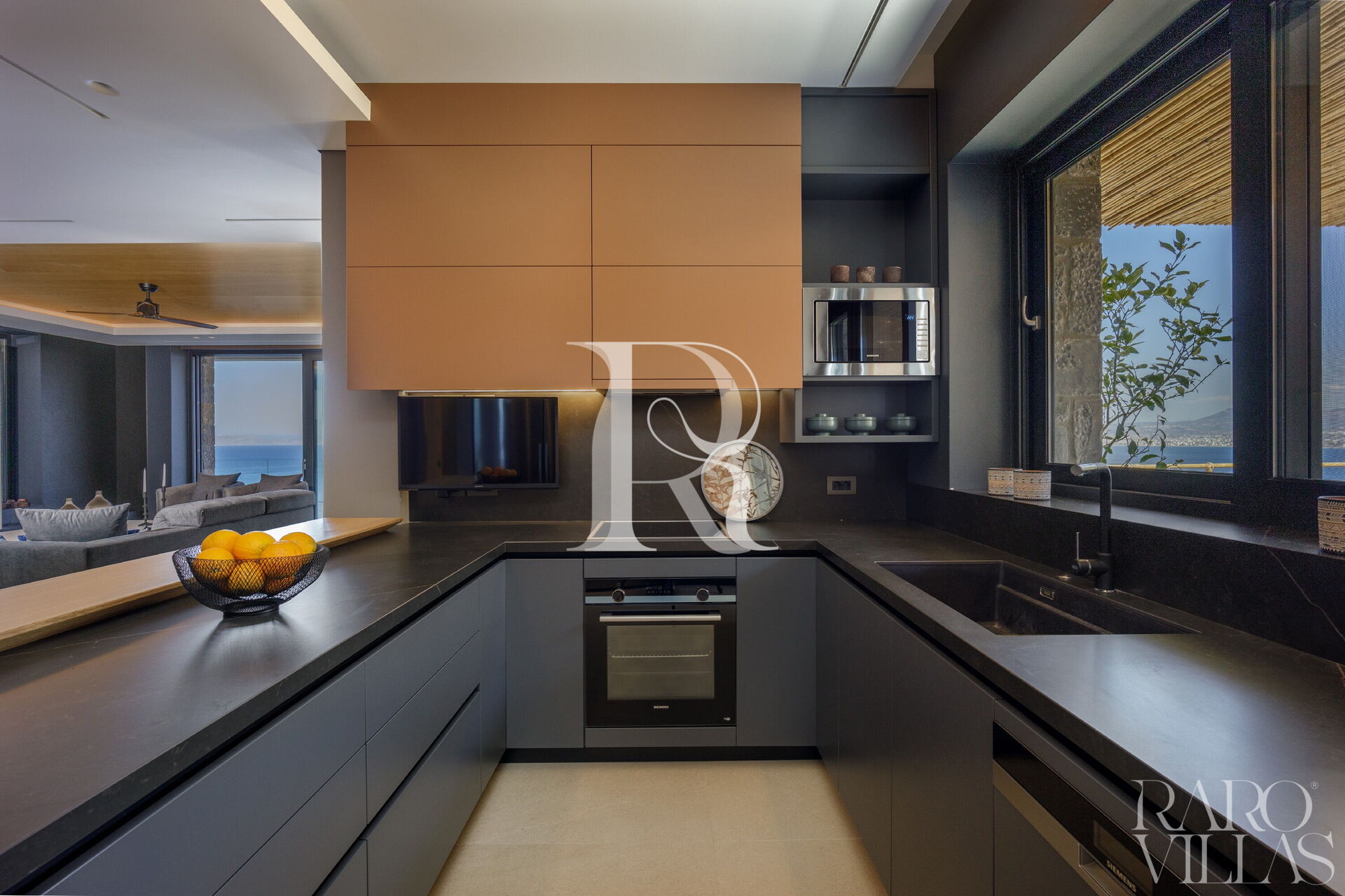 Nereid Luxury Villa consisting of 3 levels, with direct access from the infinity pool and terrace area to the ground floor with its fully equipped modern kitchen with open-plan living- and dining area.