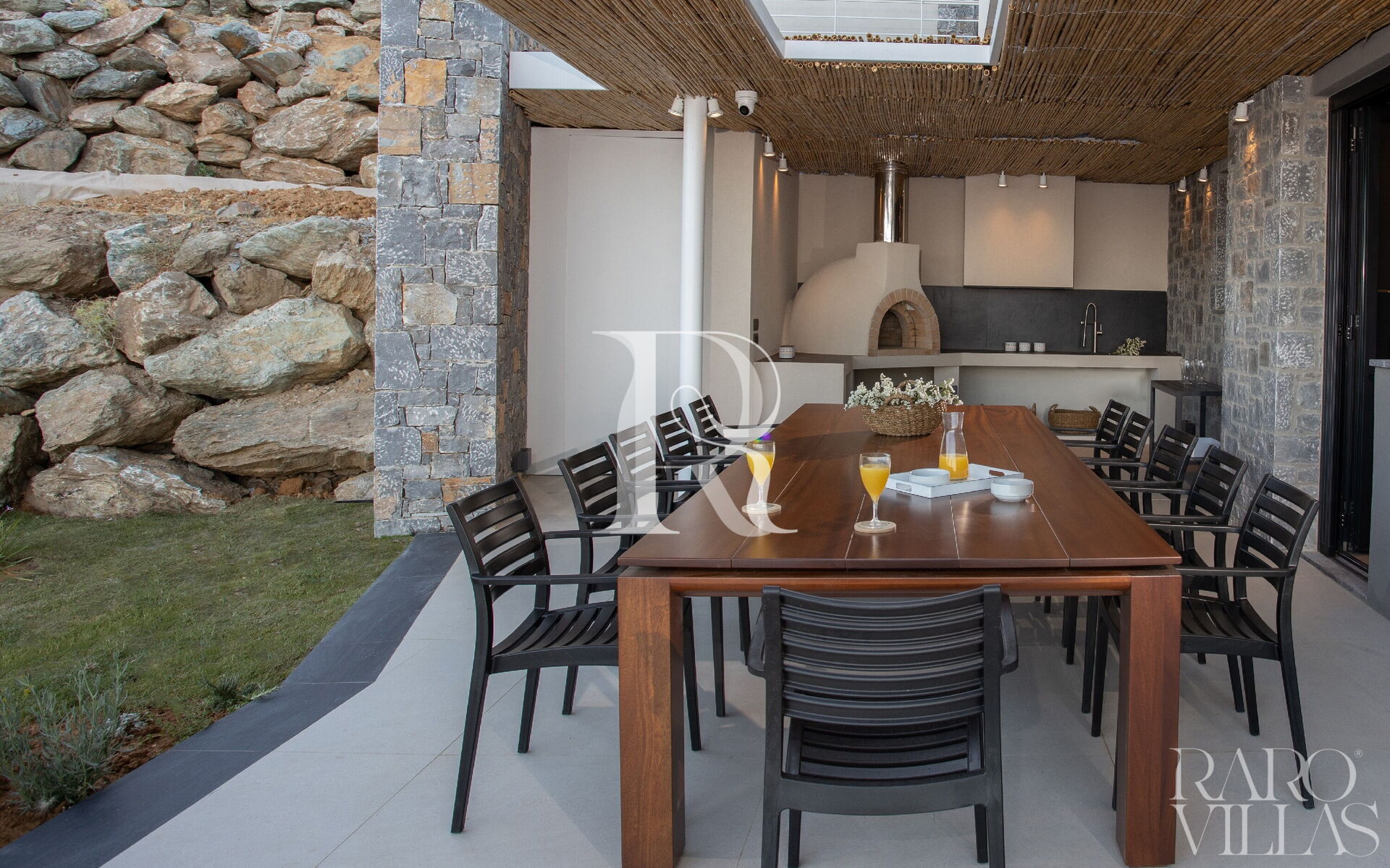 The highlight of an outside area features a 9 x 5,5 m seawater, infinity pool with an against-current swim, jacuzzi and waterfall jet. (Pool depth varies from 1,05 m to 1,80 m; heating is available on request). This space offers wooden & metal sun-loungers, open-air showers and roofed sitting area with a ceiling swing chair with a stunning sea view.