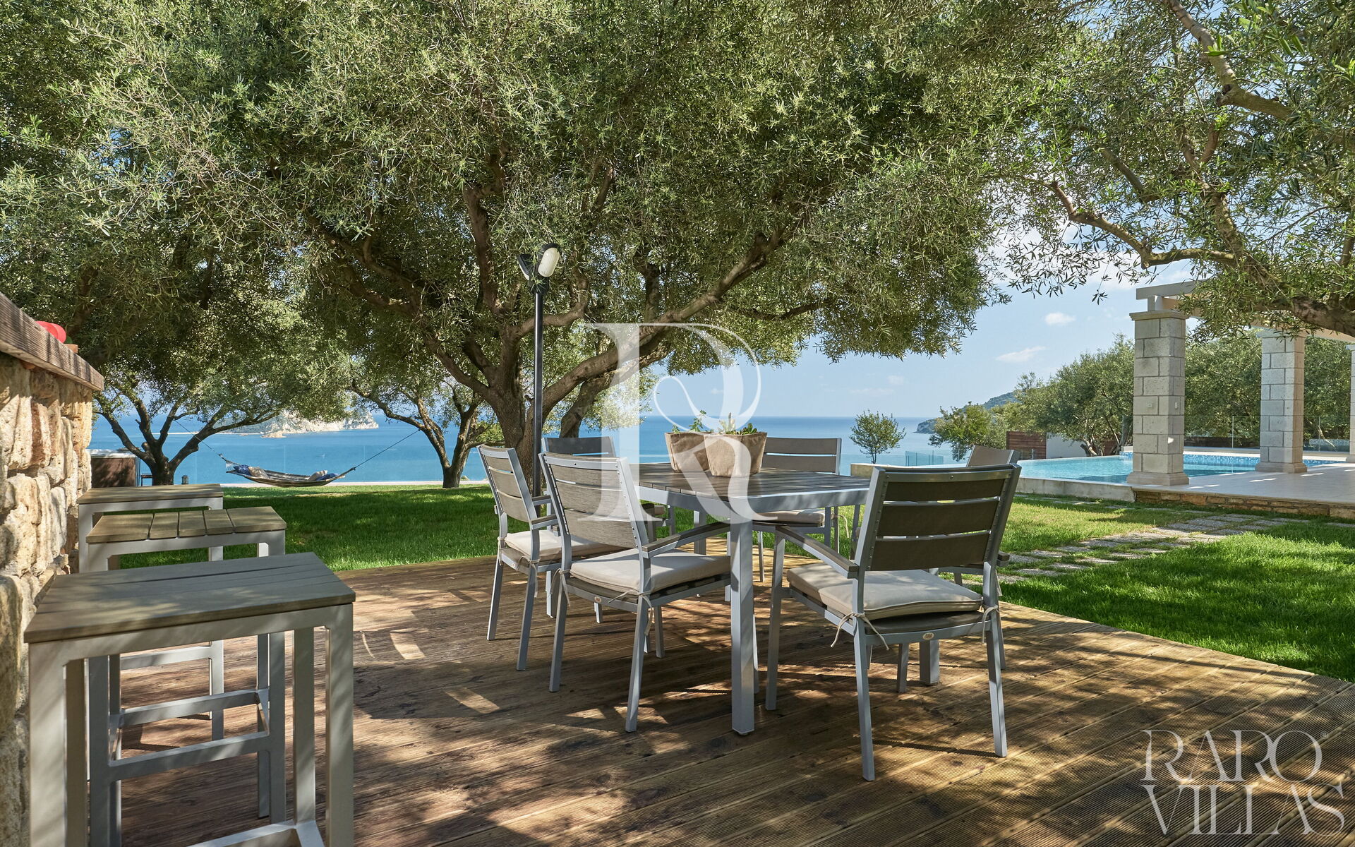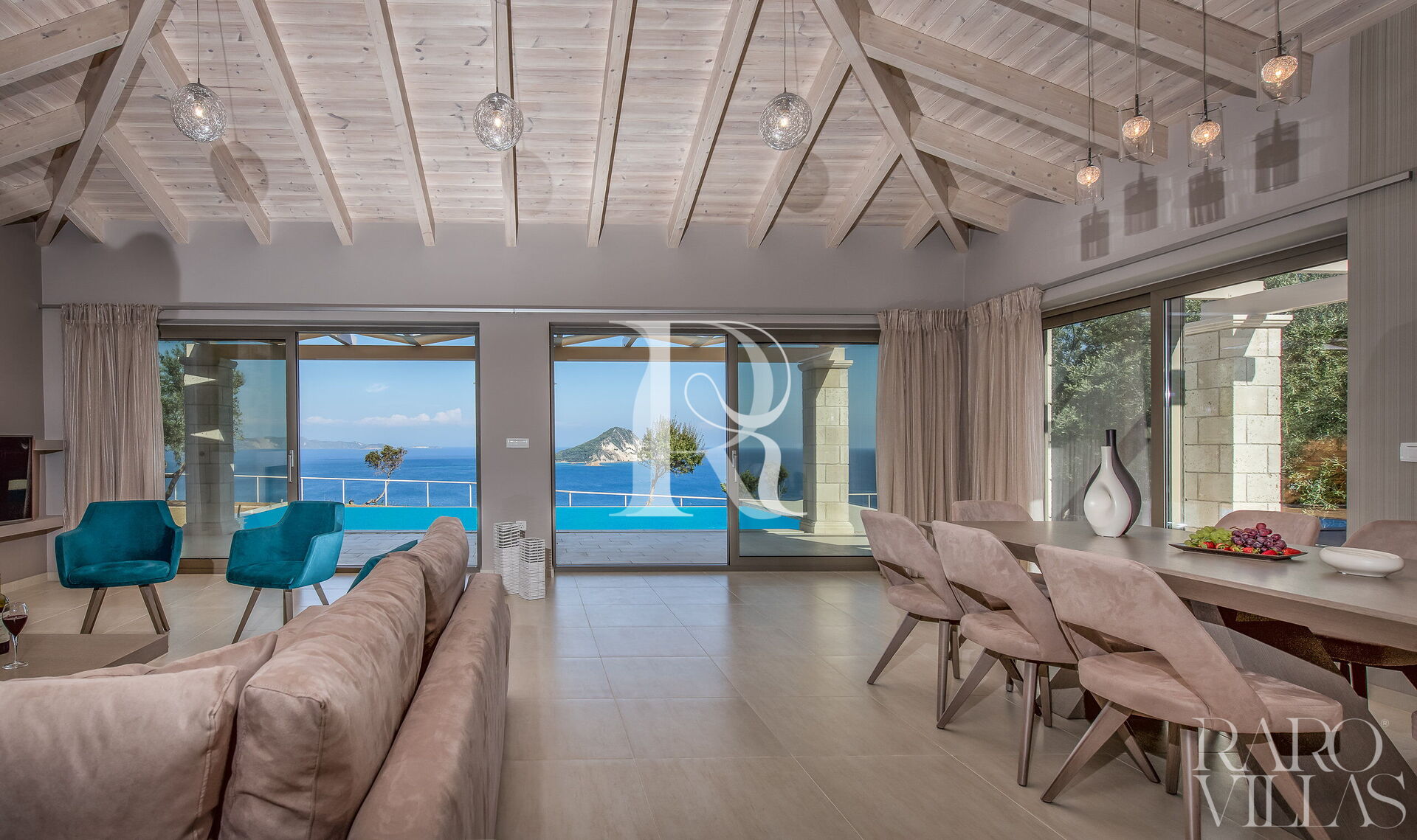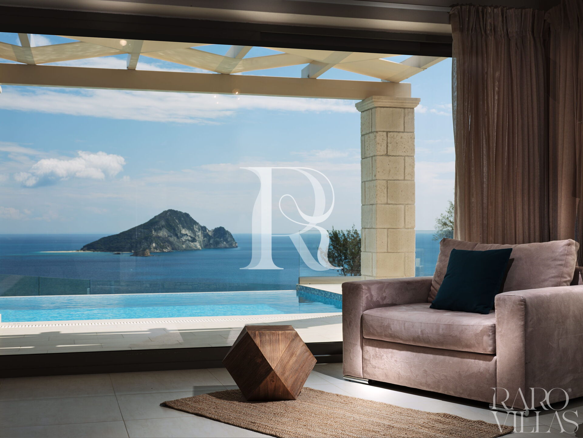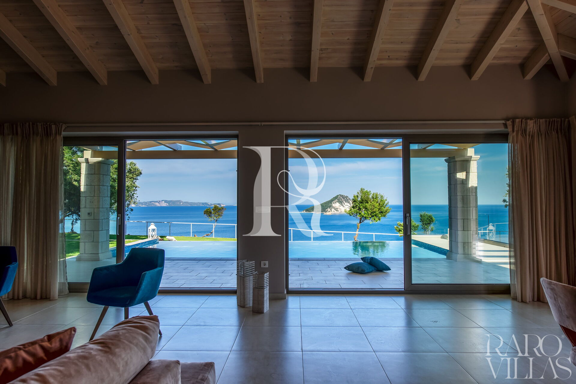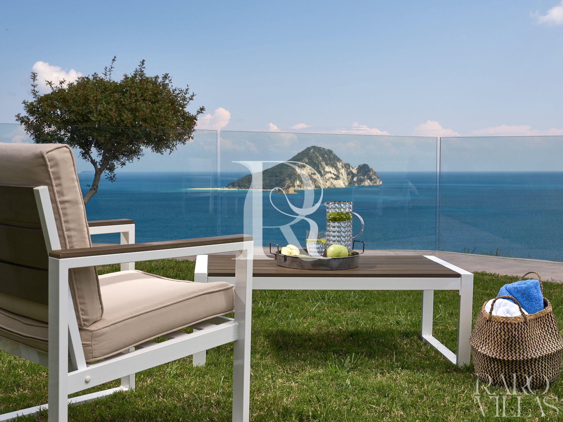 From the living room you have access to the veranda with a panoramic view of the Ionian Sea and the island of Marathonisi. At the foot of the veranda you will find a private swimming pool surrounded by a lush garden with various outdoor seating where you can enjoy the beautiful days.