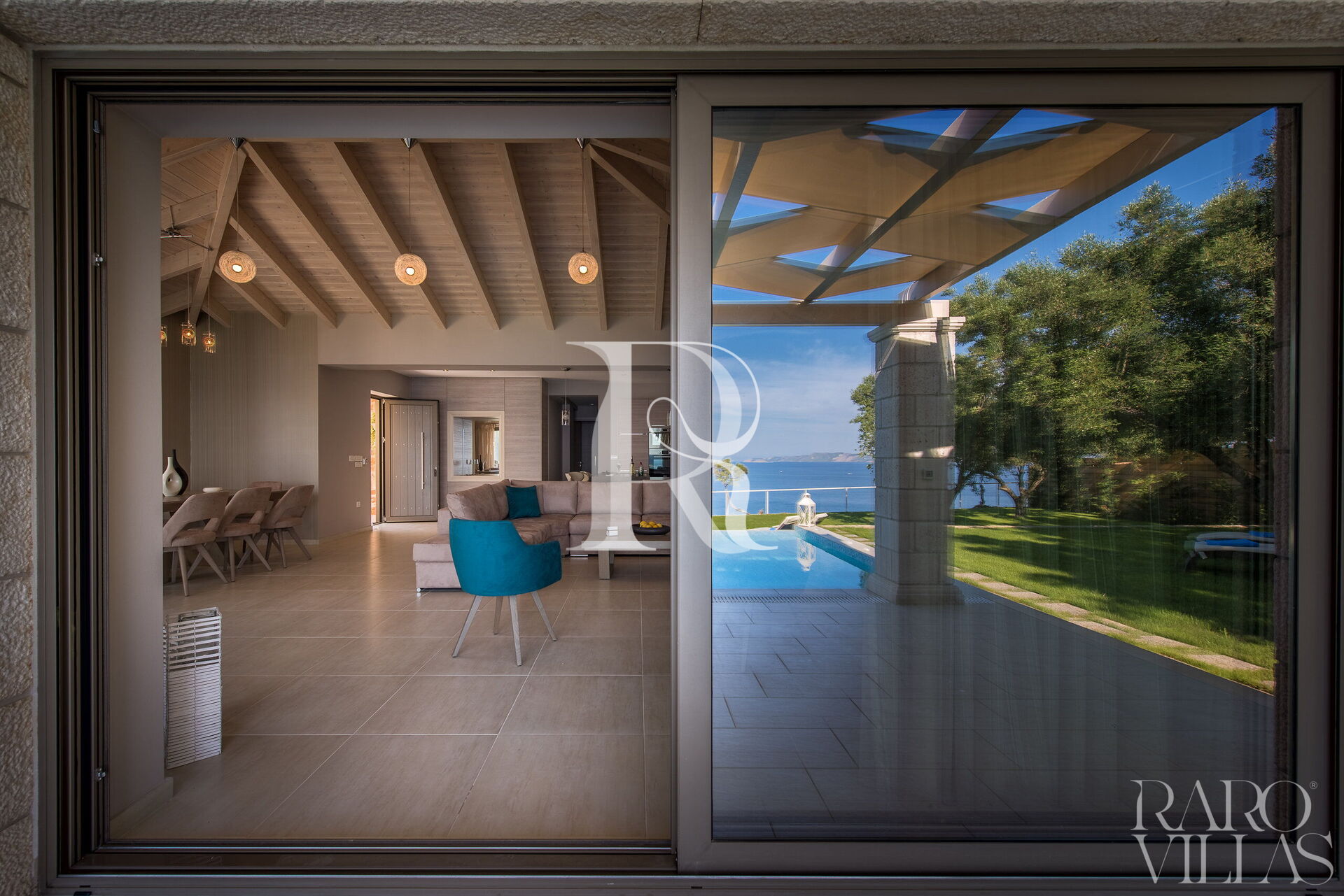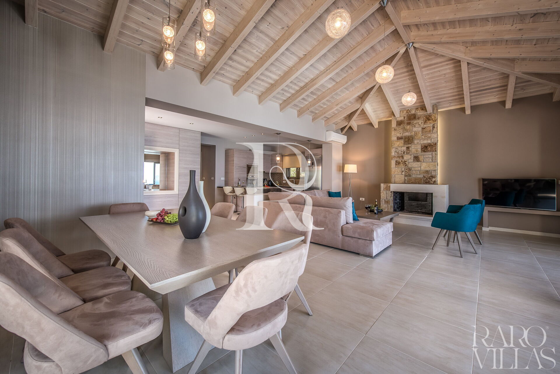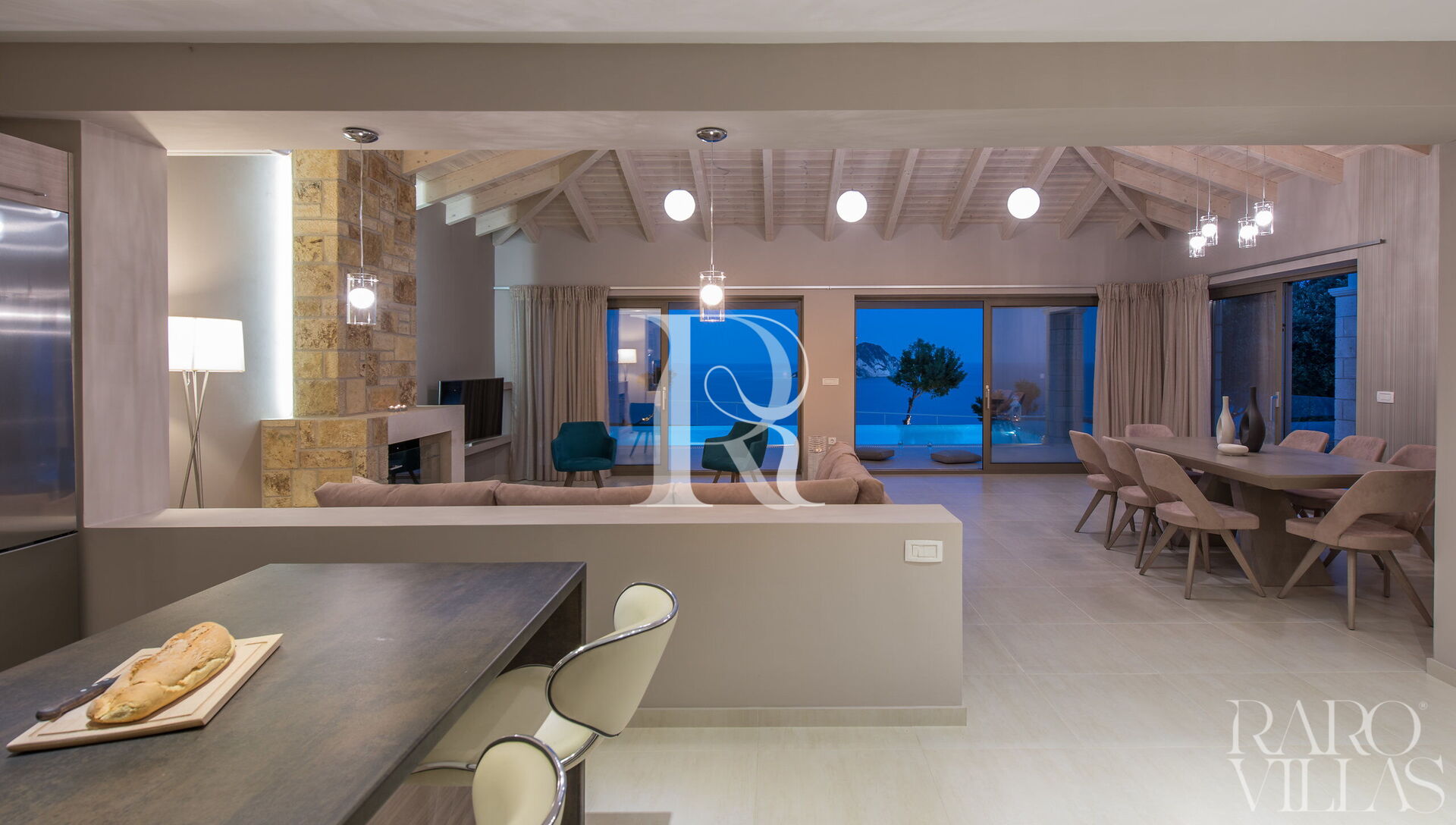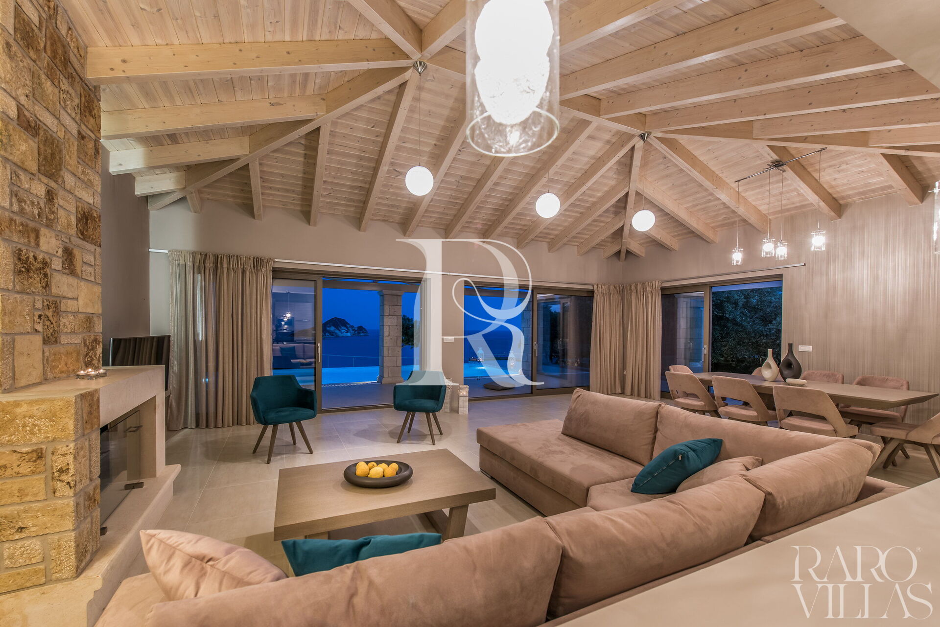 Villa Zacinto is surrounded by large doors/windows with sea views and overlooking the garden with private pool. To reach the entrance you will have to climb 5 steps and once inside you will find yourself in the living area. The large living room has a large sofa where you can relax as well as 2 armchairs, a large dining table, a fireplace and 3 large French doors with access to the veranda and a breathtaking view.