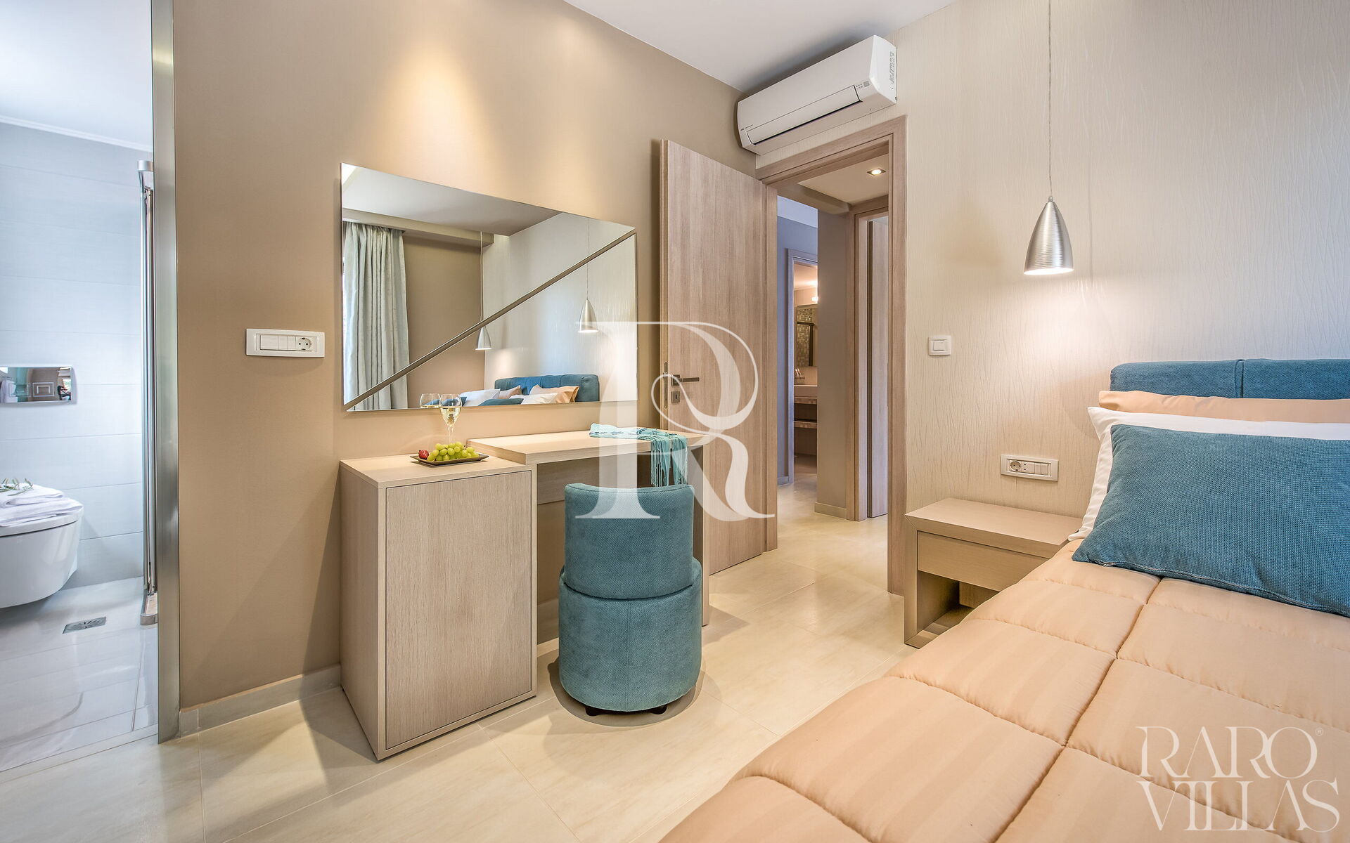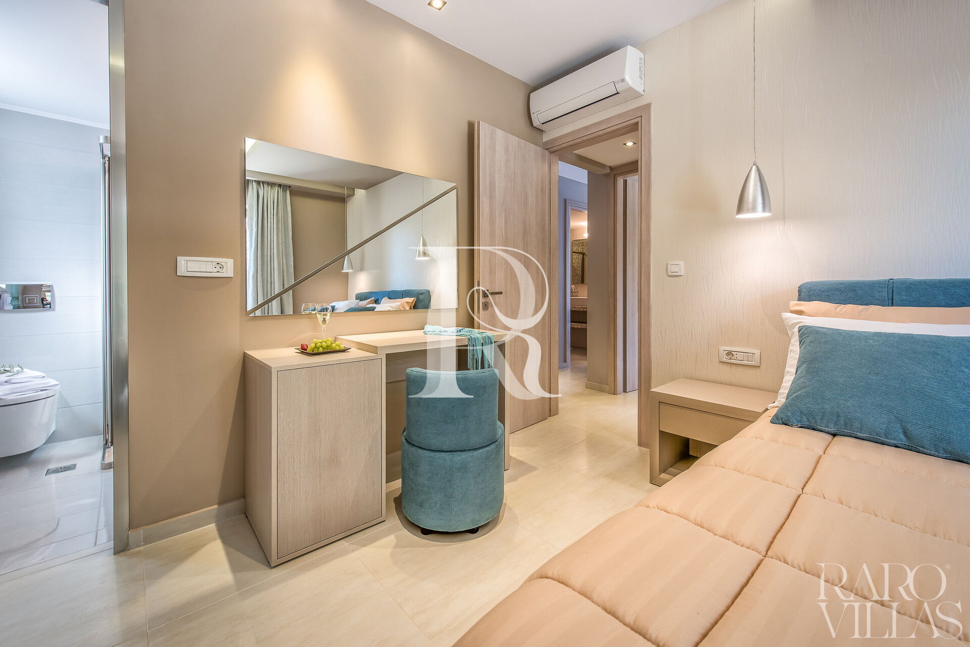 The third and last bedroom has a queen-size bed with a comfortable headboard, a desk with an armchair, a wardrobe and a television. It also has two bedside tables, air conditioning, wardrobes, a mirror in the room and an en-suite bathroom complete with toilet, bidet, shower and washbasin.
