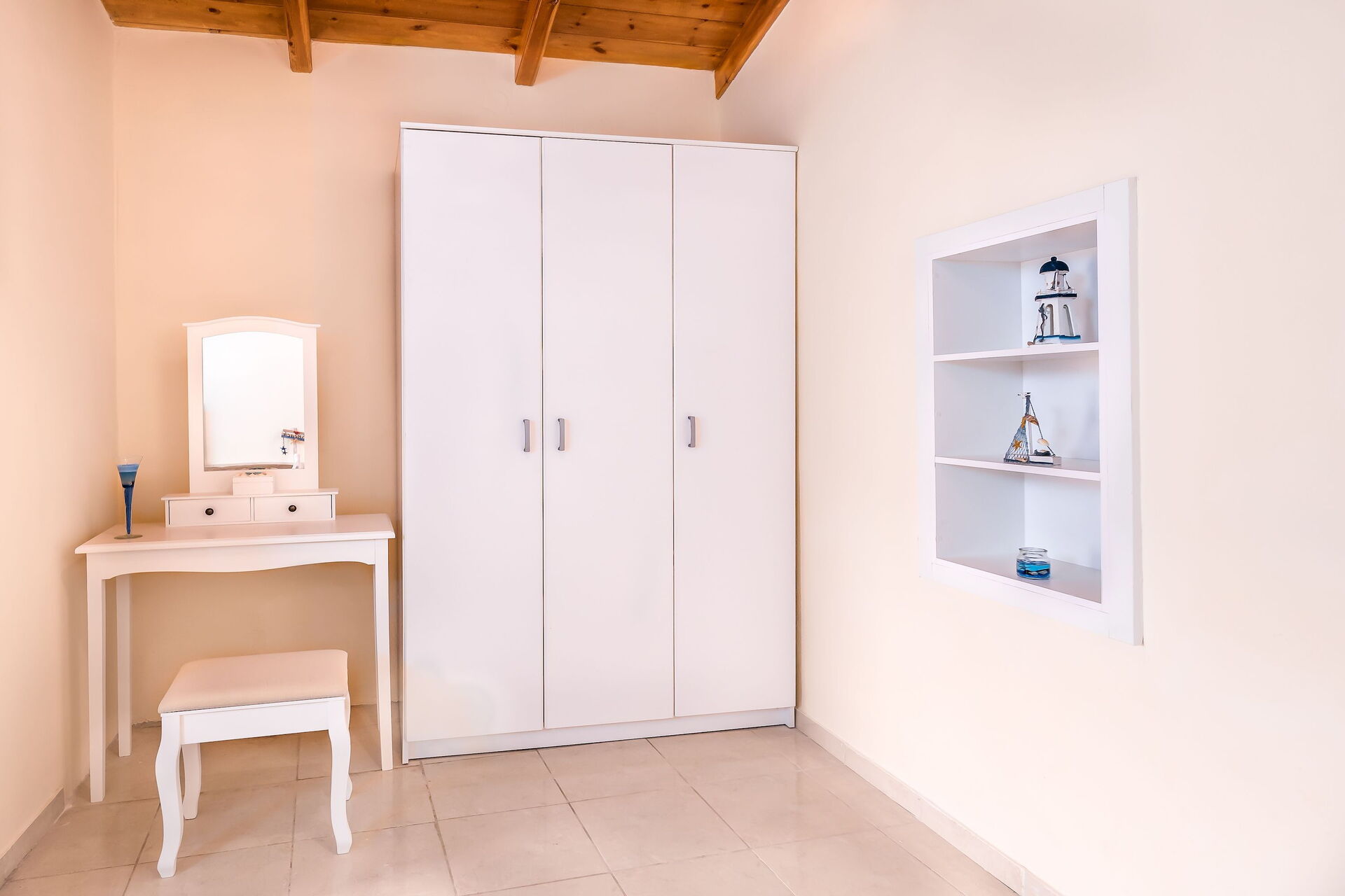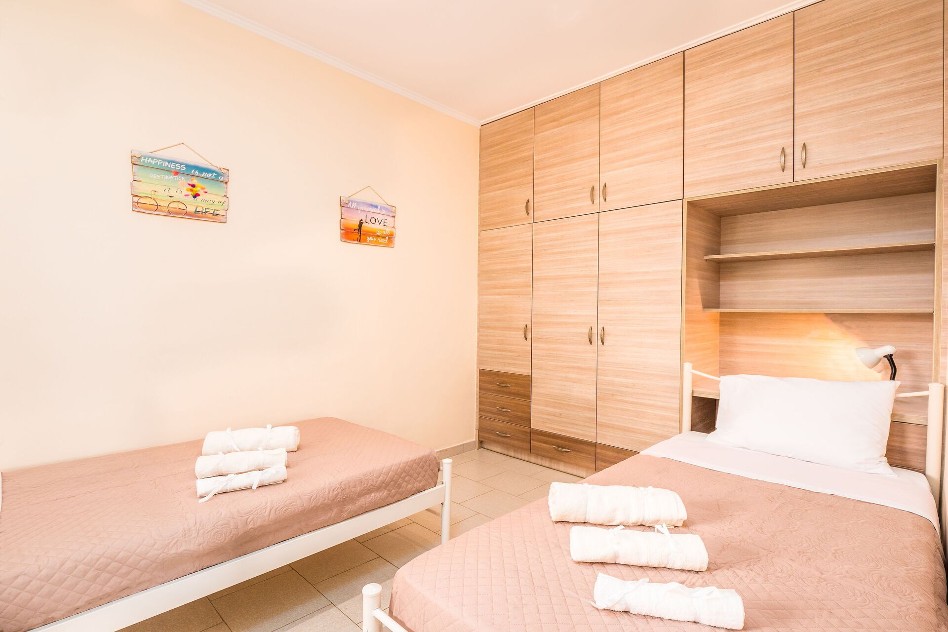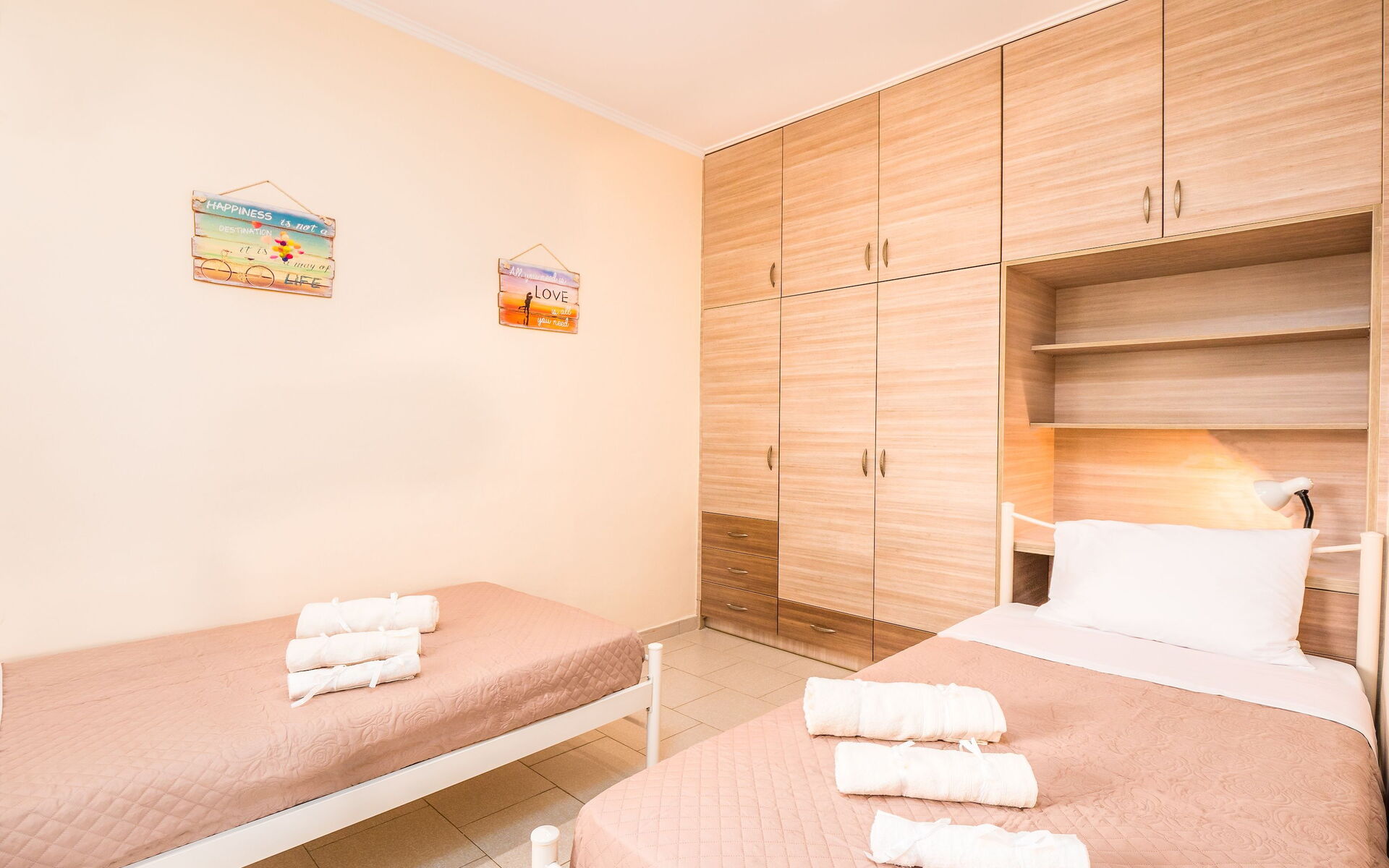 First floor: twin bedroom (air-conditioned), double bedroom (air-conditioned, access to terrace), double bedroom (air-conditioned, access to terrace), large bedroom with bunkbed (air-conditioned, access to terrace, writing desk), bathroom with shower.