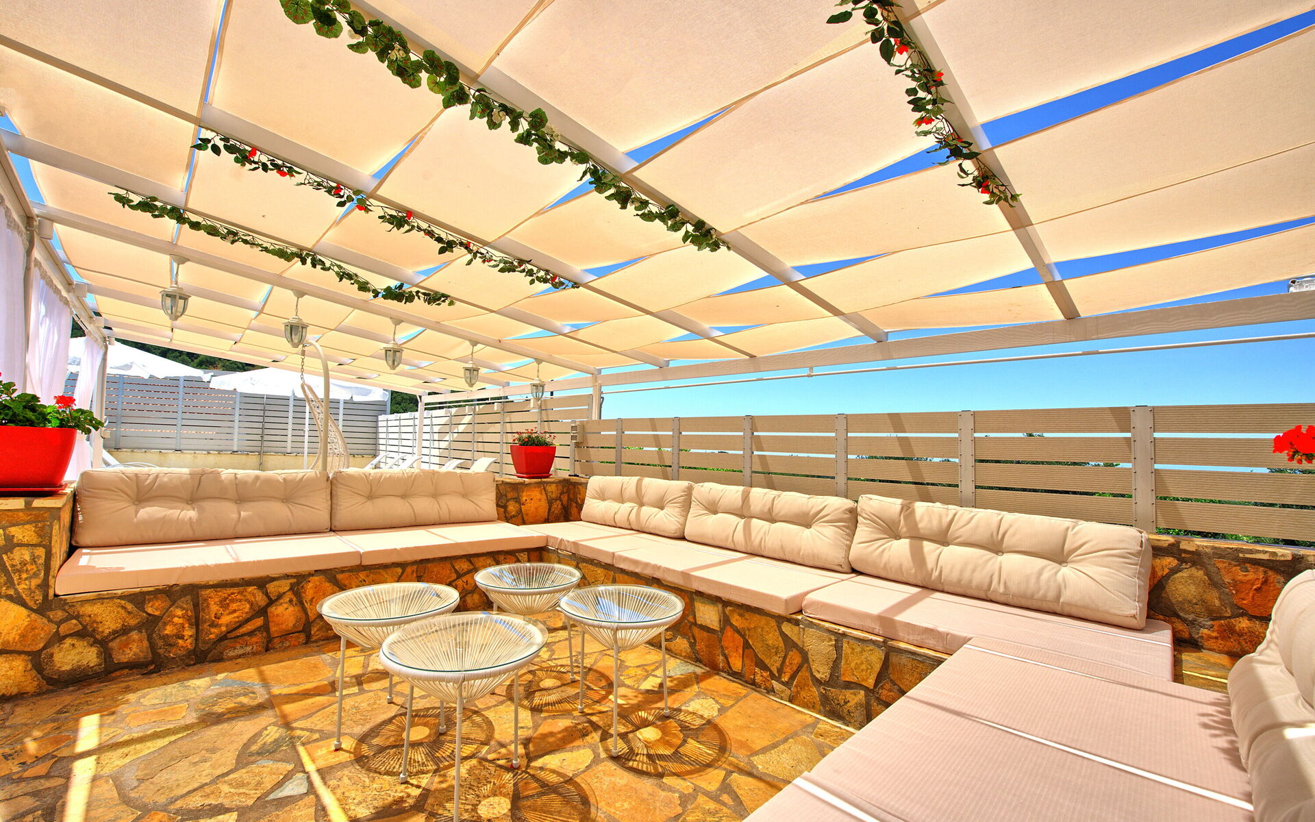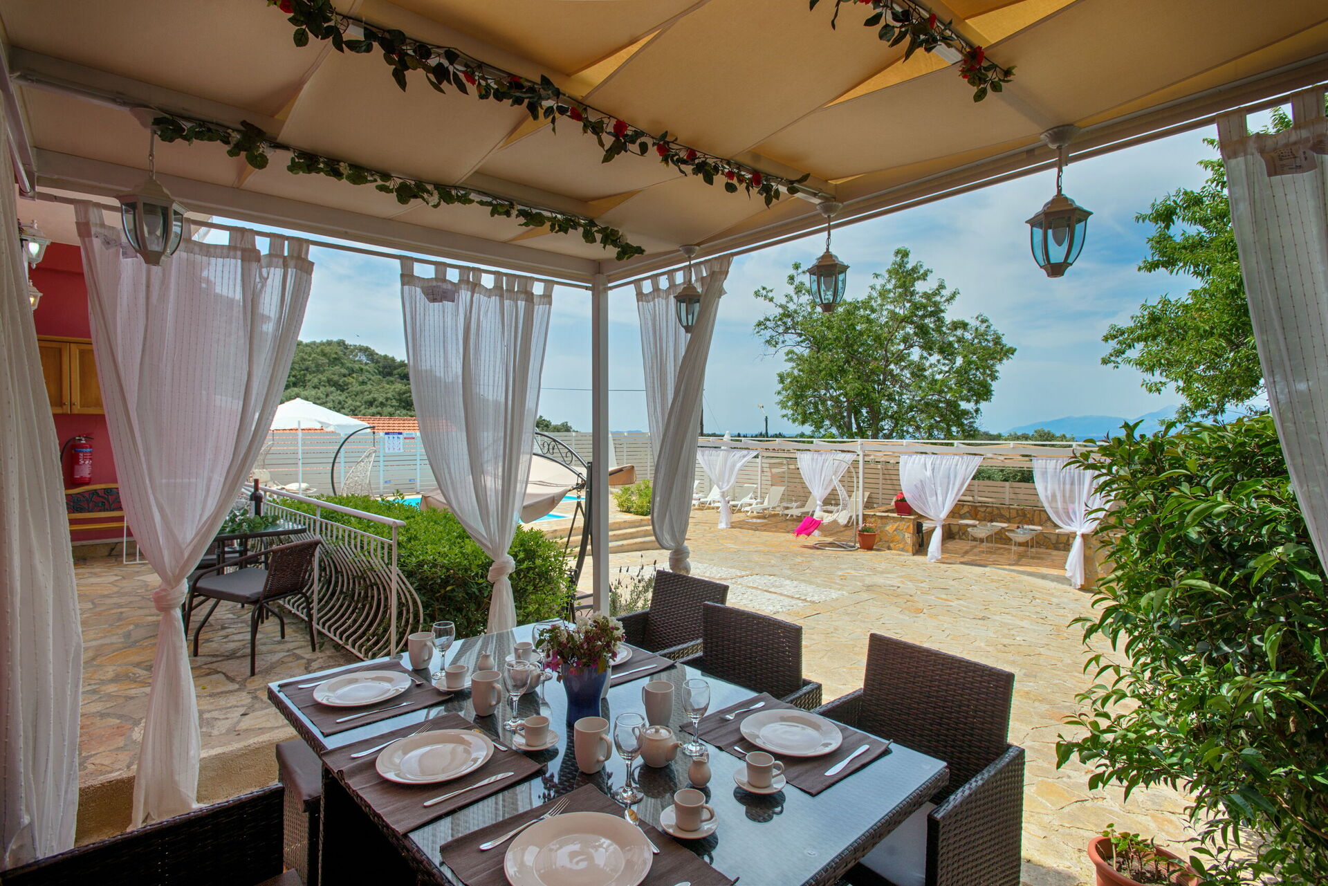 Enjoy a delicious meal grilled using the brick-built barbecue provided (there is a large table with chill-out area under the gazebo), soak up in the sun, or just read a book in the terrace while enjoying the views... The outdoor areas are beautifully lit at night for extra enjoyment during the evenings.
