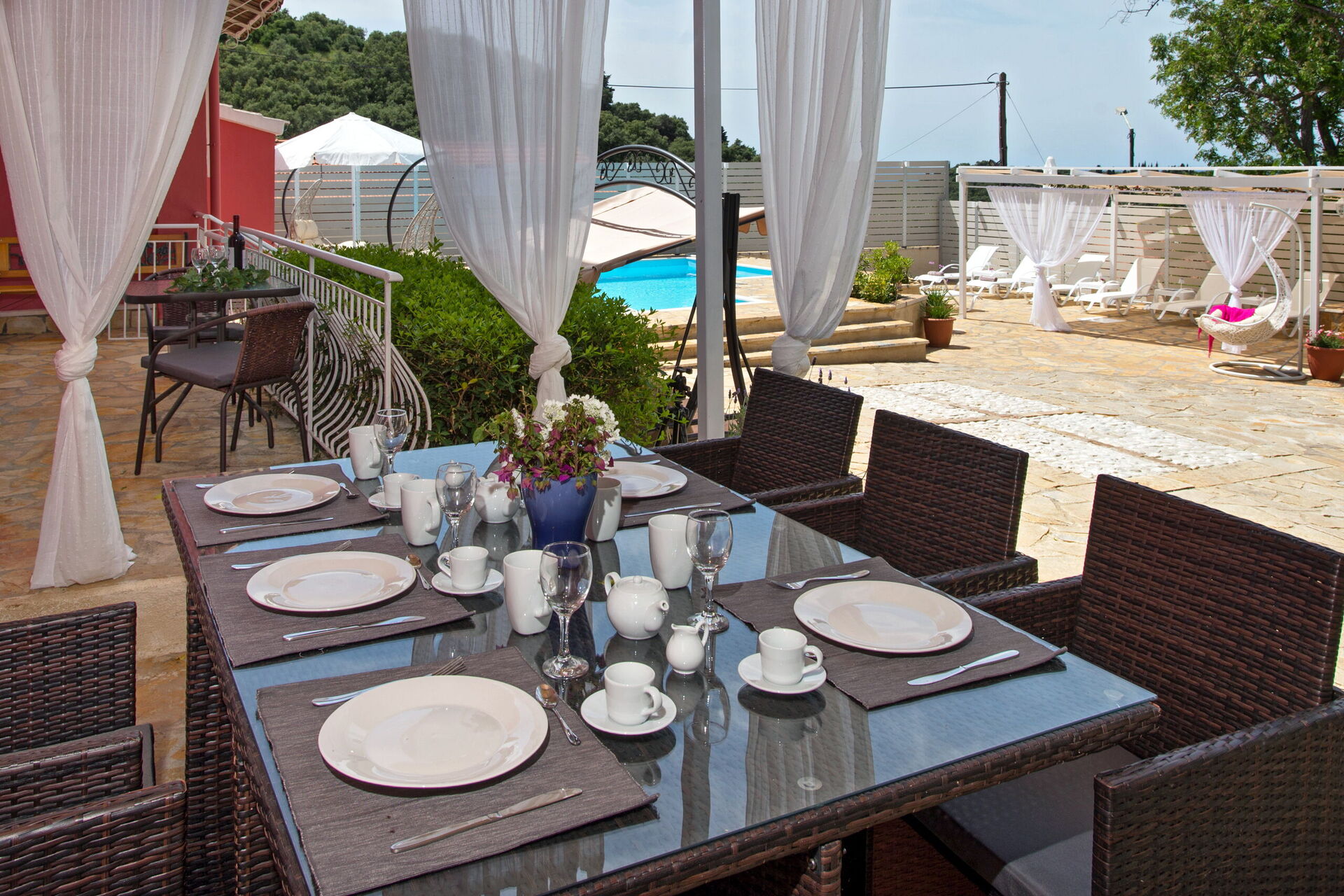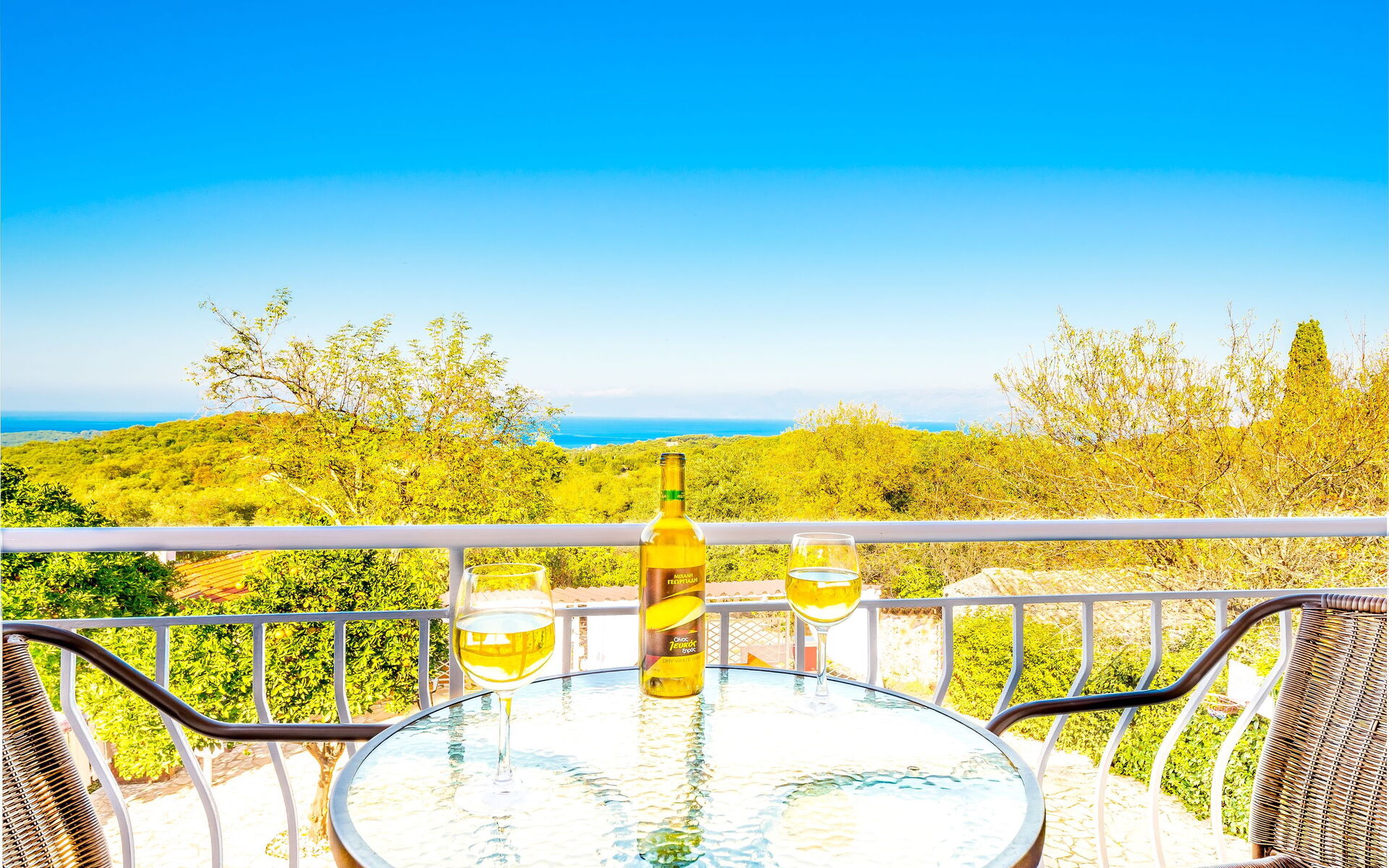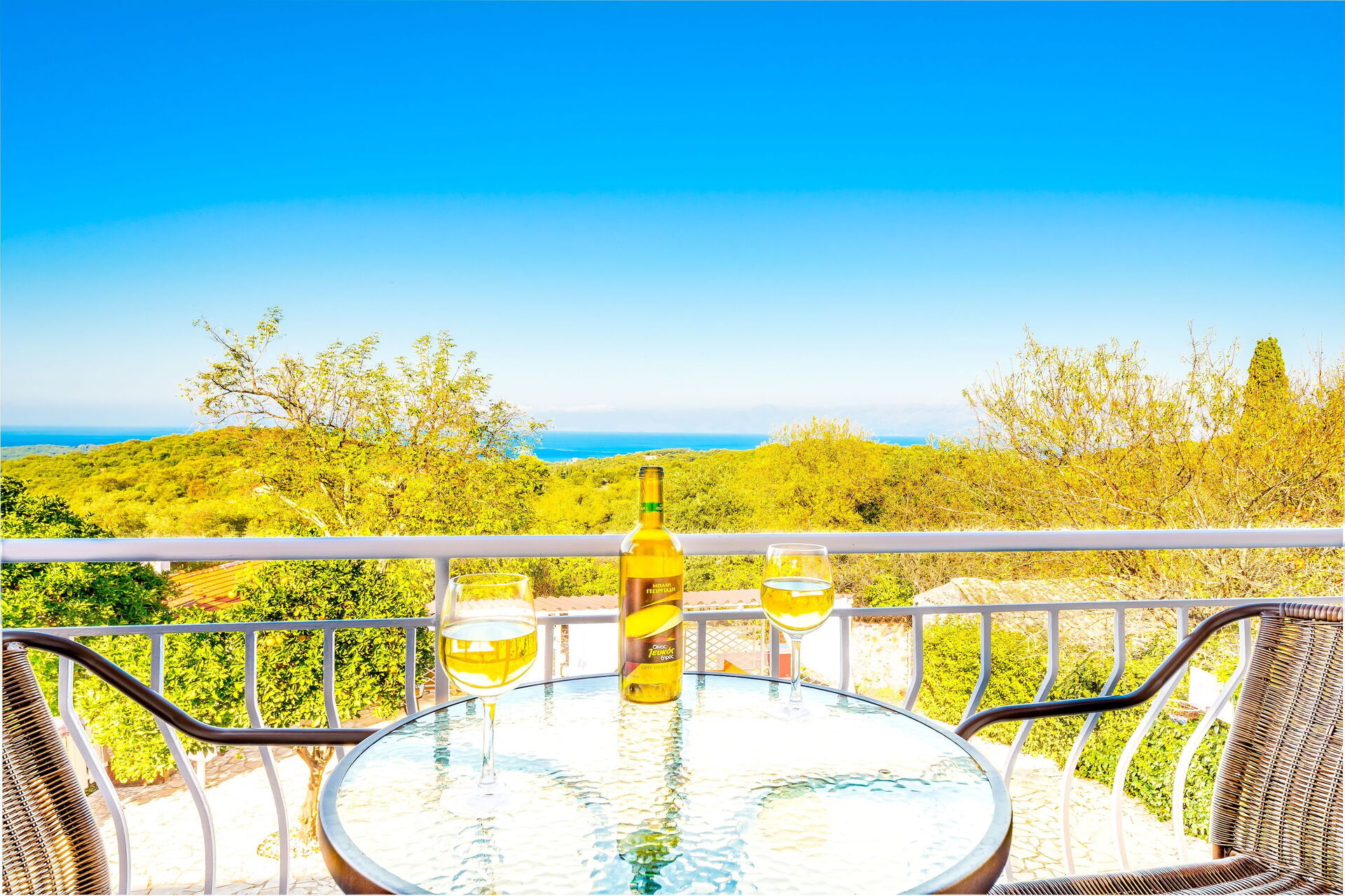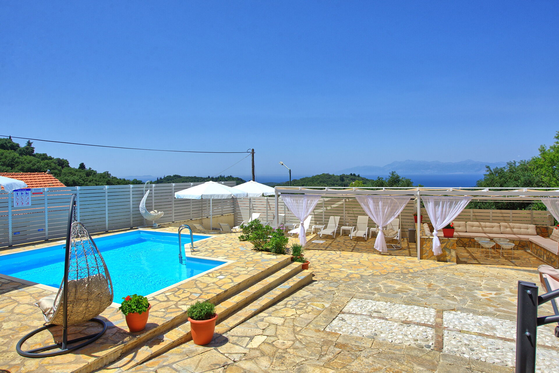 Inside, the villa is set over 2 floors and has been carefully restored to maintain all its traditional feeling yet offering all the most modern comforts. On the ground floor there is a spacious lounge (sofa, dining table, satellite TV, DVD player, fireplace, wi-fi internet), a top-class built-in kitchen (oven, microwave, 4 cooking rings, fridge/freezer, dishwasher, dining table), a large family bathroom with bathtub. On the ground floor there is also an annex, with independent entrance, perfect for a couple looking for more privacy. It has air-conditioning, double bed and its own bathroom with shower. An impressive staircase with glass ceiling leads up from the lounge to the upper floor, where the main sleeping area is located. There are 4 air-conditioned bedrooms (2 doubles, 2 twins) together with a family bathroom with shower. 3 of the bedrooms open straight to a beautiful terrace at the front of the villa providing unobstructed views over the gardens, the church of Agios Ilias and the blue Mediterranean Sea.