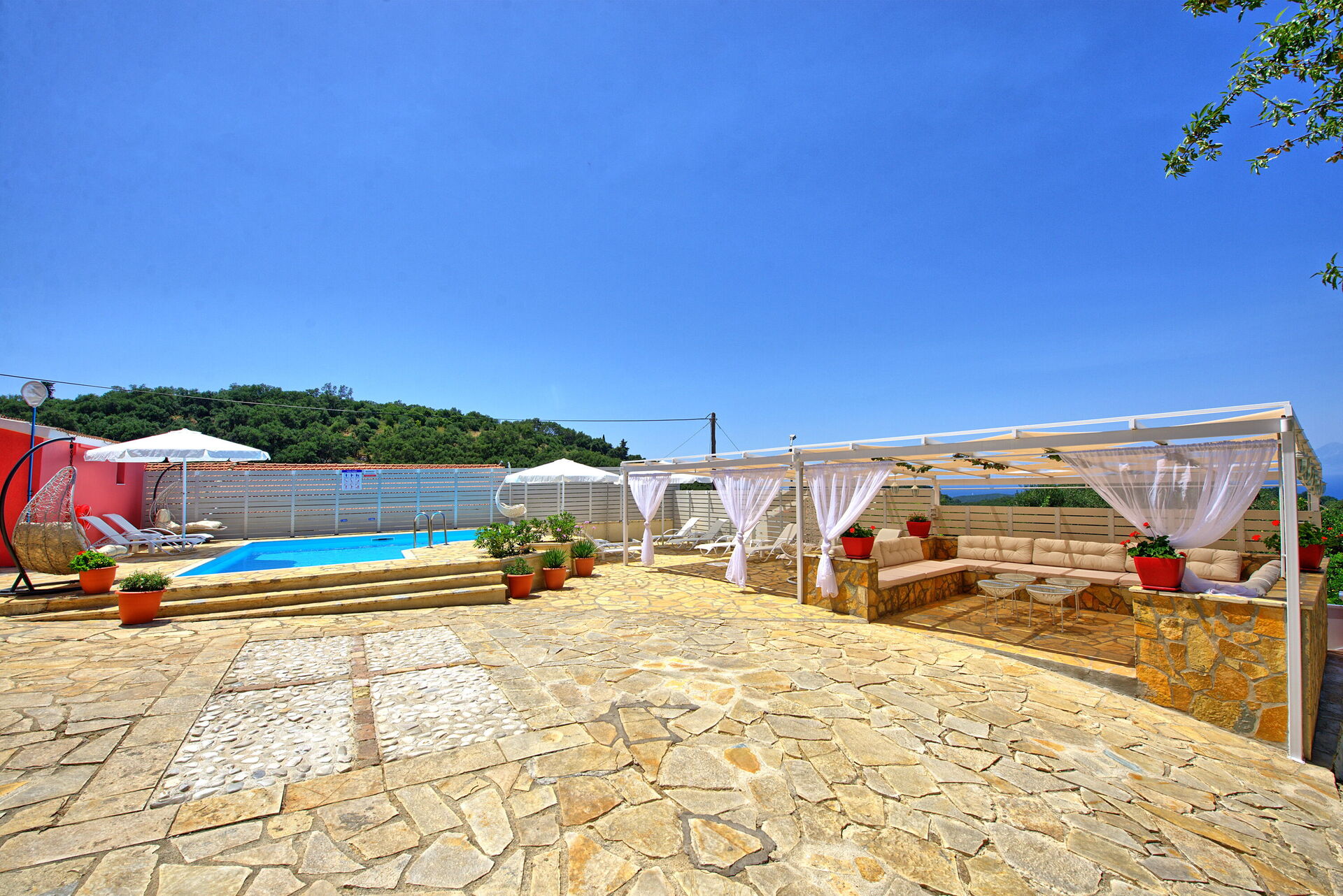 Outside, the villa has extensive terraces and paved patios of more than 500sqm, reserved for the exclusive use of the guests: relaxation and peace in deep contact with the Greek nature and lifestyle are guaranteed!