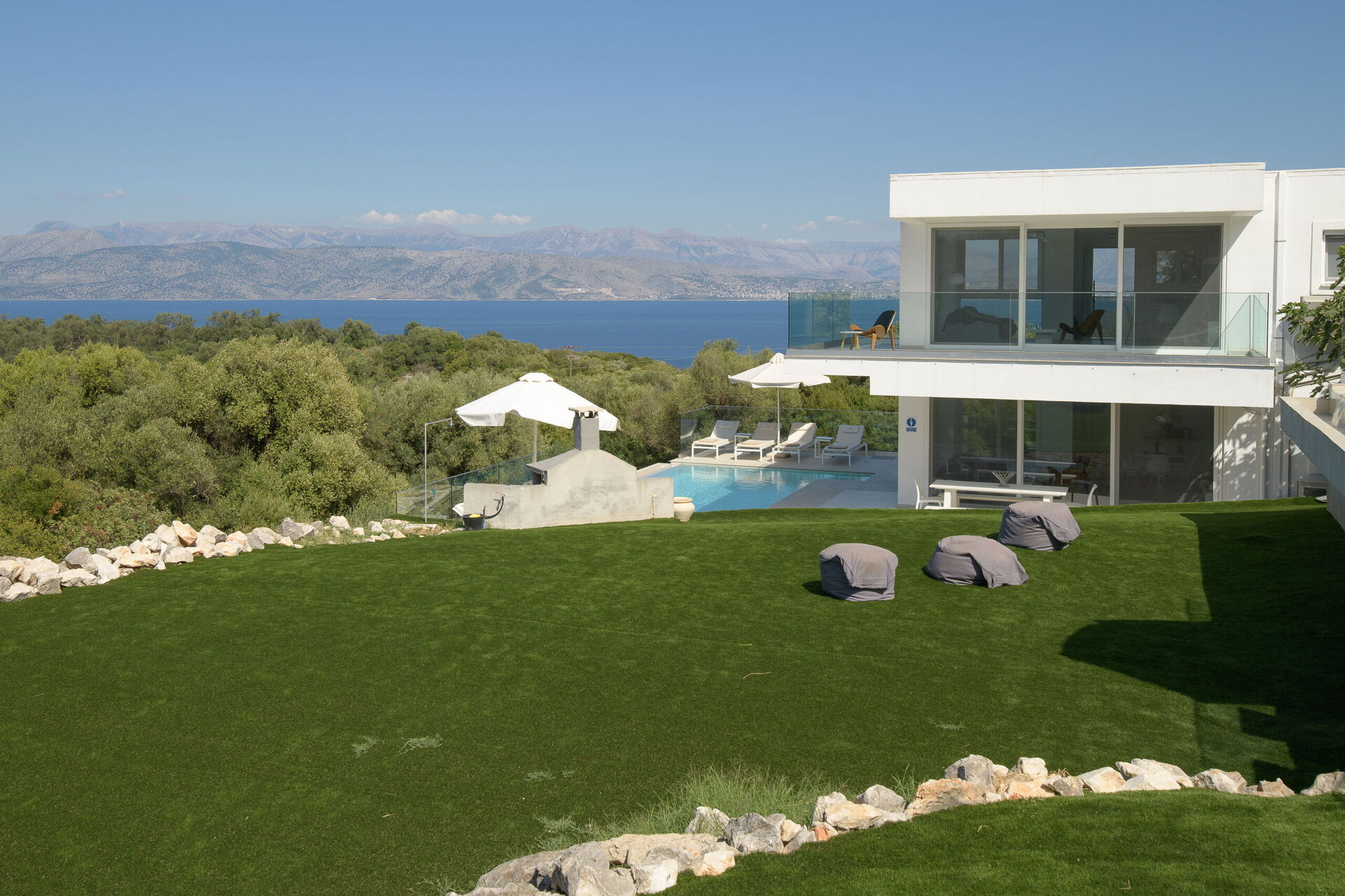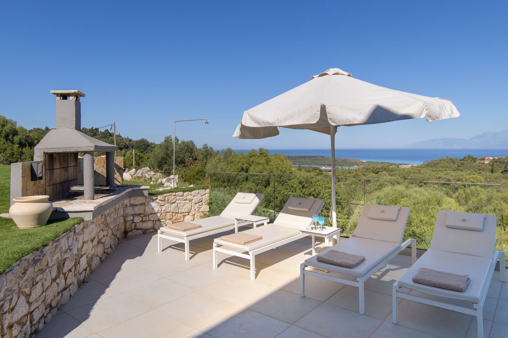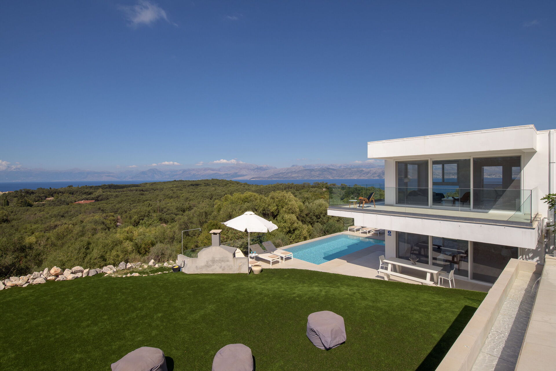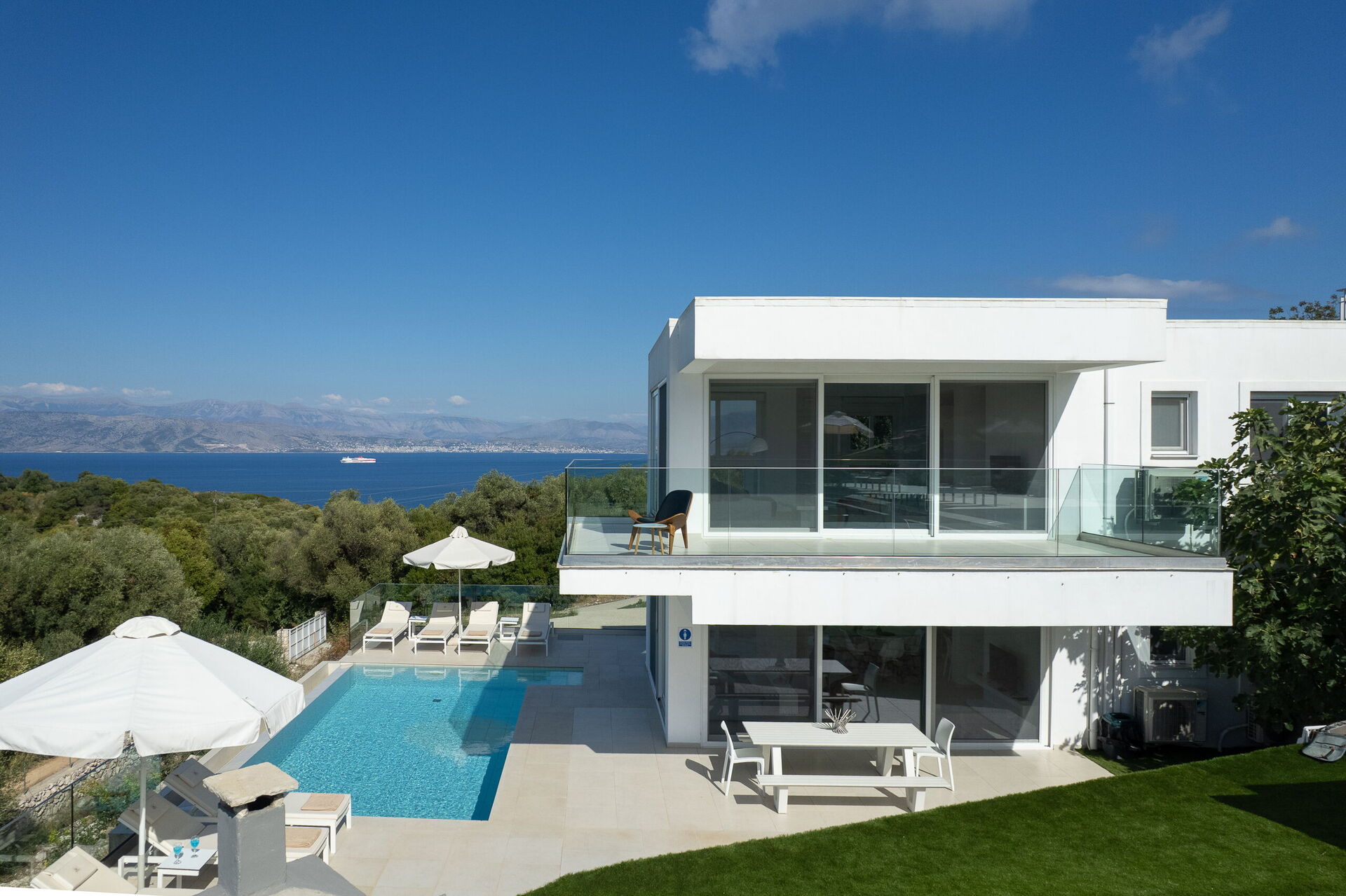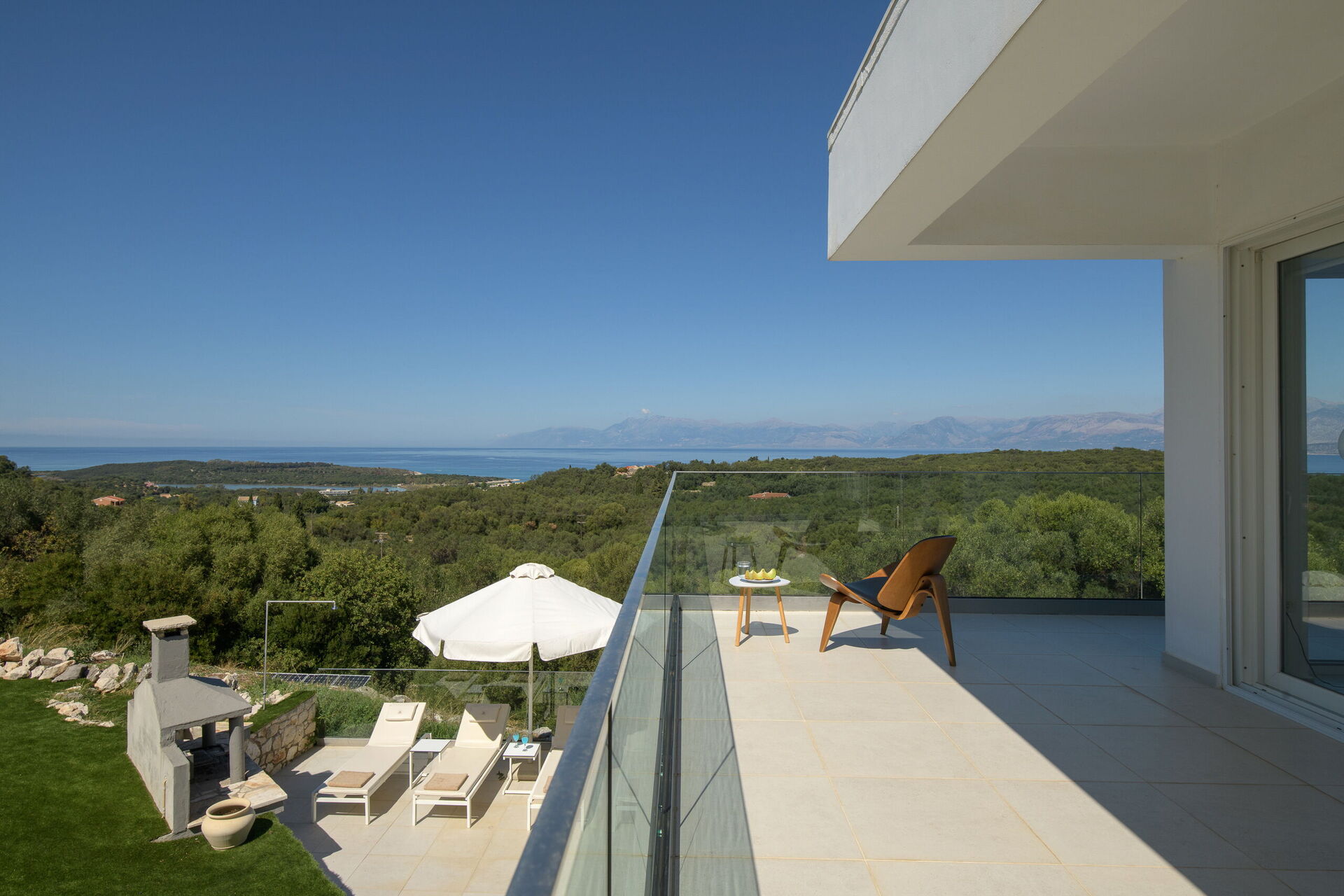 Inside, this villa is set over 2 floors connected via a side staircase. With huge patio doors, large windows, and designer furniture, Villa Naksika enjoys all the sun and light that Greece can offer. On the ground floor there is a spacious lounge (sofas, wi-fi, air-conditioning) with adjoining kitchen (fully equipped) as well as 2 bedrooms (both en-suite). One bedroom has a double bed + a sofa (that can be turned into a full size single sofa bed) while the other bedroom is a twin. The upper floor is identical to the lower one, except that the master bedroom has just a double bed and not an extra sofa bed. Extensive terraces on both floors provide magical views over the ionian Sea and Albanian coastline beyond.