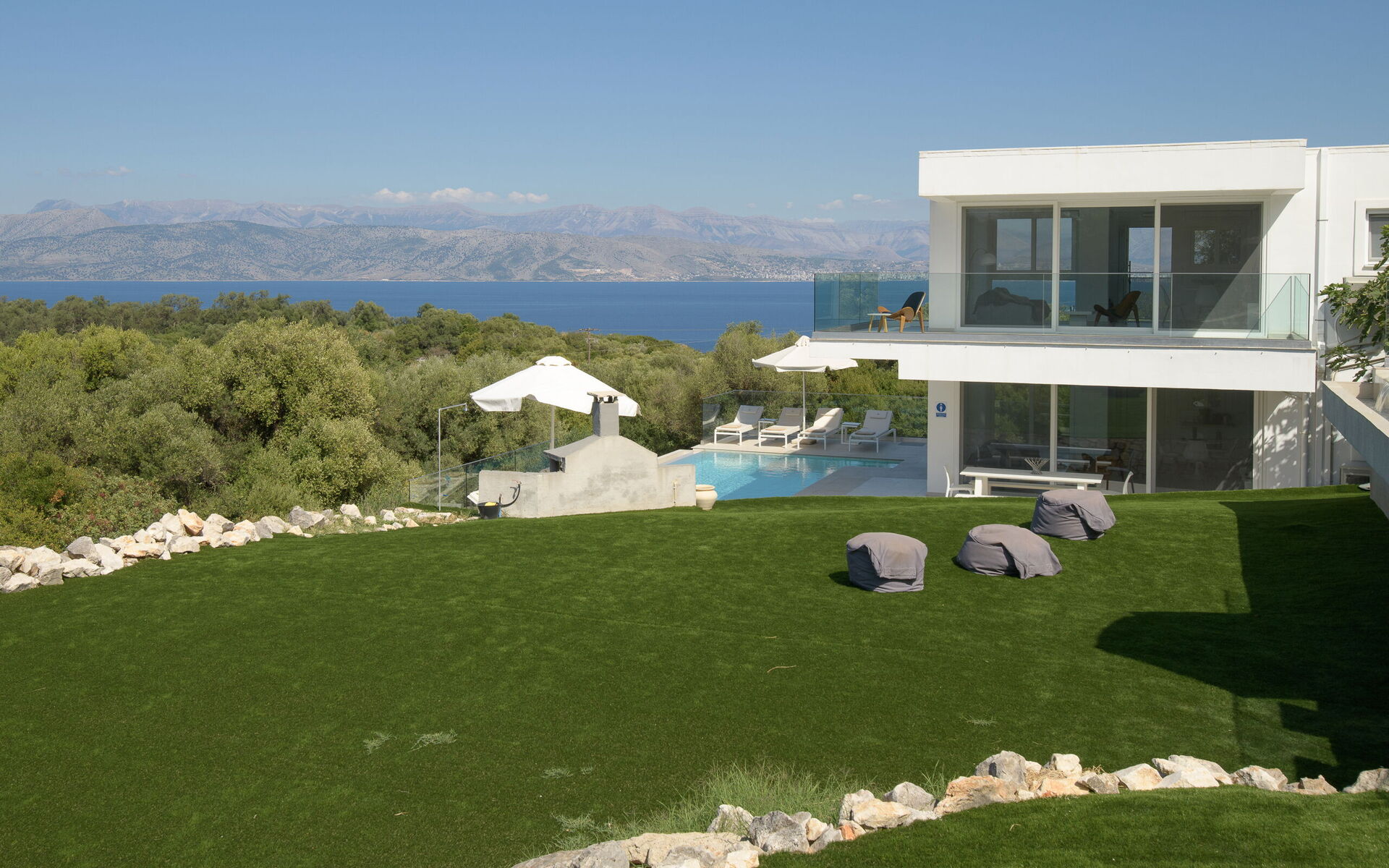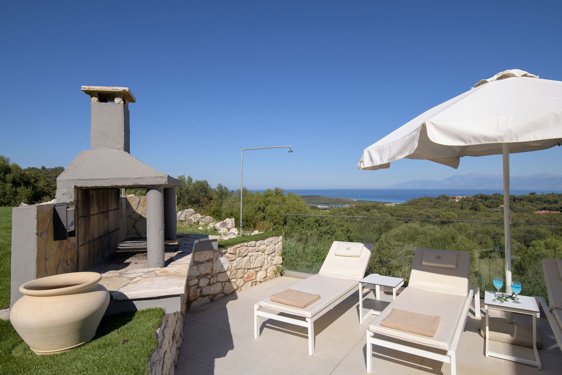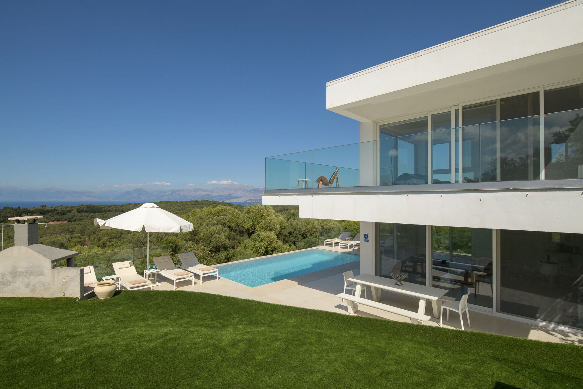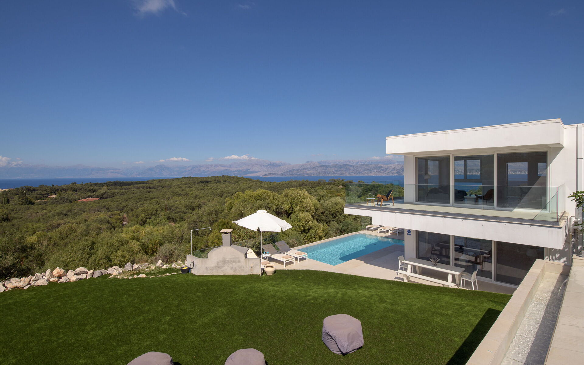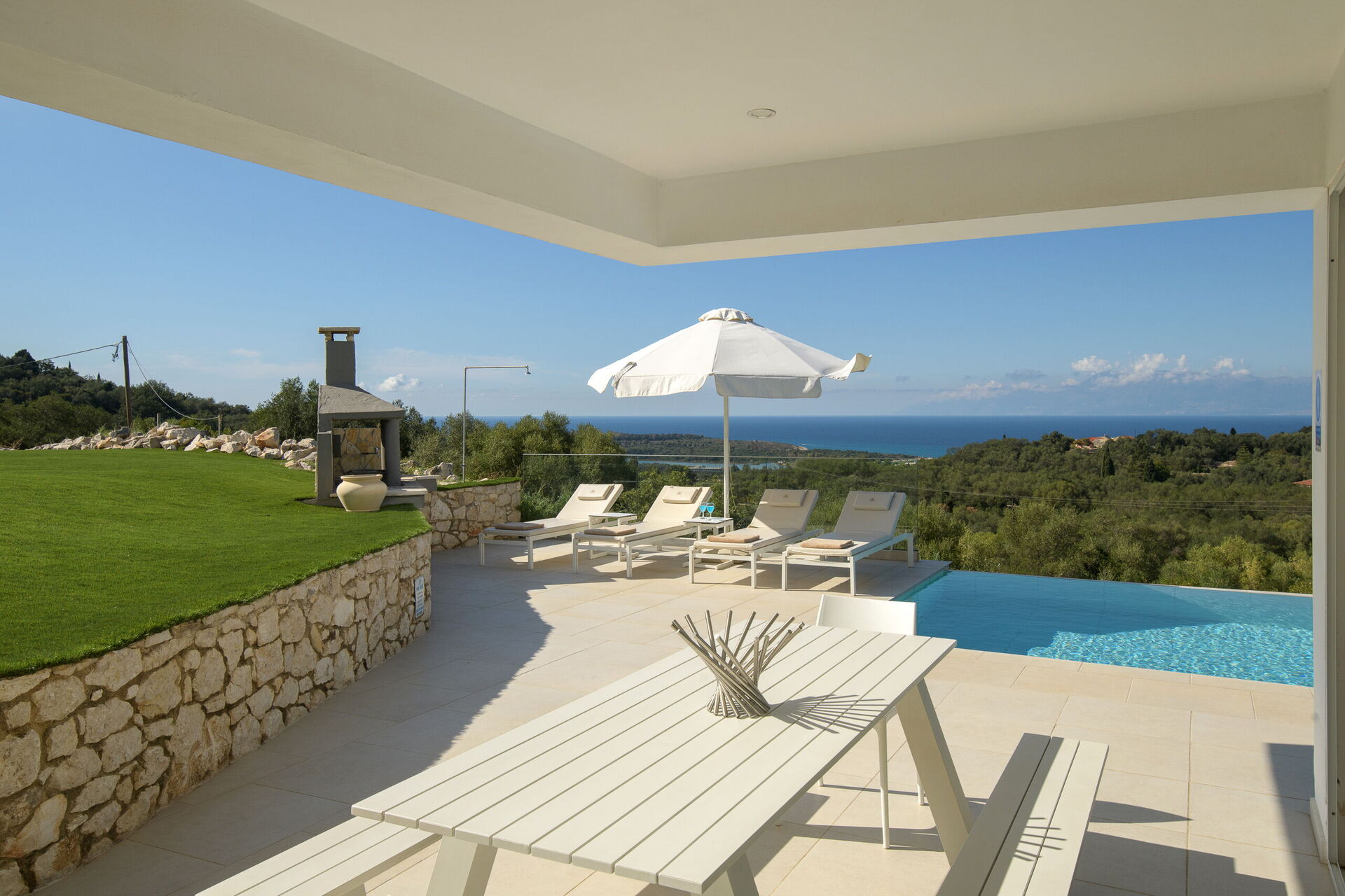 Inside, this villa is set over 2 floors connected via a side staircase. With huge patio doors, large windows, and designer furniture, Villa Naksika enjoys all the sun and light that Greece can offer. On the ground floor there is a spacious lounge (sofas, wi-fi, air-conditioning) with adjoining kitchen (fully equipped) as well as 2 bedrooms (both en-suite). One bedroom has a double bed + a sofa (that can be turned into a full size single sofa bed) while the other bedroom is a twin. The upper floor is identical to the lower one, except that the master bedroom has just a double bed and not an extra sofa bed. Extensive terraces on both floors provide magical views over the ionian Sea and Albanian coastline beyond.