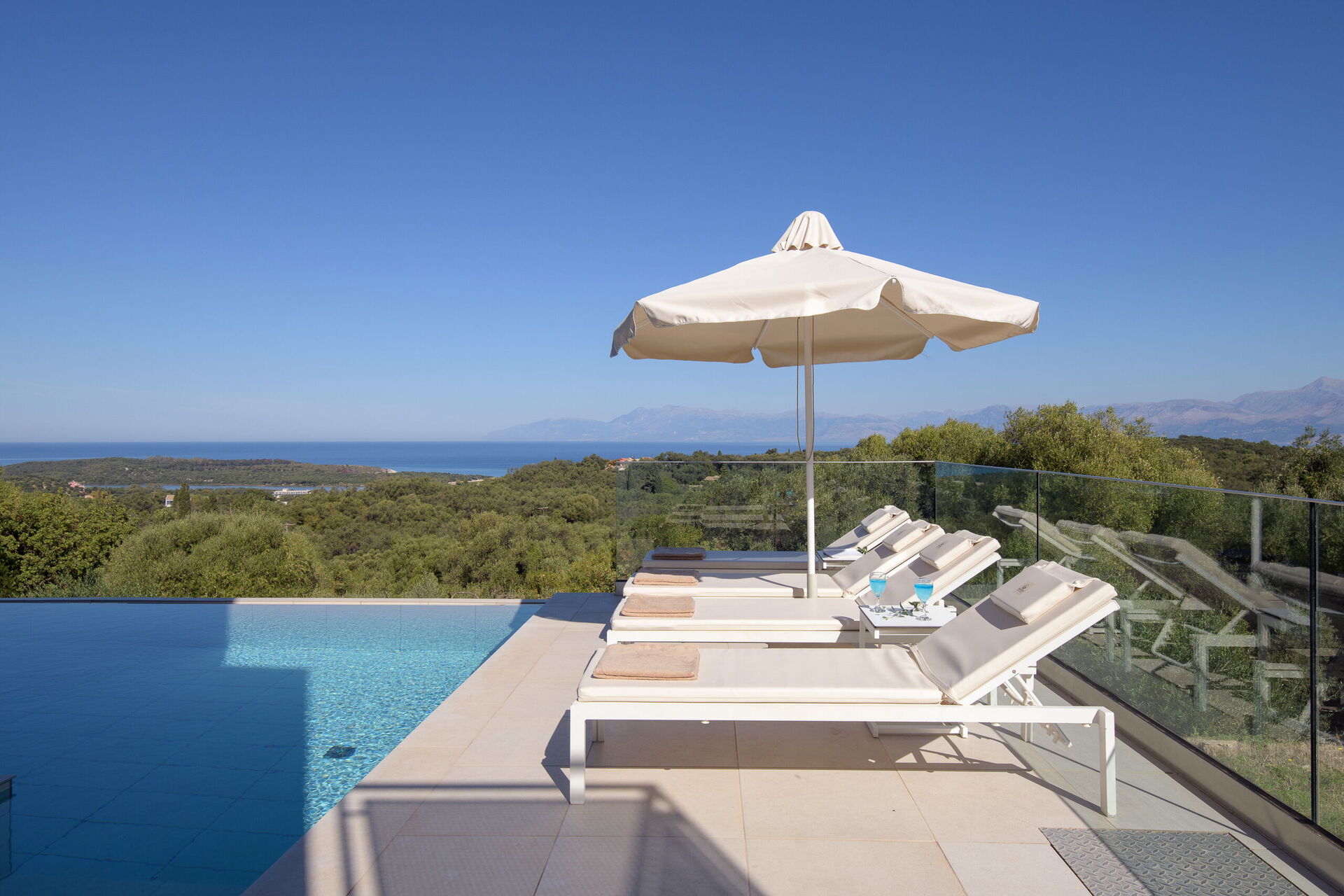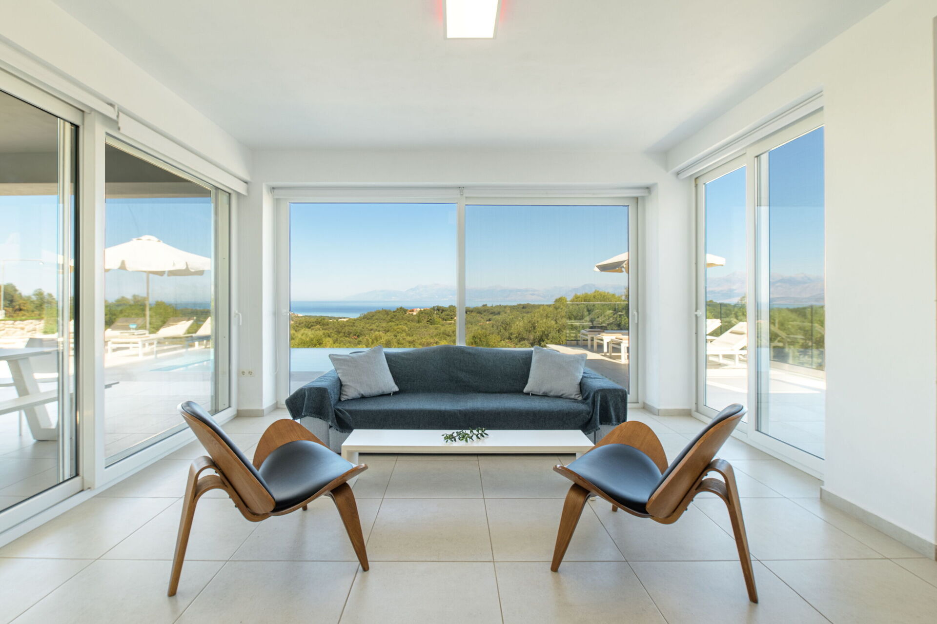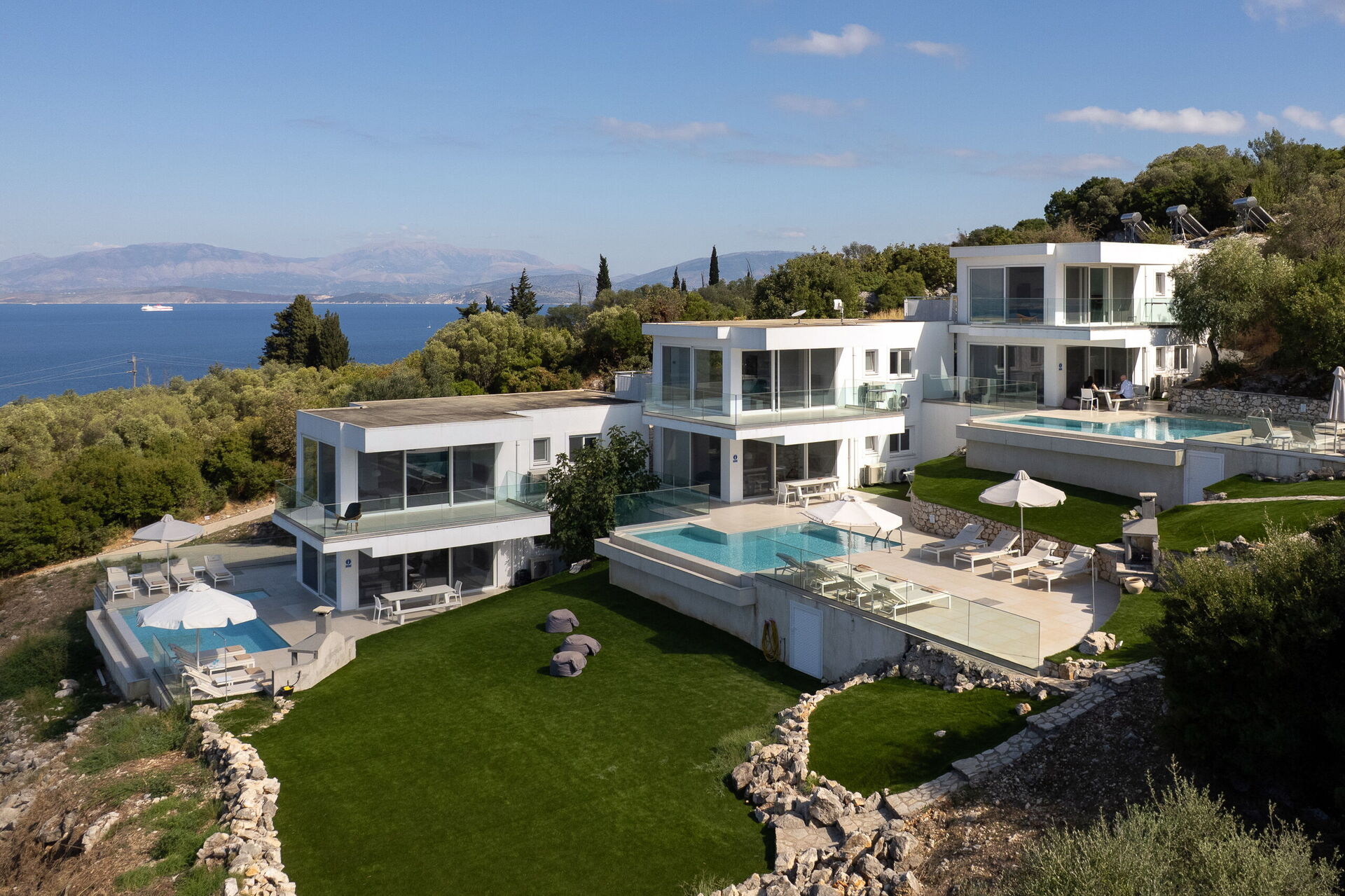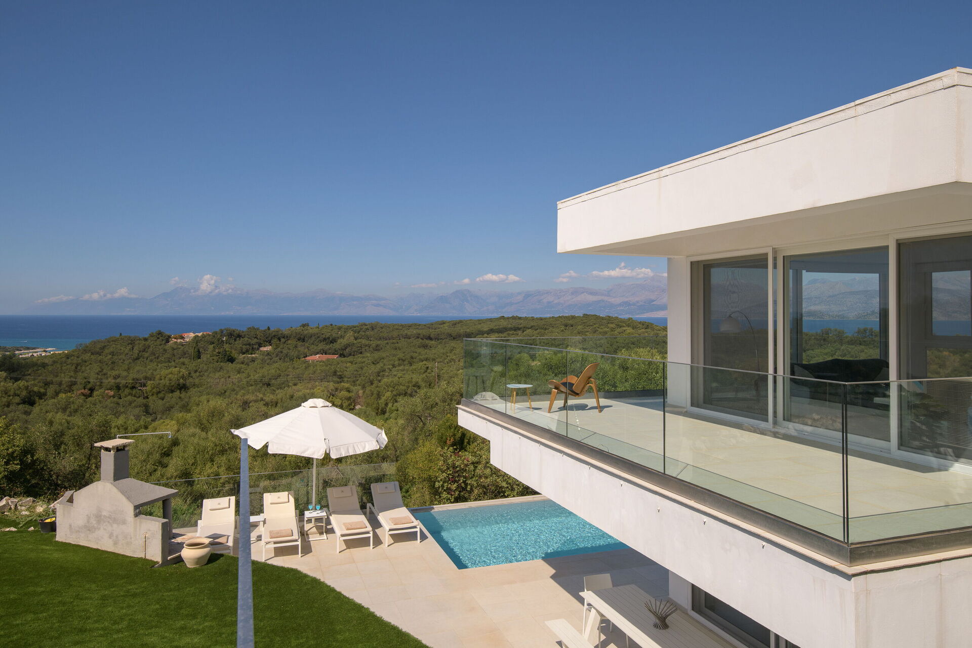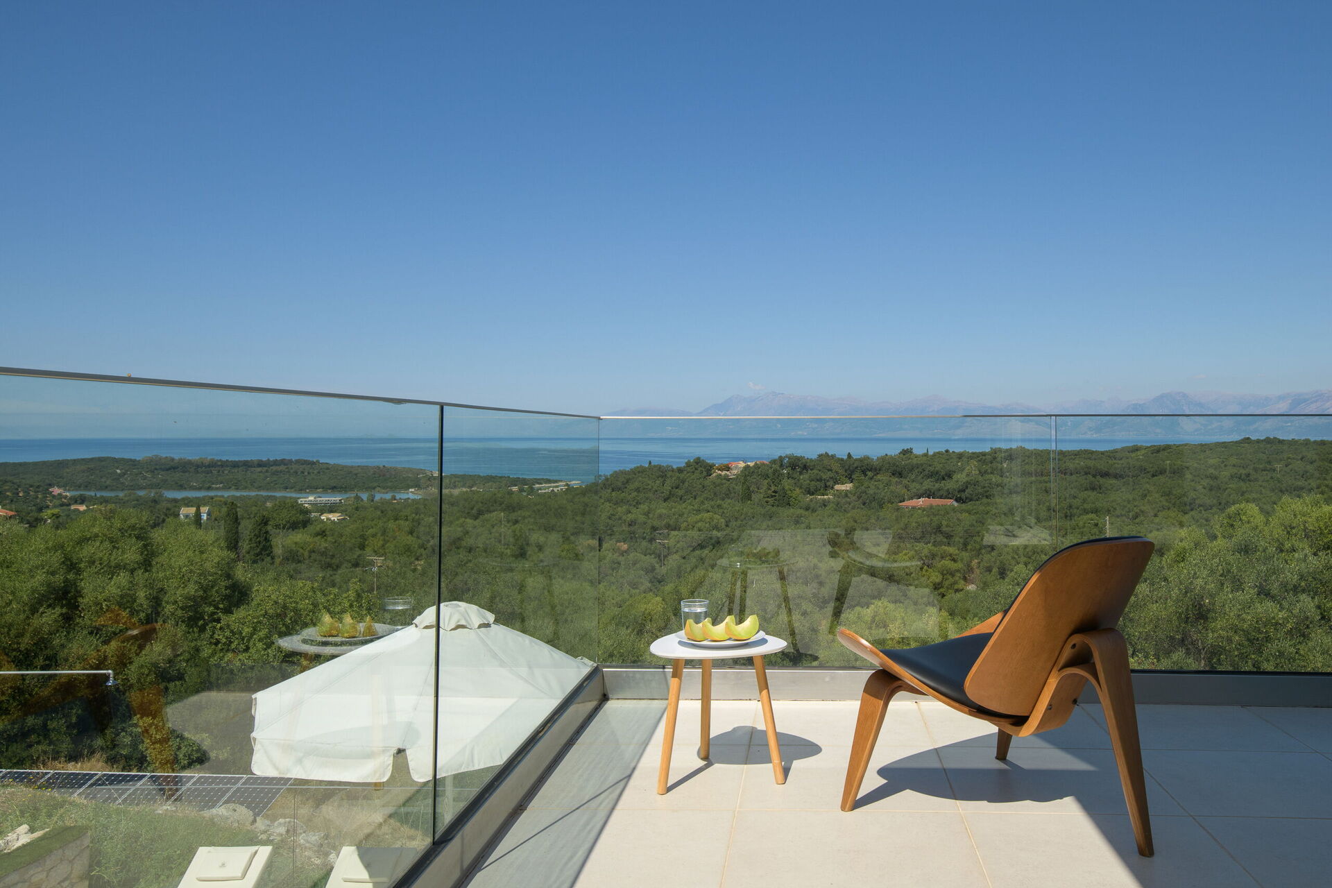 Inside, this villa is set over 2 floors connected via a side staircase. With huge patio doors, large windows, and designer furniture, Villa Naksika enjoys all the sun and light that Greece can offer. On the ground floor there is a spacious lounge (sofas, wi-fi, air-conditioning) with adjoining kitchen (fully equipped) as well as 2 bedrooms (both en-suite). One bedroom has a double bed + a sofa (that can be turned into a full size single sofa bed) while the other bedroom is a twin. The upper floor is identical to the lower one, except that the master bedroom has just a double bed and not an extra sofa bed. Extensive terraces on both floors provide magical views over the ionian Sea and Albanian coastline beyond.