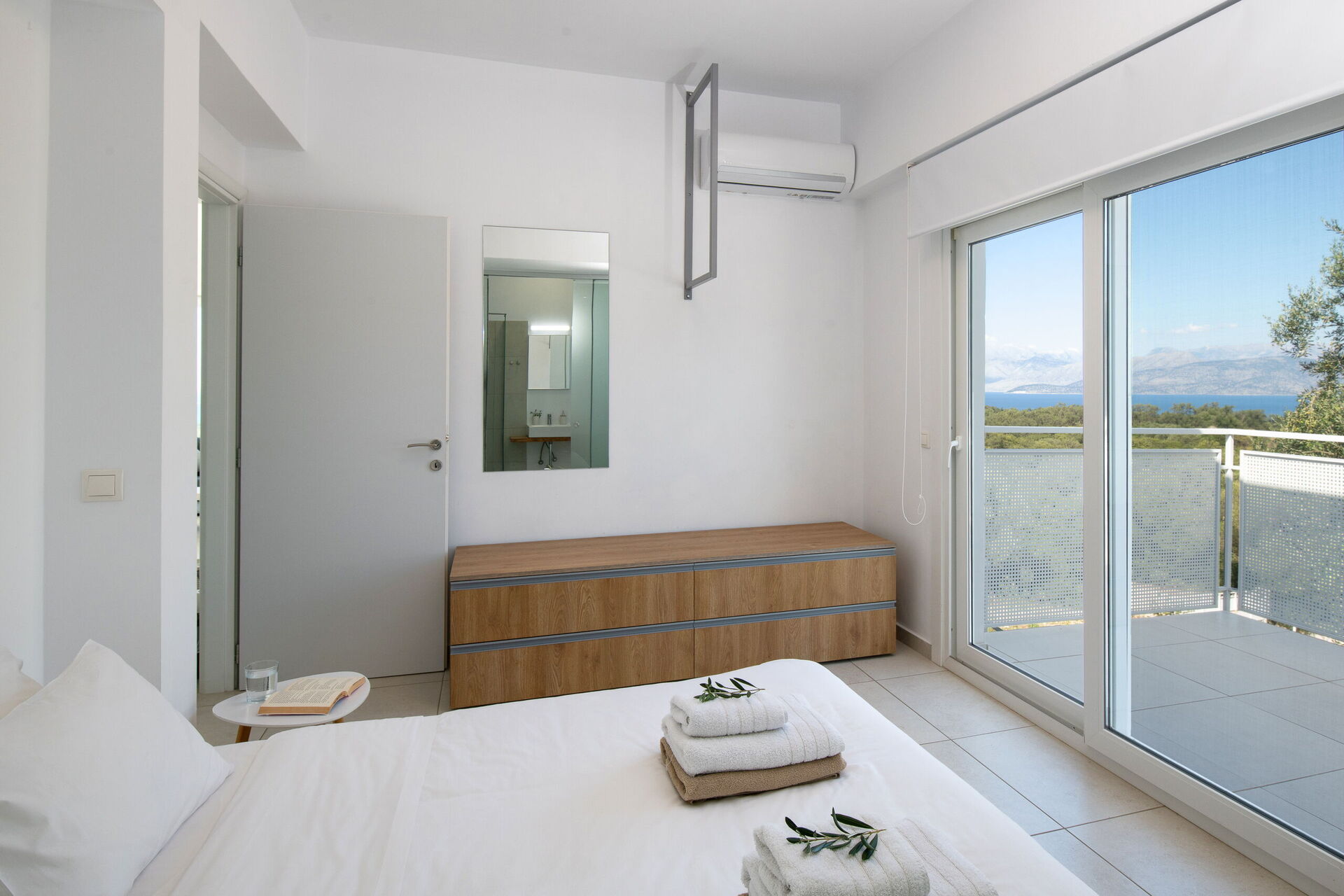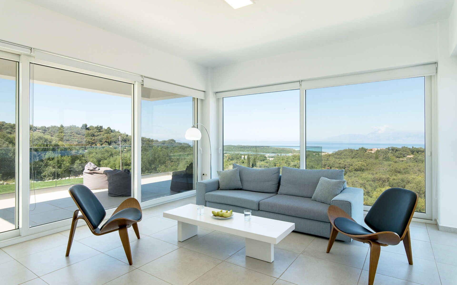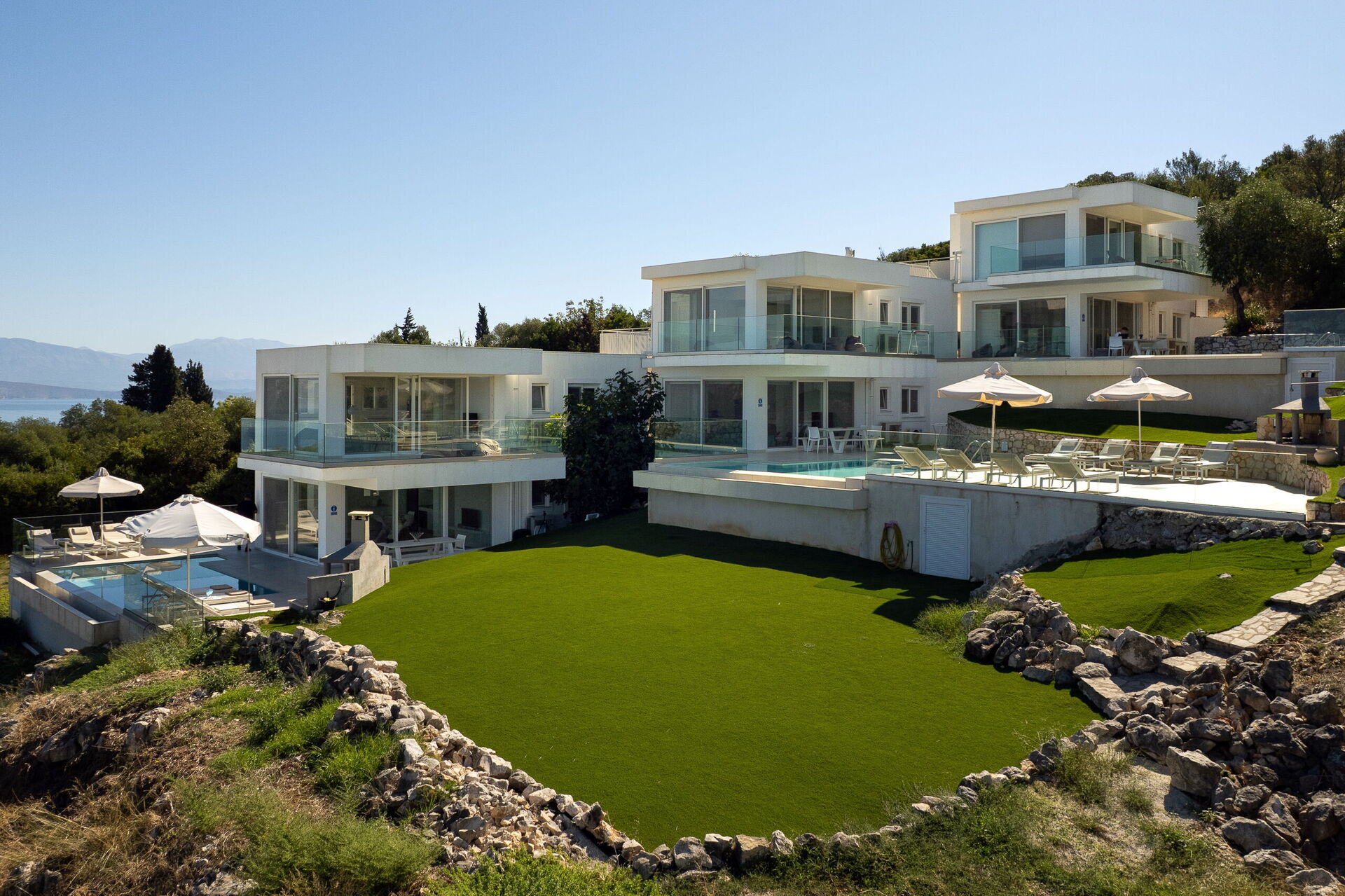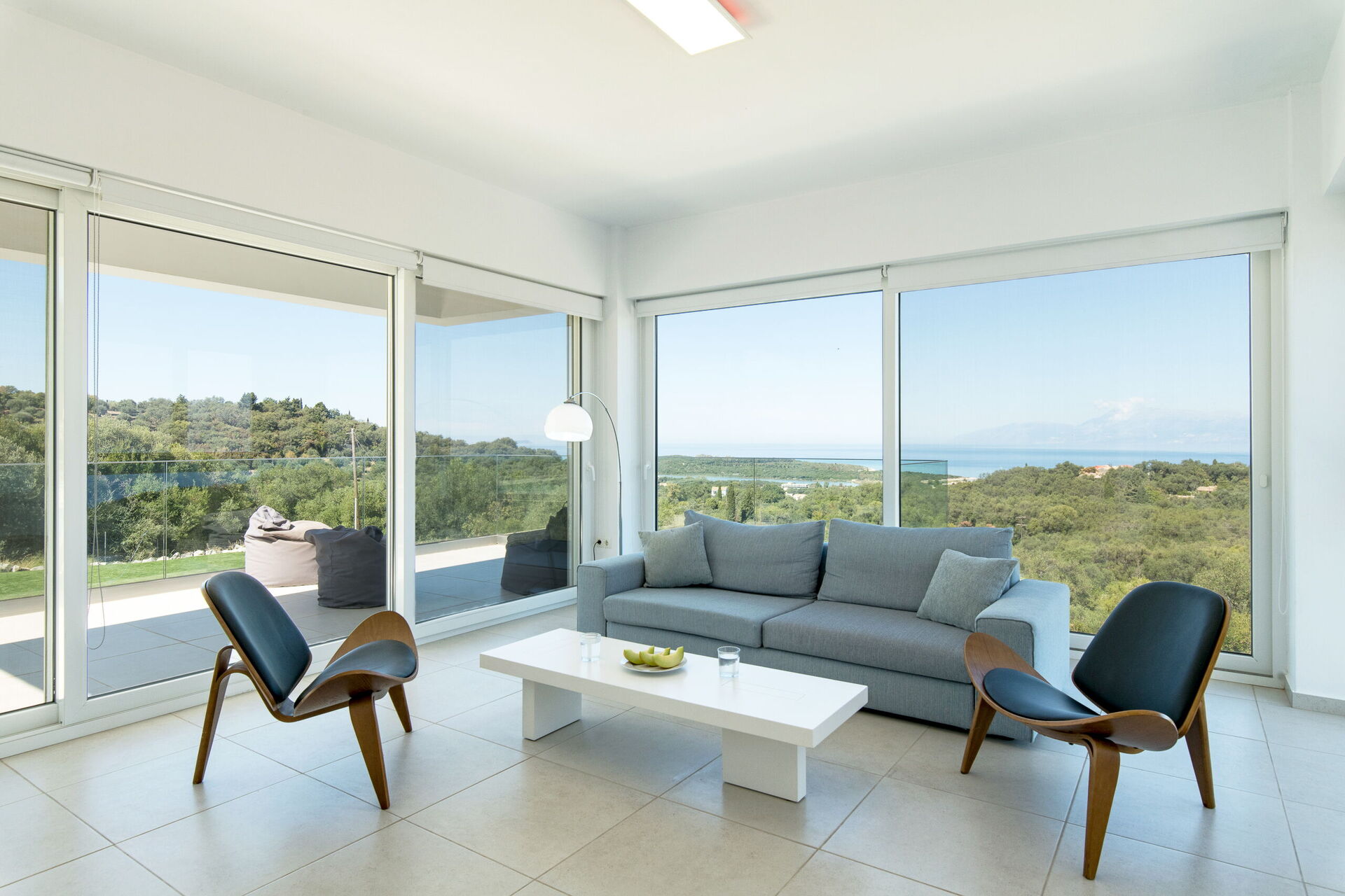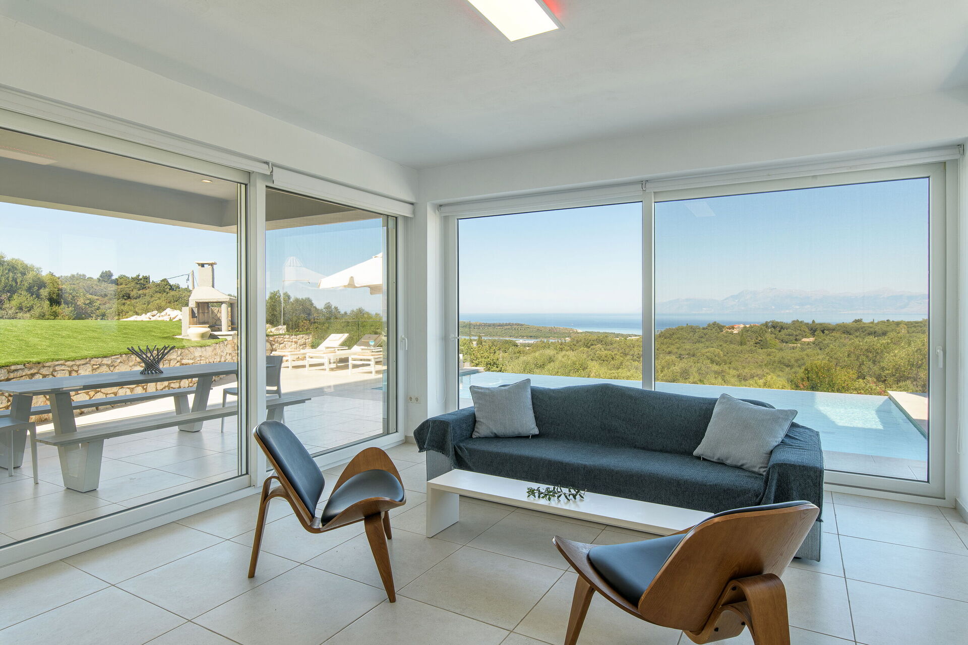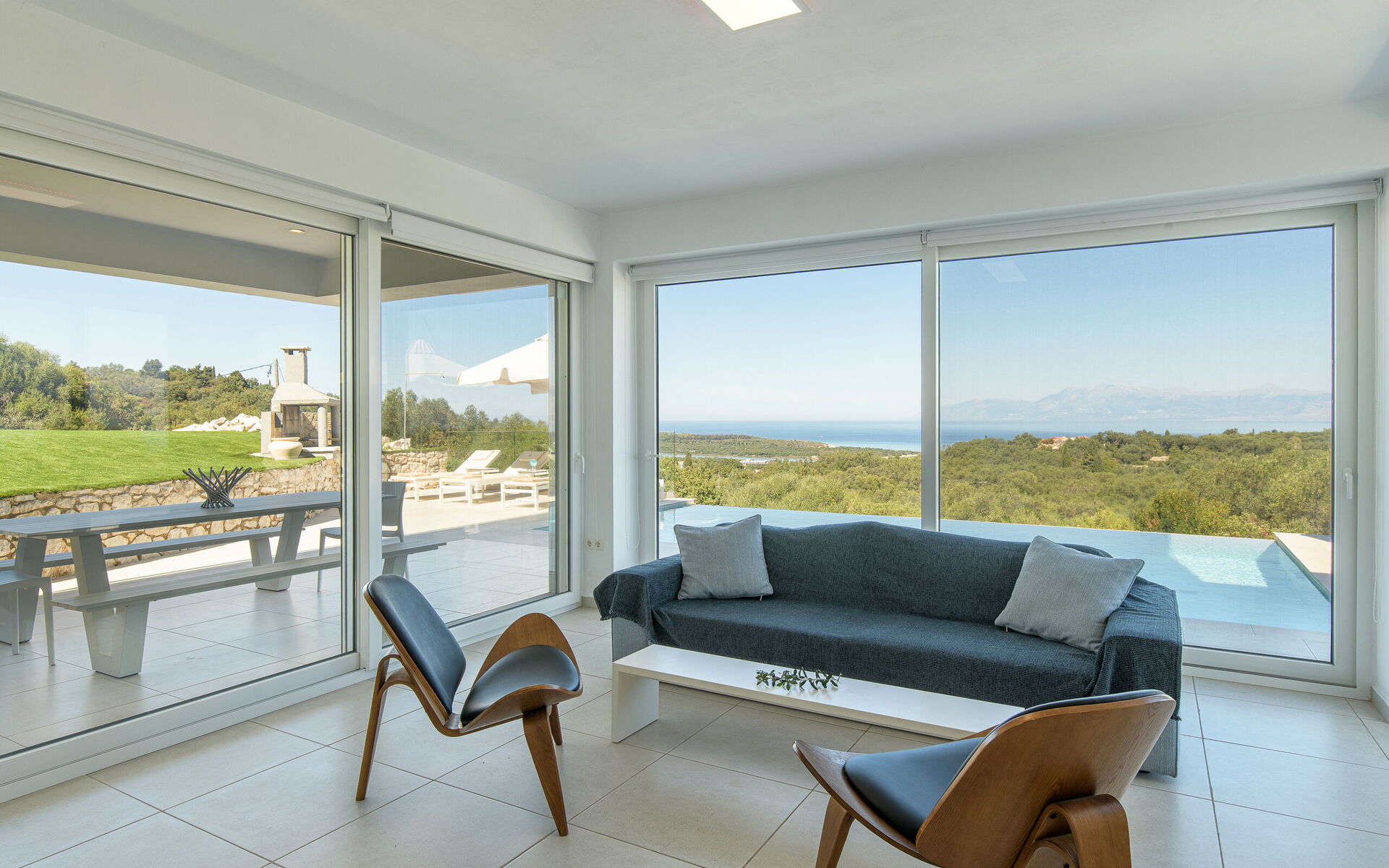Inside, this villa is set over 2 floors connected via a side staircase. With huge patio doors, large windows, and designer furniture, Villa Naksika enjoys all the sun and light that Greece can offer. On the ground floor there is a spacious lounge (sofas, wi-fi, air-conditioning) with adjoining kitchen (fully equipped) as well as 2 bedrooms (both en-suite). One bedroom has a double bed + a sofa (that can be turned into a full size single sofa bed) while the other bedroom is a twin. The upper floor is identical to the lower one, except that the master bedroom has just a double bed and not an extra sofa bed. Extensive terraces on both floors provide magical views over the ionian Sea and Albanian coastline beyond.