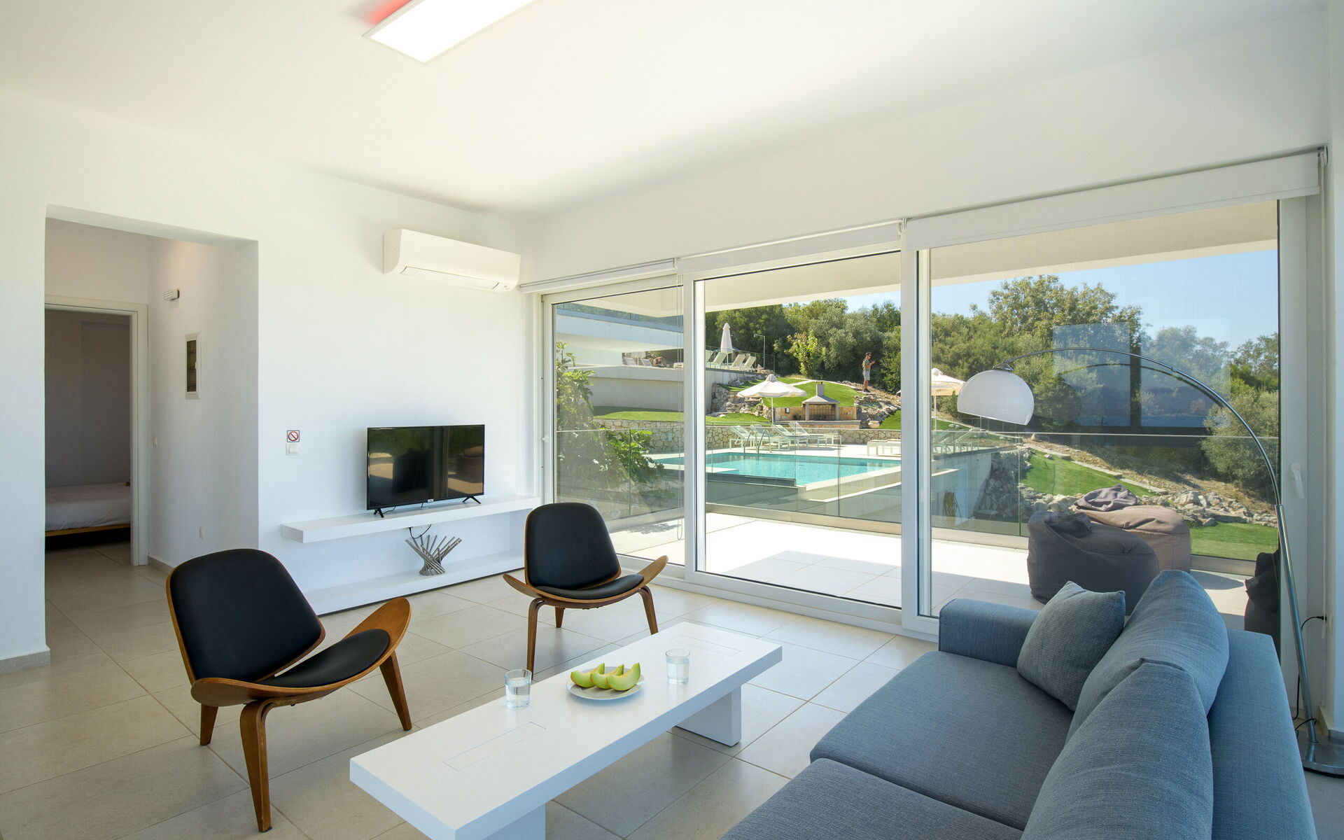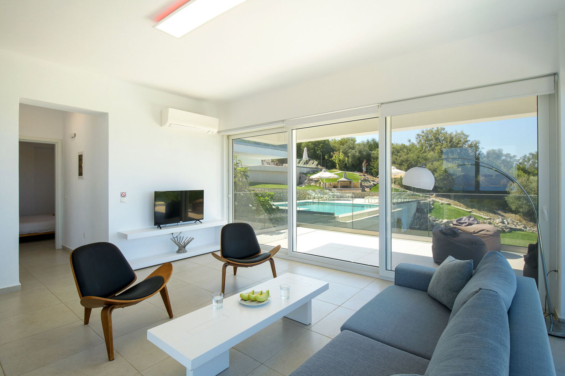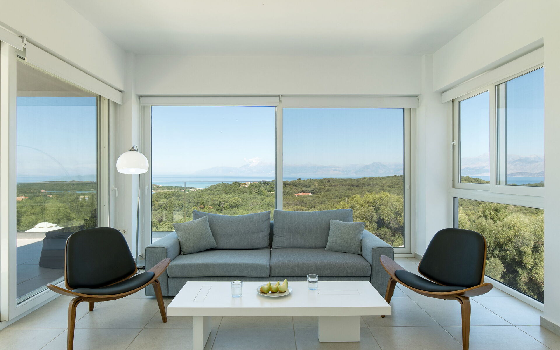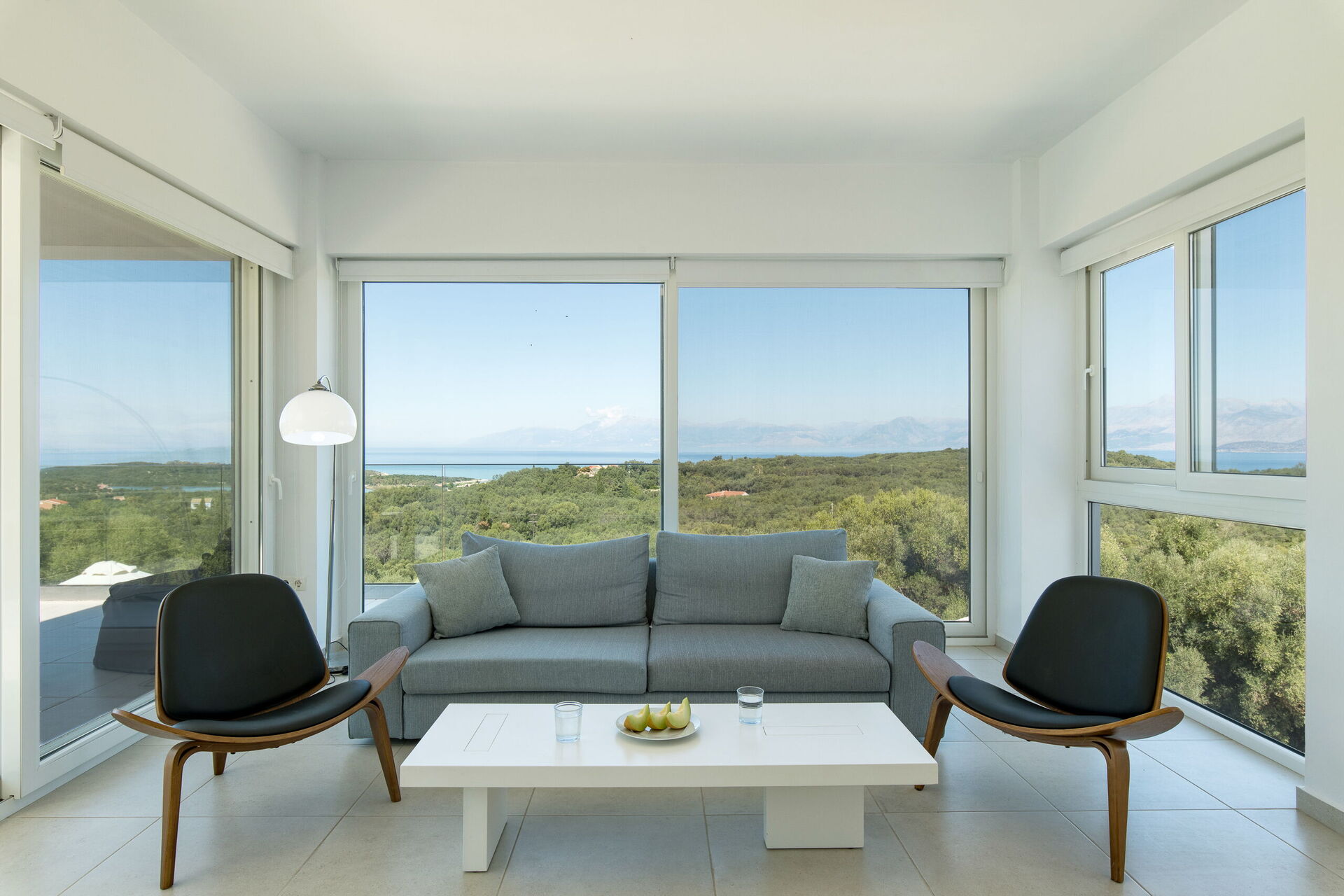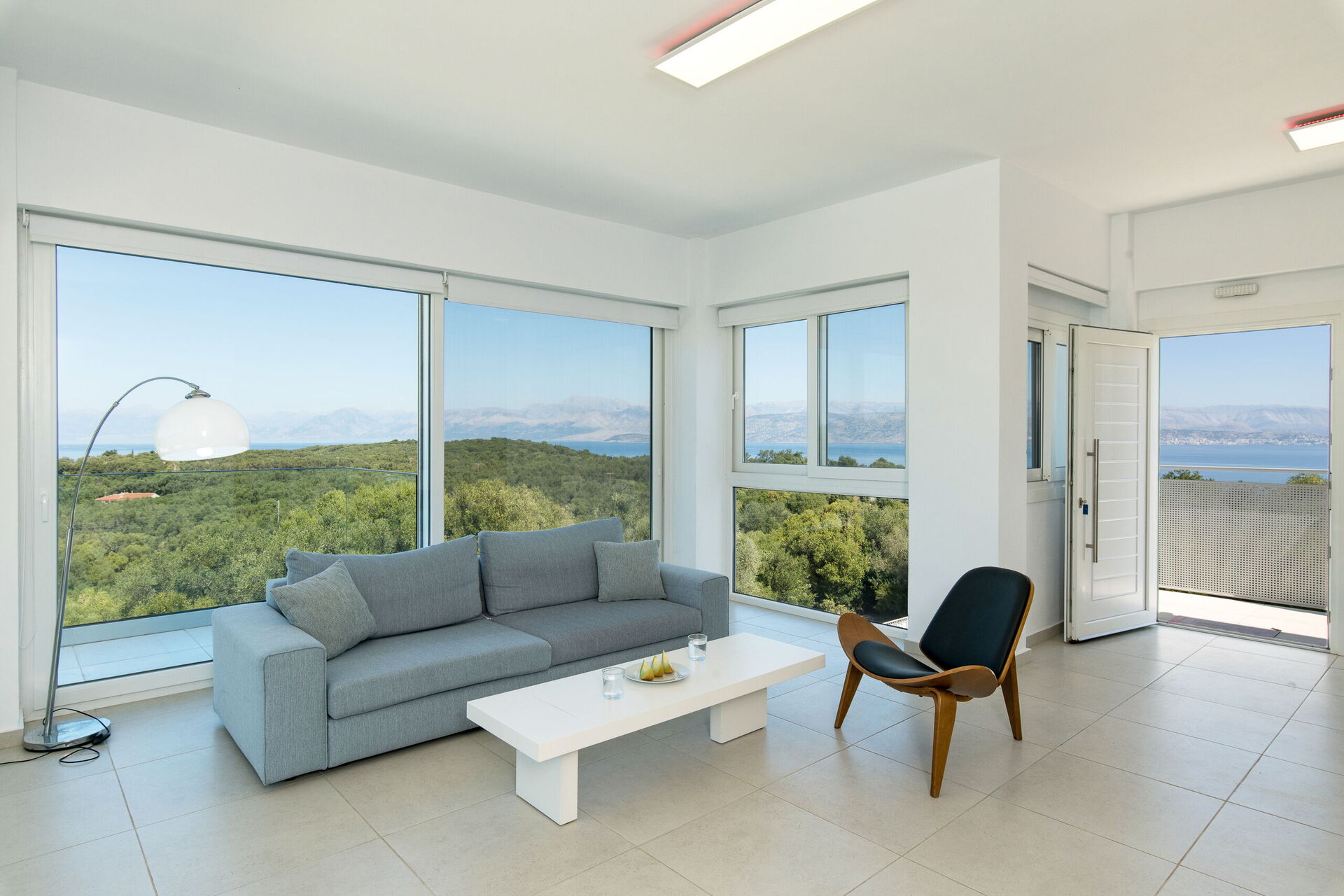 Inside, this villa is set over 2 floors connected via a side staircase. With huge patio doors, large windows, and designer furniture, Villa Naksika enjoys all the sun and light that Greece can offer. On the ground floor there is a spacious lounge (sofas, wi-fi, air-conditioning) with adjoining kitchen (fully equipped) as well as 2 bedrooms (both en-suite). One bedroom has a double bed + a sofa (that can be turned into a full size single sofa bed) while the other bedroom is a twin. The upper floor is identical to the lower one, except that the master bedroom has just a double bed and not an extra sofa bed. Extensive terraces on both floors provide magical views over the ionian Sea and Albanian coastline beyond.
