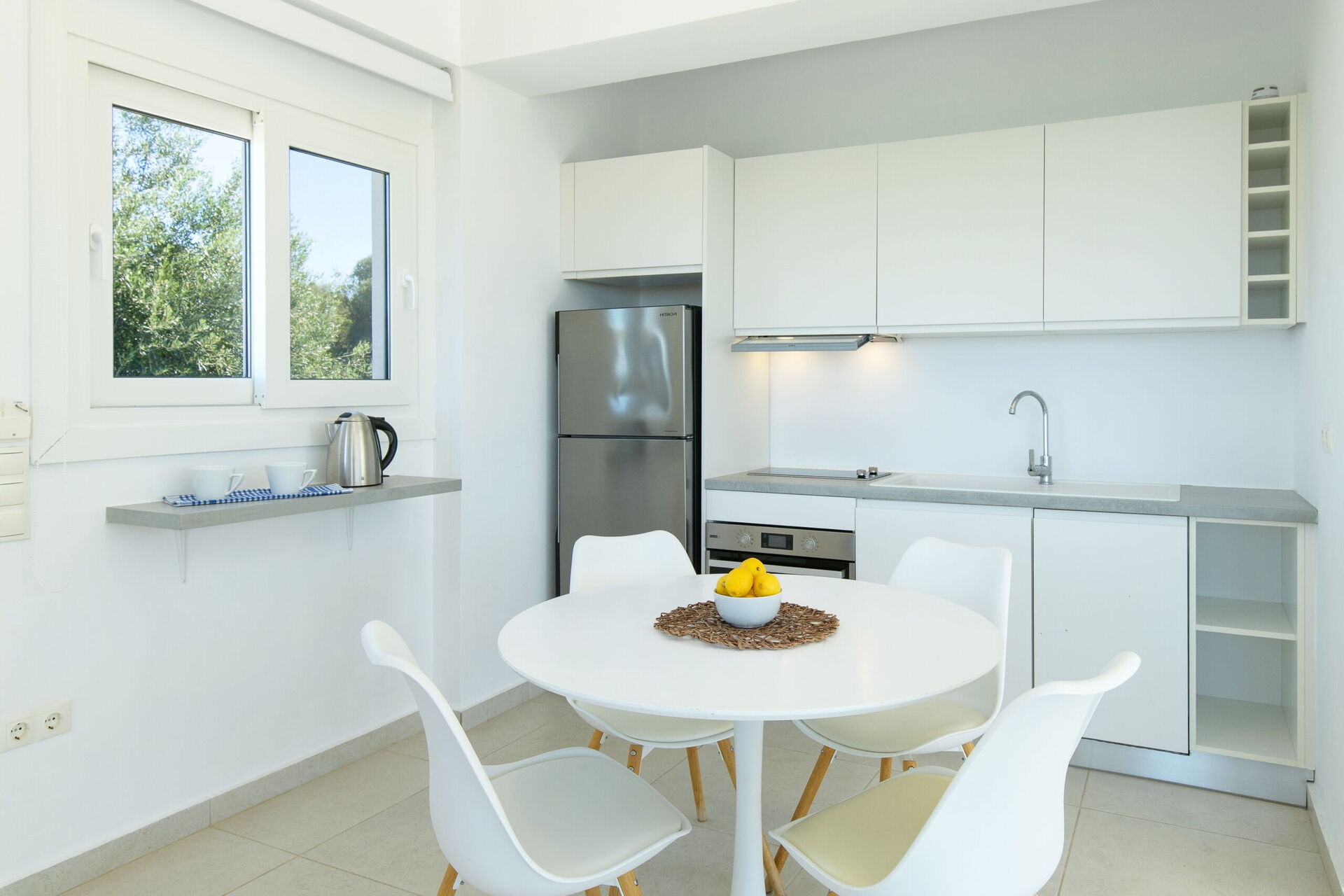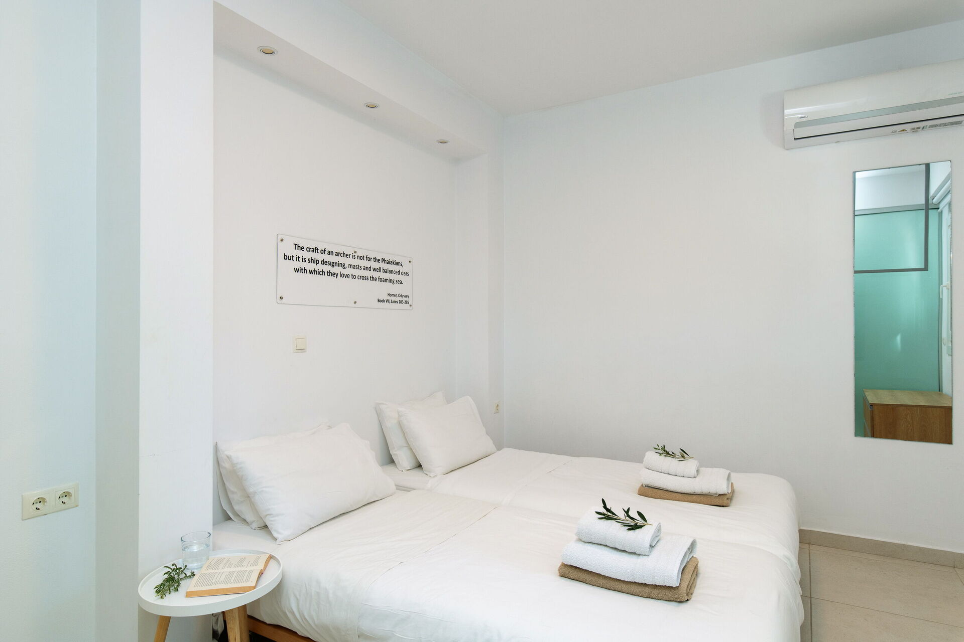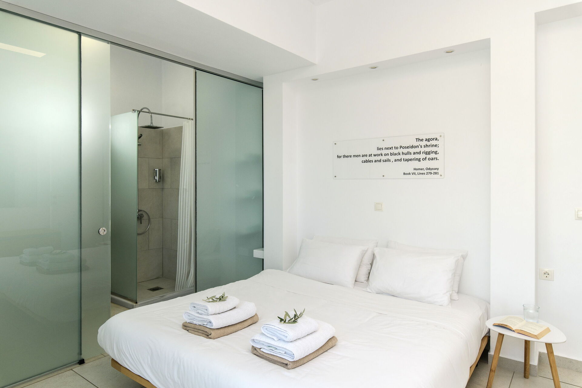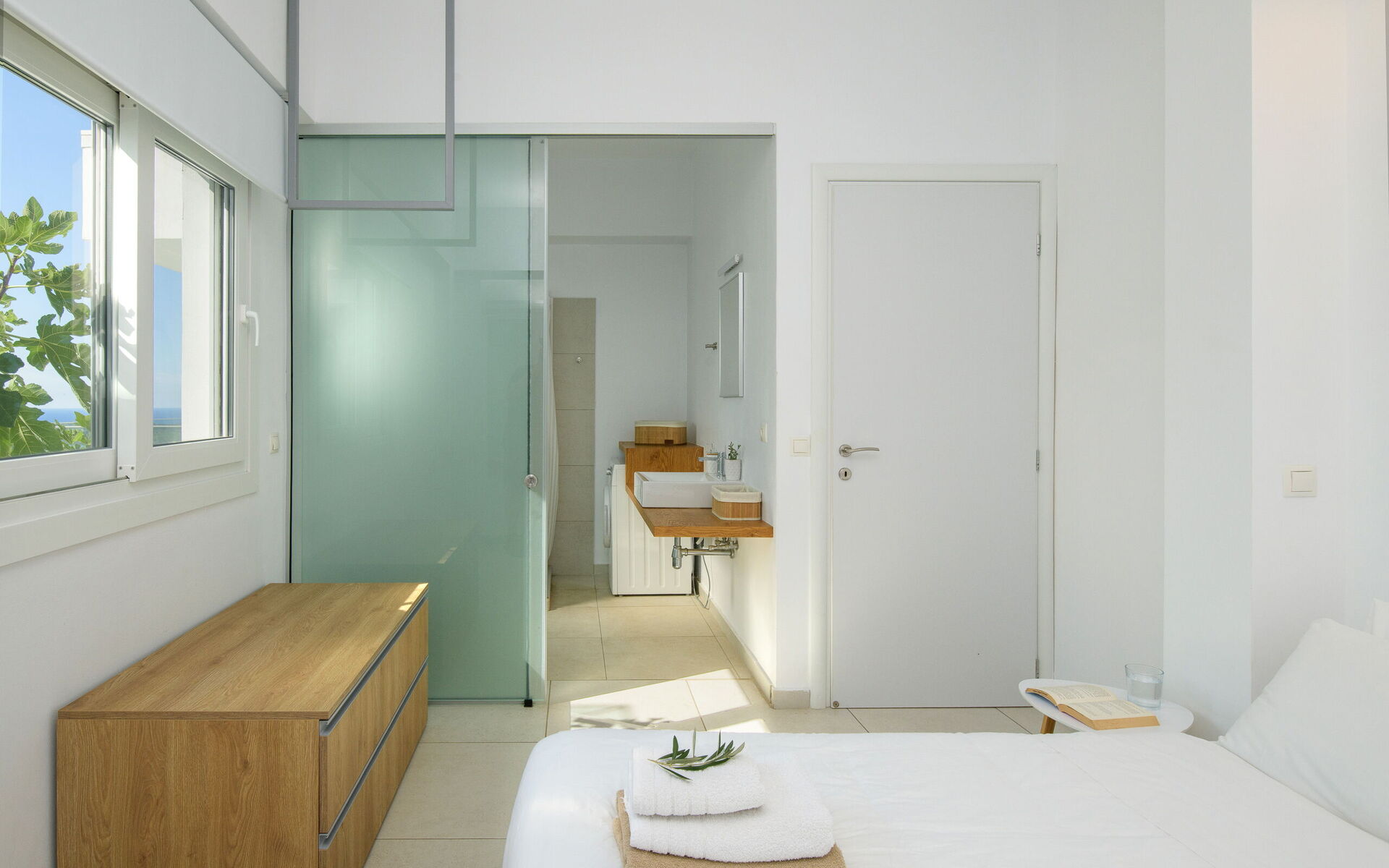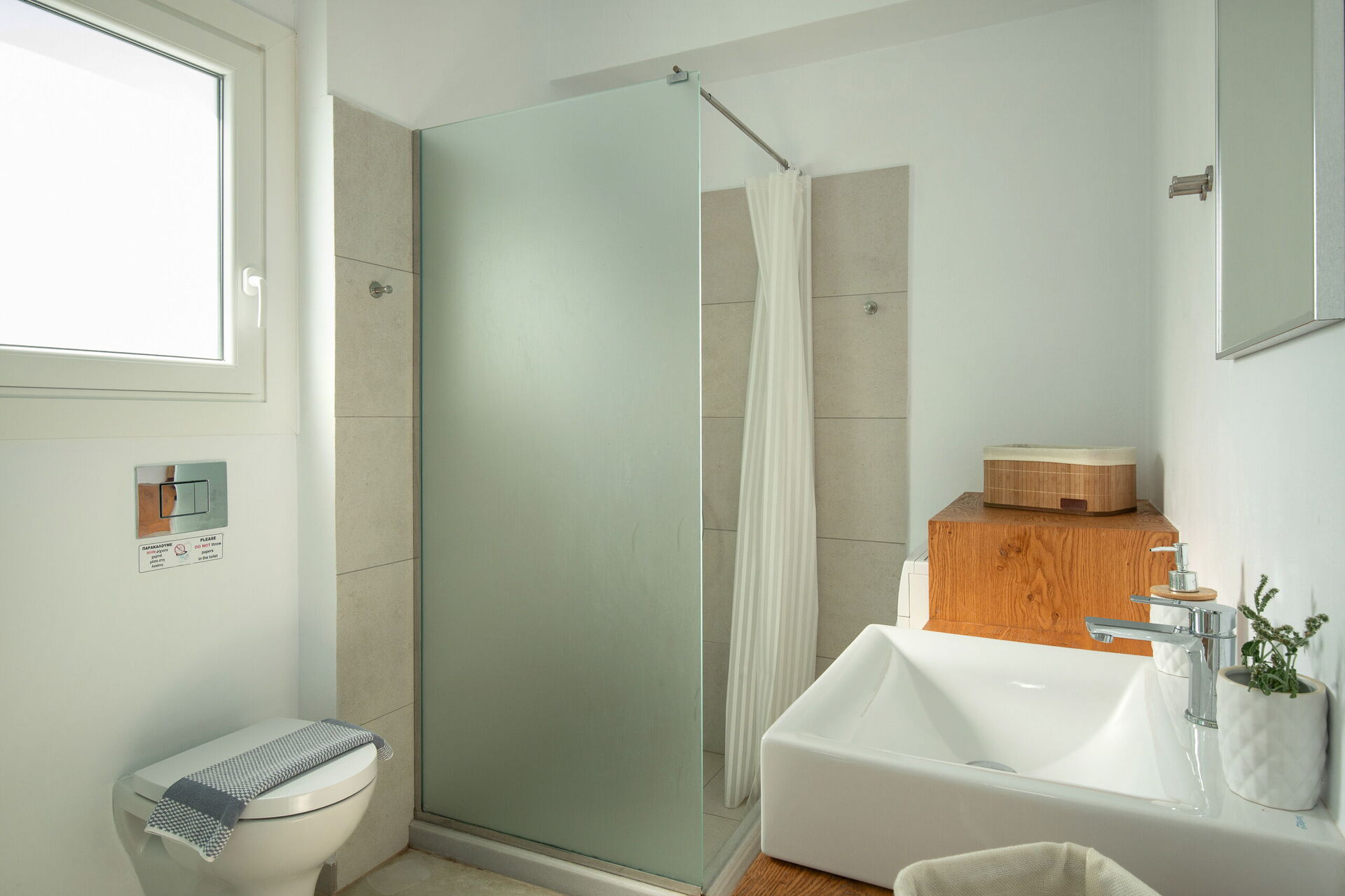 Inside, this villa is set over 2 floors connected via a side staircase. With huge patio doors, large windows, and designer furniture, Villa Naksika enjoys all the sun and light that Greece can offer. On the ground floor there is a spacious lounge (sofas, wi-fi, air-conditioning) with adjoining kitchen (fully equipped) as well as 2 bedrooms (both en-suite). One bedroom has a double bed + a sofa (that can be turned into a full size single sofa bed) while the other bedroom is a twin. The upper floor is identical to the lower one, except that the master bedroom has just a double bed and not an extra sofa bed. Extensive terraces on both floors provide magical views over the ionian Sea and Albanian coastline beyond.