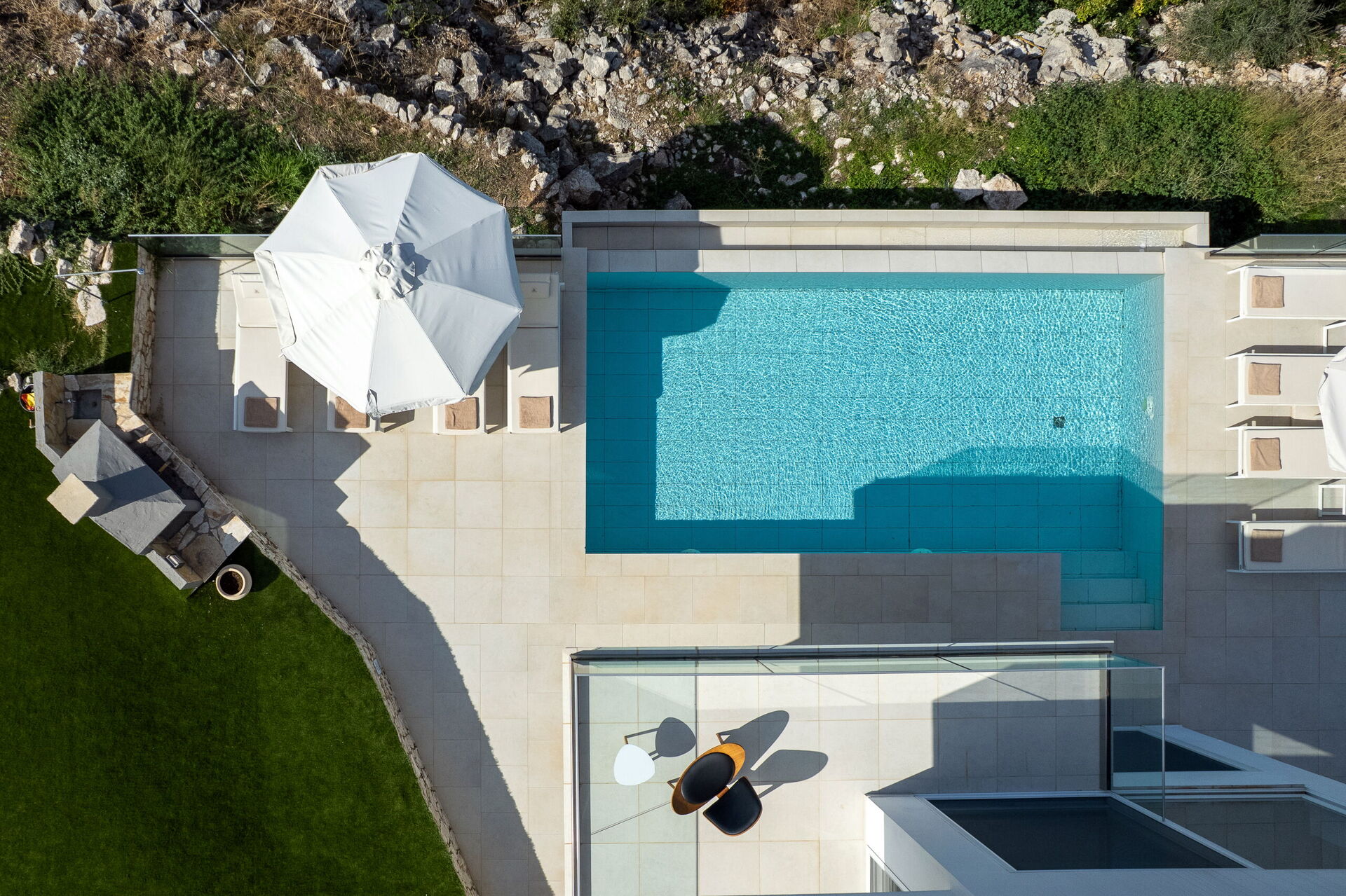 Outside, beautifully paved patios with sunbeds for all the guests enjoy all the most sensational views and the breeze of the coastline. A dining area for the guests together with barbecue is available, for delicious al-fresco meals. The private pool measures 7.5m x 4m (depth 1.5m) and is beautifully lit at night (access via Roman Steps). Thanks to its clever design, it provides excellent privacy and is the perfect spot to enjoy a refreshing dip or a drink while admiring the sun going down in the sea.