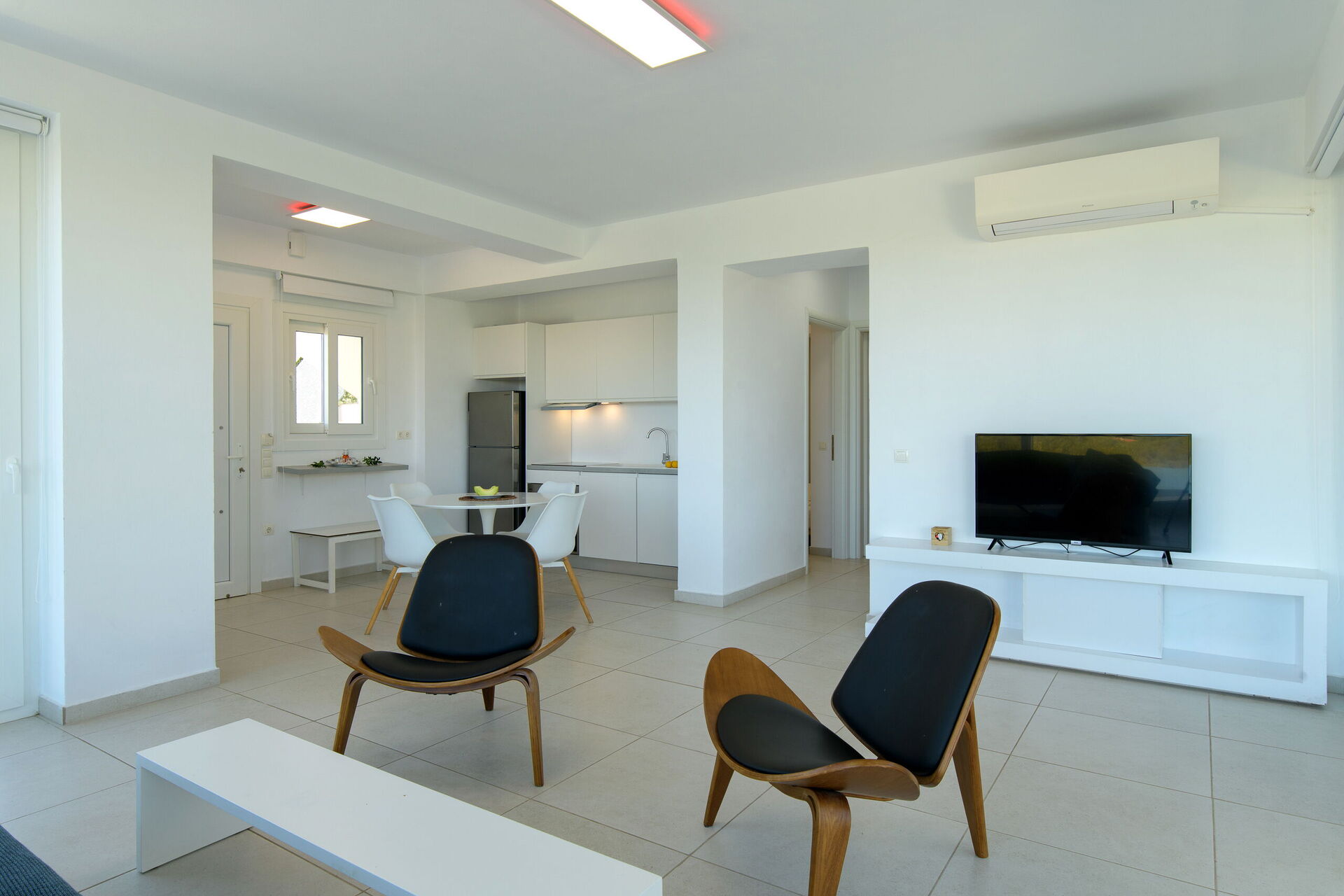 First floor (accessed via a side external staircase): master bedroom (double bed, air-conditioning) with en-suite bathroom with shower, twin bedroom (air-conditioning) with en-suite shower room, lounge with kitchenette, extensive terraces.