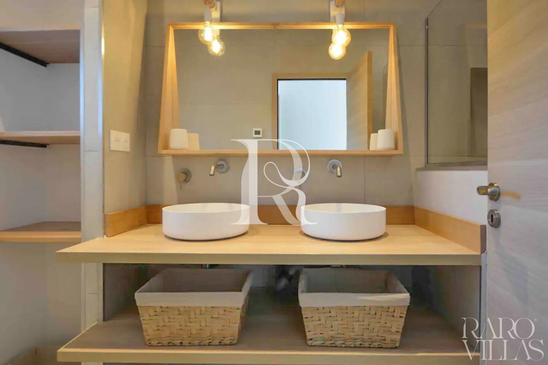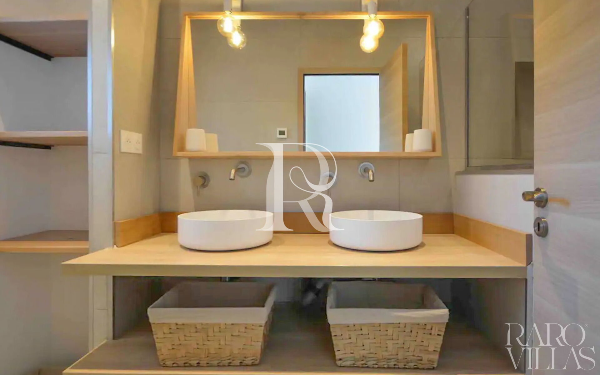 - un bagno condiviso per le camere da letto 3 e 4 con due lavandini, una cabina doccia, scaffali, asciugacapelli, asciugamano, finestra vista giardino.