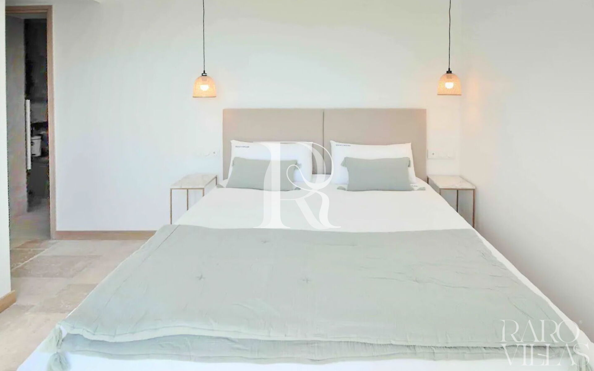 1 camera da letto con 1 letto 160x200, armadio, vista sulla piscina e sul mare, bagno privato con cabina doccia, 1 lavabo, scaffali, asciugamano, asciugacapelli e finestra.