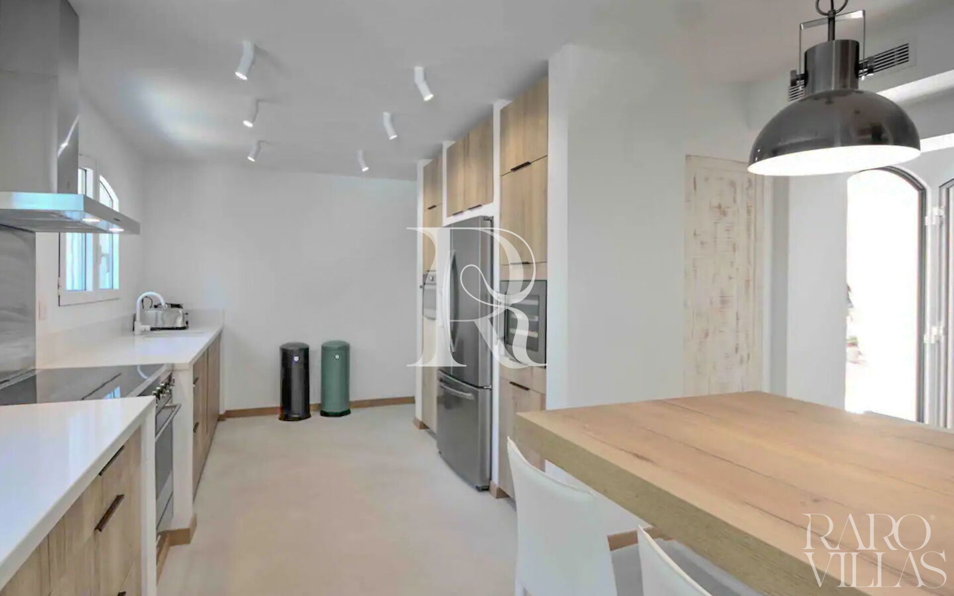 Ampia cucina attrezzata con tavolo da terra, frigorifero americano con dispenser di acqua e cubetti di ghiaccio, lavastoviglie, lavatrice, forno a microonde, zona cottura con 5 fornelli a induzione e forno, cappa, macchina per il caffè Nespresso, pane alla griglia, bollitore, frullatore, cantina di vini frigorifero, canovacci, bollitore, armadietto con asse da stiro e ferro da stiro con accesso alla terrazza attrezzata con tavolo e barbecue a gas.
