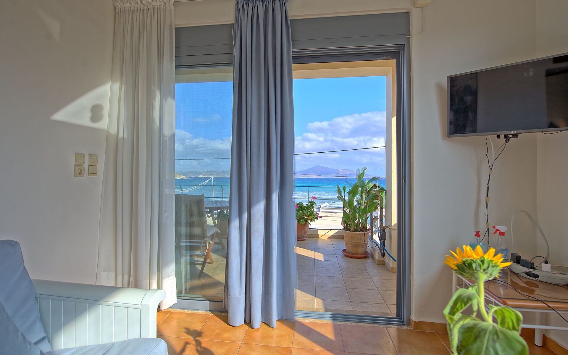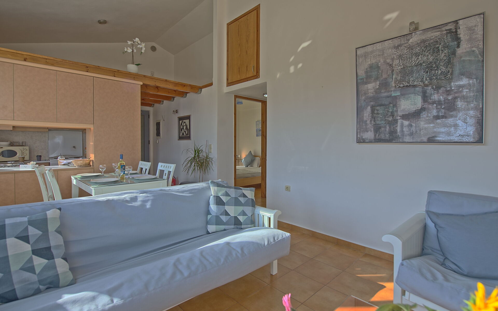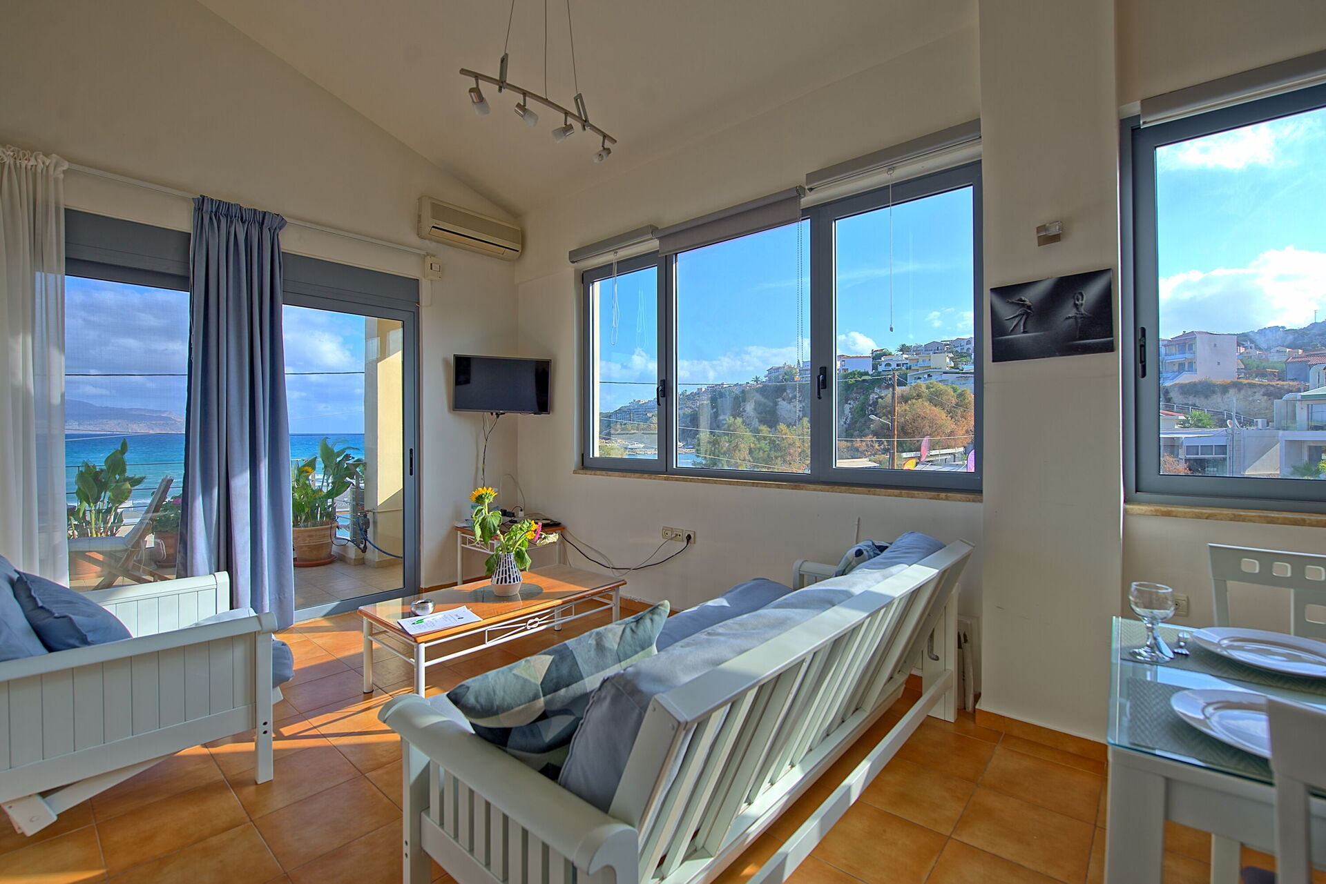 Primo piano: soggiorno (TV) con splendida vista sul mare, zona pranzo e angolo cottura (forno, freezer, lavastoviglie, microonde e macchina da caffè americano), accesso a panoramica terrazza attrezzata con tavolo, sedie e barbecue per mangiare all'aria aperta), camera matrimoniale, camera con 2 letti singoli, bagno con doccia, stanza esterna con lavatrice.